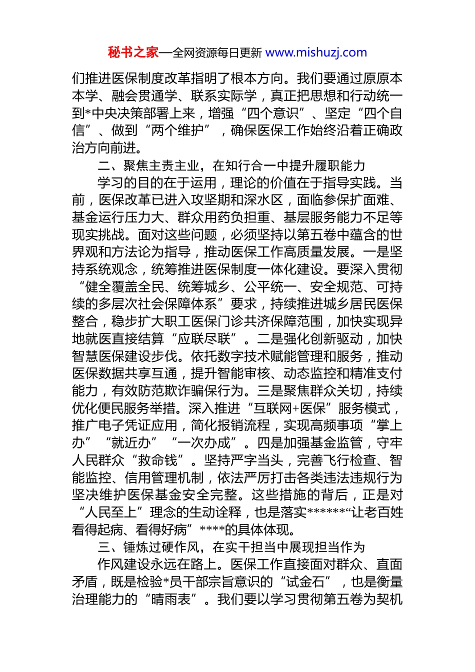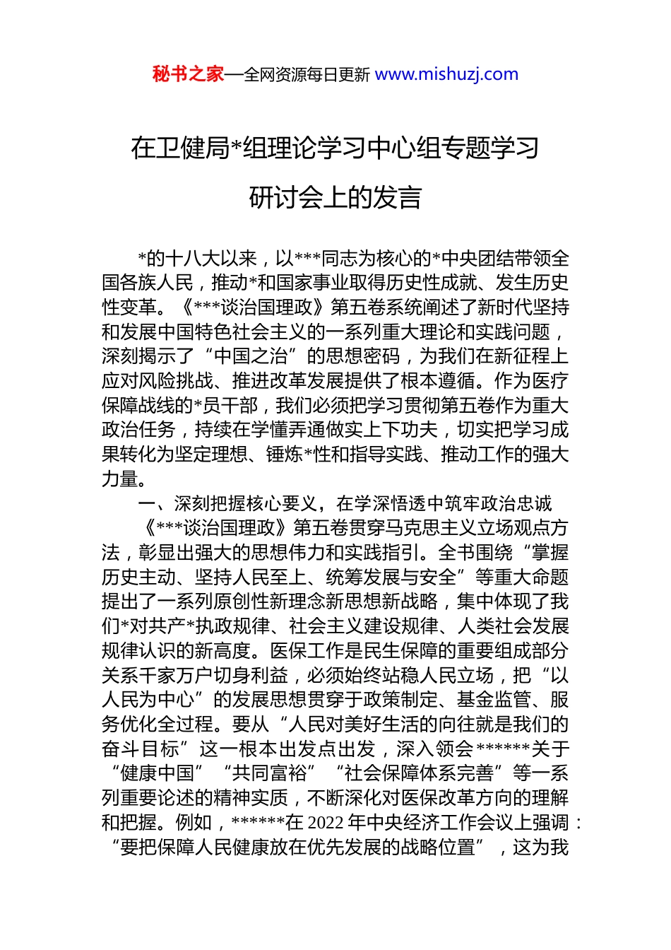 秘书之家—全网资源每日更新 www.mishuzj.com在卫健局*组理论学习中心组专题学习研讨会上的发言*的十八大以来,以***同志为核心的*中央团结带领全国各族人民,推动*和国家事业取得历史性成就、发生历史性变革。《***谈治国理政》第五卷系统阐述了新时代坚持和发展中国特色社会主义的一系列重大理论和实践问题,深刻揭示了“中国之治”的思想密码,为我们在新征程上应对风险挑战、推进改革发展提供了根本遵循。作为医疗保障战线的*员干部,我们必须把学习贯彻第五卷作为重大政治任务,持续在学懂弄通做实上下功夫,切实把学习成果转化为坚定理想、锤炼*性和指导实践、推动工作的强大力量。一、深刻把握核心要义,在学深悟透中筑牢政治忠诚《***谈治国理政》第五卷贯穿马克思主义立场观点方法,彰显出强大的思想伟力和实践指引。全书围绕“掌握历史主动、坚持人民至上、统筹发展与安全”等重大命题提出了一系列原创性新理念新思想新战略,集中体现了我们*对共产*执政规律、社会主义建设规律、人类社会发展规律认识的新高度。医保工作是民生保障的重要组成部分关系千家万户切身利益,必须始终站稳人民立场,把“以人民为中心”的发展思想贯穿于政策制定、基金监管、服务优化全过程。要从“人民对美好生活的向往就是我们的奋斗目标”这一根本出发点出发,深入领会 ******关于“健康中国”“共同富裕”“社会保障体系完善”等一系列重要论述的精神实质,不断深化对医保改革方向的理解和把握。例如,******在 2022 年中央经济工作会议上强调:“要把保障人民健康放在优先发展的战略位置”,这为我秘书之家—全网资源每日更新 www.mishuzj.com们推进医保制度改革指明了根本方向。我们要通过原原本本学、融会贯通学、联系实际学,真正把思想和行动统一到*中央决策部署上来,增强“四个意识”、坚定“四个自信”、做到“两个维护”,确保医保工作始终沿着正确政治方向前进。二、聚焦主责主业,在知行合一中提升履职能力学习的目的在于运用,理论的价值在于指导实践。当前,医保改革已进入攻坚期和深水区,面临参保扩面难、基金运行压力大、群众用药负担重、基层服务能力不足等现实挑战。面对这些问题,必须坚持以第五卷中蕴含的世界观和方法论为指导,推动医保工作高质量发展。一是坚持系统观念,统筹推进医保制度一体化建设。要深入贯彻“健全覆盖全民、统筹城乡、公平统一、安全规范、可持续的多层次社会保障体系”要求,持续推进城乡居民医保整合,稳步扩大职工医保门诊共济保障范围,加快实现异地就医直接结算“应联尽联”。二是强化创新驱动,加快智慧医保建设步伐。依托数字技术赋能管理和服务,推动医保数据共享互通,提升智能审核、动态监控和精准支付能力,有效防范欺诈骗保行为。三是聚焦群众关切,持续优化便民服务举措。深入推进“互联网+医保”服务模式,推广电子凭证应用,简化报销流程,实现高频事项“掌上办”“就近办”“一次办成”。四是加强基金监管,守牢人民群众“救命钱”。坚持严字当头,完善飞行检查、智能监控、信用管理机制,依法严厉打击各类违法违规行为坚决维护医保基金安全完整。这些措施的背后,正是对“人民至上”理念的生动诠释,也是落实******“让老百姓看得起病、看得好病”****的具体体现。三、锤炼过硬作风,在实干担当中展现担当作为作风建设永远在路上。医保工作直接面对群众、直面矛盾,既是检验*员干部宗旨意识的“试金石”,也是衡量治理能力的“晴雨表”。我们要以学习贯彻第五卷为契机秘书之家—全网资源每日更新 www.mishuzj.com大力弘扬求真务实、真抓实干的工作作风,坚决反对形式主义、官僚主义。一是在调查研究上下功夫。坚持“四不两直”工作法,深入医院、药店、社区一线,听真话、察实情,了解群众真实诉求,找准政策落地的“最后一公里”堵点难点。二是在破解难题上见真章。针对部分地方存在“有药无价”“报销周期长”等问题,要敢于动真碰硬,主动协调卫健、药监等部门协同发力,推动药品集采常态化、制度化,缩短报销审批时限,让群众办事更顺心三是在服务群众上求实效。持续开展“我为群众办实事”实践活动,建立“群众点...