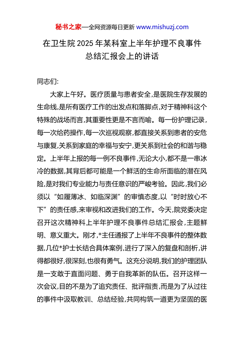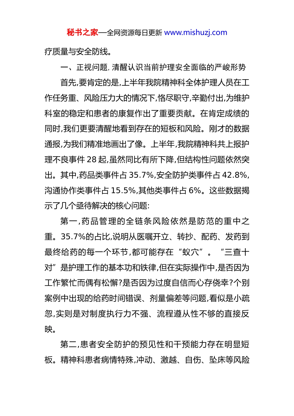 秘书之家—全网资源每日更新 www.mishuzj.com在卫生院 2025 年某科室上半年护理不良事件总结汇报会上的讲话 同志们:大家上午好。医疗质量与患者安全,是医院生存发展的生命线,是所有医疗工作的出发点和落脚点,对于精神科这个特殊的战场而言,其重要性更是不言而喻。每一份护理记录,每一次给药操作,每一次巡视观察,都直接关系到患者的安危与康复,关系到家庭的幸福与安宁,更关系到社会的和谐与稳定。上半年上报的每一例不良事件,无论大小,都不是一串冰冷的数据,其背后都可能是一个鲜活的生命所面临的潜在风险,是对我们专业能力与责任意识的严峻考验。因此,我们必须以“如履薄冰、如临深渊”的审慎态度,以“时时放心不下”的责任感,来审视和改进我们的工作。今天,院党委决定召开这次精神科上半年护理不良事件总结汇报会,主题鲜明、意义重大。刚才,*主任通报了上半年不良事件的整体数据,几位*护士长结合具体案例,进行了深入的复盘和剖析,讲得都很好,很深刻,也很有勇气。这充分说明,我们的护理团队是一支敢于直面问题、勇于自我革新的队伍。召开这样一次会议,目的不是为了追究责任、批评指责,而是为了从过往的事件中汲取教训、总结经验,共同构筑一道更为坚固的医秘书之家—全网资源每日更新 www.mishuzj.com疗质量与安全防线。一、正视问题,清醒认识当前护理安全面临的严峻形势首先,要肯定的是,上半年我院精神科全体护理人员在工作任务重、风险压力大的情况下,恪尽职守,辛勤付出,为维护科室的稳定和患者的康复作出了重要贡献。在肯定成绩的同时,我们更要清醒地看到存在的短板和风险。刚才的数据通报,为我们精准地画出了像。上半年,我院精神科共上报护理不良事件 28 起,虽然同比有所下降,但结构性问题依然突出。其中,药品类事件占 35.7%,安全防护类事件占 42.8%,沟通协作类事件占 15.5%,其他类事件占 6%。这些数据揭示了几个亟待解决的核心问题:第一,药品管理的全链条风险依然是防范的重中之重。35.7%的占比,说明从医嘱开立、转抄、配药、发药到最终给药的每一个环节,都可能存在“蚁穴”。“三查十对”是护理工作的基本功和铁律,但在实际操作中,是否因为工作繁忙而偶有松懈?是否因为过度自信而心存侥幸?个别案例中出现的给药时间错误、剂量偏差等问题,看似是小疏忽,实则是对制度执行力不强、流程遵从性不够的直接反映。第二,患者安全防护的预见性和干预能力存在明显短板。精神科患者病情特殊,冲动、激越、自伤、坠床等风险秘书之家—全网资源每日更新 www.mishuzj.com远高于其他科室.42.8%的安全防护类事件占比,警示我们在风险评估的精准度、预防措施的有效性以及应急处置的敏捷性上,还有很大的提升空间。我们的风险评估是否真正做到了动态化、个体化?对于高风险患者的巡视频次、约束保护、环境管理等措施是否百分之百落实到位?部分坠床、跌倒事件的发生,暴露了我们在细节管理和预见性护理上的不足。第 三 , 跨 岗 位 、 跨 班 次 的 协 同 作 战 能 力 有 待 加强。15.5%的沟通协作类事件,集中体现在交接班信息不全、医护沟通不畅、对患者异常行为变化的传递不及时等方面。护理工作是一个环环相扣的链条,任何一个环节的信息“断点”,都可能成为安全隐患的“燃点”。这要求我们必须打破部门壁垒和班次隔阂,建立一个信息无缝流转、责任无缝衔接的高效协作体系。这些问题的产生,原因固然是多方面的,有个案的特殊性,也有环境的复杂性,但根子还在于我们的思想认识、制度执行和能力建设。我们必须敢于揭开伤疤,深挖根源,才能对症下药,实现真正的提升。二、深挖根源,精准剖析制约护理质量提升的核心症结表象是问题的窗口,根源才是解决问题的钥匙。透过上半年发生的不良事件,我们必须进行一次深刻的自我审视,找秘书之家—全网资源每日更新 www.mishuzj.com准制约护理质量与安全水平提升的症结所在。(一)思想深处的“懈怠点”——安全意识未能时刻“满格”。安全工作,功夫在平时,关键在意识。在日复一日、年复一年的高强度工作中,部分同志是否产生了职业倦怠和思维惯性?认为某些流程早已驾轻就熟,不会出问题;认为某些患者病情平稳,可以放松警惕。这种“大概率思维...
