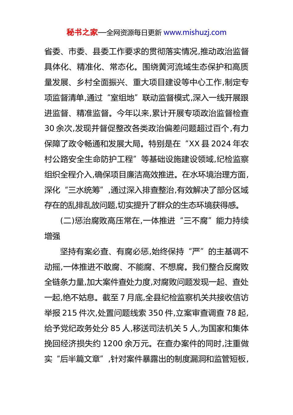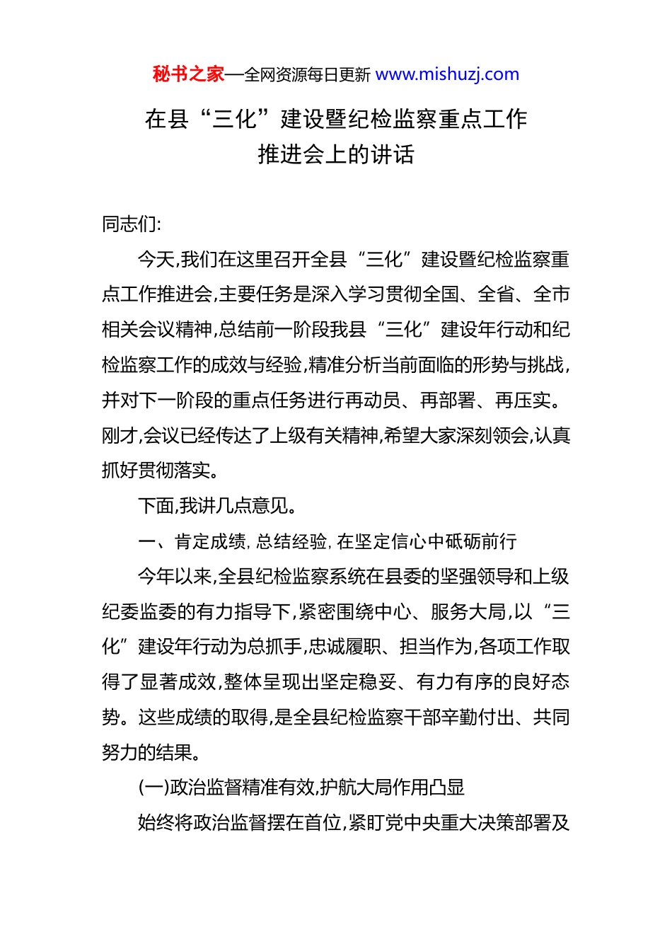 秘书之家—全网资源每日更新 www.mishuzj.com在县“三化”建设暨纪检监察重点工作推进会上的讲话 同志们:今天,我们在这里召开全县“三化”建设暨纪检监察重点工作推进会,主要任务是深入学习贯彻全国、全省、全市相关会议精神,总结前一阶段我县“三化”建设年行动和纪检监察工作的成效与经验,精准分析当前面临的形势与挑战,并对下一阶段的重点任务进行再动员、再部署、再压实。刚才,会议已经传达了上级有关精神,希望大家深刻领会,认真抓好贯彻落实。下面,我讲几点意见。一、肯定成绩,总结经验,在坚定信心中砥砺前行今年以来,全县纪检监察系统在县委的坚强领导和上级纪委监委的有力指导下,紧密围绕中心、服务大局,以“三化”建设年行动为总抓手,忠诚履职、担当作为,各项工作取得了显著成效,整体呈现出坚定稳妥、有力有序的良好态势。这些成绩的取得,是全县纪检监察干部辛勤付出、共同努力的结果。(一)政治监督精准有效,护航大局作用凸显始终将政治监督摆在首位,紧盯党中央重大决策部署及秘书之家—全网资源每日更新 www.mishuzj.com省委、市委、县委工作要求的贯彻落实情况,推动政治监督具体化、精准化、常态化。围绕黄河流域生态保护和高质量发展、乡村全面振兴、重大项目建设等中心工作,制定专项监督清单,通过“室组地”联动监督模式,深入一线开展跟进监督、精准监督。今年以来,累计开展专项政治监督检查30 余次,发现并督促整改各类政治偏差问题超过百个,有力保障了政令畅通和发展大局。特别是在“XX 县 2024 年农村公路安全生命防护工程”等基础设施建设领域,纪检监察组织全程介入,确保项目廉洁高效推进。在水环境治理方面,深化“三水统筹”,通过深入排查整治,有效解决了部分区域存在的乱排乱放问题,切实提升了群众的生态环境获得感。(二)惩治腐败高压常在,一体推进“三不腐”能力持续增强坚持有案必查、有腐必惩,始终保持“严”的主基调不动摇,一体推进不敢腐、不能腐、不想腐。我们整合反腐败全链条力量,加大案件查处力度,对腐败问题发现一起、查处一起,绝不姑息。截至 7 月底,全县纪检监察机关共接收信访举报 215 件次,处置问题线索 350 件,立案审查调查 78 起,给予党纪政务处分 85 人,移送司法机关 5 人,为国家和集体挽回经济损失约 1200 余万元。在查办案件的同时,注重做实“后半篇文章”,针对案件暴露出的制度漏洞和监管短板,秘书之家—全网资源每日更新 www.mishuzj.com制发纪检监察建议书 22 份,督促相关单位建章立制、堵塞漏洞,实现了查处一案、警示一片、治理一域的综合效应。(三)作风建设常抓不懈,党风政风焕然一新持之以恒落实中央八项规定及其实施细则精神,对“四风”问题露头就打、寸步不让。紧盯重要节点、重点领域和关键少数,创新监督方式,综合运用日常监督、集中检查、明察暗访、交叉互查等手段,形成监督合力。今年以来,已累计组织各类专项检查和明察暗访 46 次,严肃查处了违反中央八项规定精神问题 15 起,处理 22 人,其中给予党纪政务处分 12 人。我们还加大了通报曝光力度,对 6 起典型案例进行点名道姓通报,持续释放越往后执纪越严的强烈信号,有效发挥了警示震慑作用,推动作风建设向纵深发展。(四)集中整治动真碰硬,群众急难愁盼问题有效解决坚持人民至上,将整治群众身边不正之风和腐败问题作为工作的重中之重。聚焦乡村振兴领域的项目资金使用、惠民政策落实等环节,严肃查处了一批虚报冒领、截留挪用、优亲厚友等问题。例如,我们针对群众反映强烈的农村集体“三资”管理不规范问题,开展专项治理,清查核实集体资产资源,推动建立健全村级小微权力清单制度,让群众的知情权、参与权、监督权得到更好保障。在教育医疗、养老社保、生态环保等民生领域,共推动解决群众反映强烈的突秘书之家—全网资源每日更新 www.mishuzj.com出问题 130 余个,查处相关违纪违法案件 25 件,让人民群众在正风肃纪反腐中感受到更多的公平正义。(五)队伍建设从严从实,纪检监察铁军形象更加彰显坚持打铁必须自身硬,以更高标准、更严纪律要求纪检监察干部。扎实开展全员培训和实战练兵,组织纪检监察干部参加各类业务培训 150 余人次,通过跟案学习...