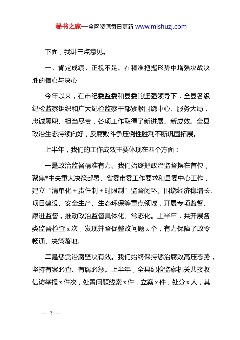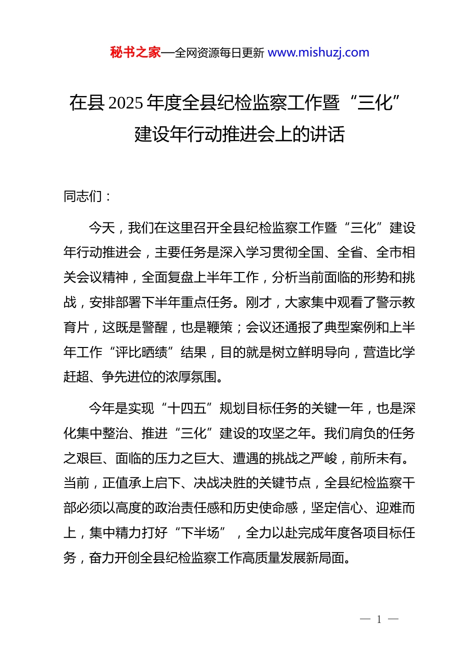 秘书之家—全网资源每日更新 www.mishuzj.com在县 2025 年度全县纪检监察工作暨“三化”建设年行动推进会上的讲话同志们:今天,我们在这里召开全县纪检监察工作暨“三化”建设年行动推进会,主要任务是深入学习贯彻全国、全省、全市相关会议精神,全面复盘上半年工作,分析当前面临的形势和挑战,安排部署下半年重点任务。刚才,大家集中观看了警示教育片,这既是警醒,也是鞭策;会议还通报了典型案例和上半年工作“评比晒绩”结果,目的就是树立鲜明导向,营造比学赶超、争先进位的浓厚氛围。今年是实现“十四五”规划目标任务的关键一年,也是深化集中整治、推进“三化”建设的攻坚之年。我们肩负的任务之艰巨、面临的压力之巨大、遭遇的挑战之严峻,前所未有。当前,正值承上启下、决战决胜的关键节点,全县纪检监察干部必须以高度的政治责任感和历史使命感,坚定信心、迎难而上,集中精力打好“下半场”,全力以赴完成年度各项目标任务,奋力开创全县纪检监察工作高质量发展新局面。— 1 —秘书之家—全网资源每日更新 www.mishuzj.com下面,我讲三点意见。一、肯定成绩、正视不足,在精准把握形势中增强决战决胜的信心与决心今年以来,在市纪委监委和县委的坚强领导下,全县各级纪检监察组织和广大纪检监察干部紧紧围绕中心、服务大局,忠诚履职、担当尽责,各项工作取得了新进展、新成效。全县政治生态持续向好,反腐败斗争压倒性胜利不断巩固拓展。上半年,我们的工作成效主要体现在四个方面:一是政治监督精准有力。我们始终把政治监督摆在首位,聚焦*中央重大决策部署、省委市委工作要求和县委中心工作,建立“清单化+责任制+时限制”监督闭环。围绕经济稳增长、项目建设、安全生产、生态环保等重点领域,开展专项监督、跟进监督,推动政治监督具体化、常态化。上半年,共开展各类监督检查 x 次,发现并督促整改问题 x 个,有力保障了政令畅通、决策落地。二是惩贪治腐坚决有效。我们始终保持惩治腐败高压态势,坚持有案必查、有腐必惩。上半年,全县纪检监察机关共接收信访举报 x 件次,处置问题线索 x 件,立案 x 件,处分 x 人,其— 2 —秘书之家—全网资源每日更新 www.mishuzj.com中县管干部 x 人,移送司法机关 x 人。通过监督检查和审查调查,为国家和集体挽回经济损失 x 万元。我们紧盯工程建设、国资国企、公共资源交易等重点领域,严肃查处了一批影响恶劣的典型案件,释放了全面从严、一严到底的强烈信号。三是正风肃纪深入有为。我们锲而不舍落实中央八项规定精神,对“四风”问题露头就打、寸步不让。扎实开展“x 纪律作风行”专项行动和“纪律作风突出问题整治年”行动,针对违规吃喝、违规收送礼品礼金、酒驾醉驾等顽瘴痼疾,强化风腐同查同治,深挖背后的利益勾兑和责任问题。上半年,共查处违反中央八项规定精神问题 x 起,处理 x 人,点名道姓通报曝光典型案例 x 批 x 起。同时,我们坚持严管厚爱结合、激励约束并重,精准运用“三个区分开来”,为 x 名干部澄清正名,对 x 名受处分干部开展暖心回访,有效激发了干部干事创业的积极性。四是群众期盼积极有应。我们纵深推进群众身边不正之风和腐败问题集中整治,树牢“主战场主战、关键年攻坚”理念,持续深化“五主一体”工作格局,大力推广“有事找纪检·解决靠组织”工作品牌。通过深化“四个一”工作机制和“走访察解”活动,深入一线听民声、察民情、解民忧,严肃查处了一— 3 —秘书之家—全网资源每日更新 www.mishuzj.com批群众反映强烈的“蝇贪蚁腐”。上半年,共解决群众“急难愁盼”问题 x 个,推动相关职能部门完善制度机制 x 项,群众的获得感、幸福感和安全感得到进一步提升。在肯定成绩的同时,我们必须清醒地认识到,对标*中央和省委市委的要求,对标高质量发展的目标,对标人民群众的期盼,我们的工作还存在不少短板和弱项。主要表现在:一是工作推进不平衡。部分乡镇(街道)和派驻机构工作主动性不强,存在“上热下冷”“左重右轻”现象,监督质效有待提升。二是案件查办质效有待提高。大案要案的突破能力还不够强,新型腐败、...