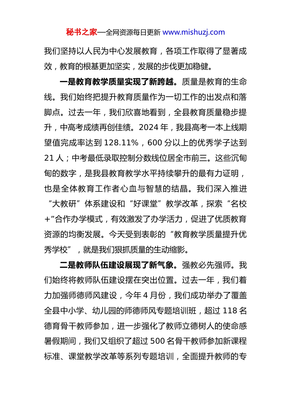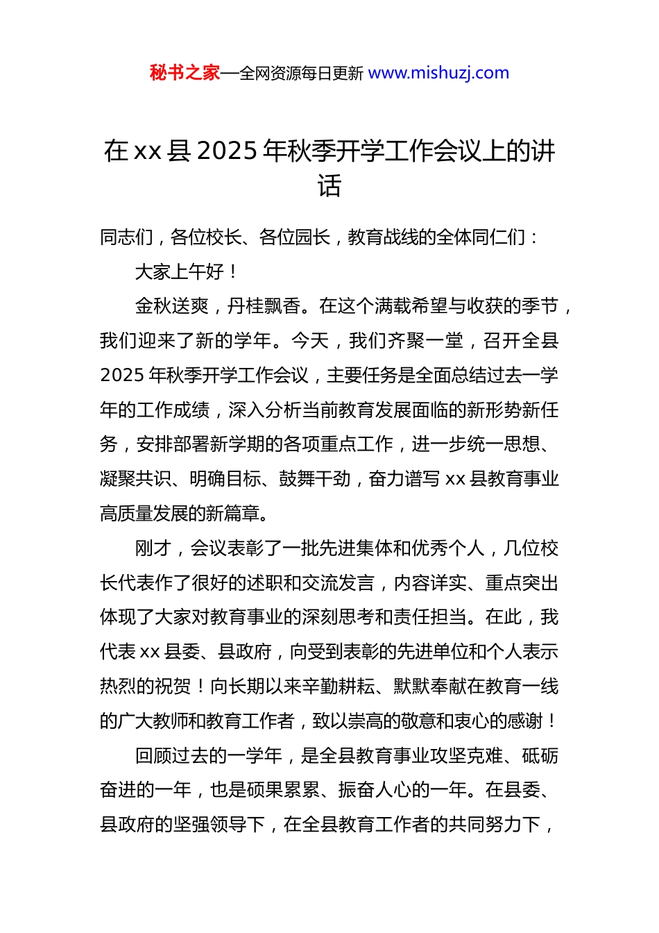 秘书之家—全网资源每日更新 www.mishuzj.com在 xx 县 2025 年秋季开学工作会议上的讲话同志们,各位校长、各位园长,教育战线的全体同仁们:大家上午好!金秋送爽,丹桂飘香。在这个满载希望与收获的季节,我们迎来了新的学年。今天,我们齐聚一堂,召开全县2025 年秋季开学工作会议,主要任务是全面总结过去一学年的工作成绩,深入分析当前教育发展面临的新形势新任务,安排部署新学期的各项重点工作,进一步统一思想、凝聚共识、明确目标、鼓舞干劲,奋力谱写 xx 县教育事业高质量发展的新篇章。刚才,会议表彰了一批先进集体和优秀个人,几位校长代表作了很好的述职和交流发言,内容详实、重点突出体现了大家对教育事业的深刻思考和责任担当。在此,我代表 xx 县委、县政府,向受到表彰的先进单位和个人表示热烈的祝贺!向长期以来辛勤耕耘、默默奉献在教育一线的广大教师和教育工作者,致以崇高的敬意和衷心的感谢!回顾过去的一学年,是全县教育事业攻坚克难、砥砺奋进的一年,也是硕果累累、振奋人心的一年。在县委、县政府的坚强领导下,在全县教育工作者的共同努力下,秘书之家—全网资源每日更新 www.mishuzj.com我们坚持以人民为中心发展教育,各项工作取得了显著成效,教育的根基更加坚实,发展的步伐更加稳健。一是教育教学质量实现了新跨越。质量是教育的生命线。我们始终把提升教育质量作为一切工作的出发点和落脚点。过去一年,我们欣喜地看到,全县教育质量稳步提升,中高考成绩再创佳绩。2024 年,我县高考一本上线期望值完成率达到 128.11%,600 分以上的优秀学子达到21 人;中考最低录取控制分数线位居全市前三。这些沉甸甸的数字,是我县教育教学水平持续攀升的最有力证明,也是全体教育工作者心血与智慧的结晶。我们深入推进“大教研”体系建设和“好课堂”教学改革,探索“名校+”合作办学模式,有效激发了办学活力,促进了优质教育资源的均衡发展。今天受到表彰的“教育教学质量提升优秀学校”,就是我们狠抓质量的生动缩影。二是教师队伍建设展现了新气象。强教必先强师。我们始终将教师队伍建设摆在突出位置。过去一年,我们着力加强师德师风建设,今年 4 月份,我们成功举办了覆盖全县中小学、幼儿园的师德师风专题培训班,超过 118 名德育骨干教师参加,进一步强化了教师立德树人的使命感暑假期间,我们又组织了超过 500 名骨干教师参加新课程标准、课堂教学改革等系列专题培训,全面提升教师的专秘书之家—全网资源每日更新 www.mishuzj.com业素养和教学能力。一支政 ZHI 素质过硬、业务能力精湛、育人水平高超的高素质教师队伍正在加速形成,为我县教育事业的长远发展提供了坚实的人才保障。三是校园安全防线筑牢了新屏障。安全是发展的前提。我们始终以“零容忍”的态度抓好校园安全工作,压紧压实各方责任。过去一年,我们持续深化“平安校园”建设构建了人防、物防、技防、心防、法防“五道防线”,完善了多部门联动的校园安全 ZHI 理体系。公安、交管等部门常态化开展“护学岗”工作,为学生上下学撑起了“平安伞”。各学校认真落实安全主体责任,定期开展应急演练和隐患排查,实现了校园安全管理的常态化、精细化。尤其值得肯定的是,过去一学年来,全县没有发生一起重大安全责任事故,校园整体保持了和谐稳定的良好局面。成绩来之不易,经验弥足珍贵。这些成绩的取得,凝聚着在座各位以及全县广大教育工作者的辛勤汗水和不懈奋斗。实践证明,我们 xx 县的教育工作者是一支有情怀、有担当、能战斗、能奉献的优秀队伍。在此,我再次向大家表示感谢!在肯定成绩的同时,我们也要清醒地认识到,对标人民群众对优质教育的期盼,对标教育现代化发展的要求,我们的工作还存在一些短板和不足。比如,教育资源配置秘书之家—全网资源每日更新 www.mishuzj.com的均衡性仍需加强,部分学校的办学特色还不够鲜明,教师队伍的结构性矛盾依然存在,家校社协同育人的合力有待进一步凝聚。这些问题,需要我们在新学年里高度重视采取有力措施,切实加以解决。同志们,新学年、新起点、新征程。做好新学期的工作,意义重大,责任在...