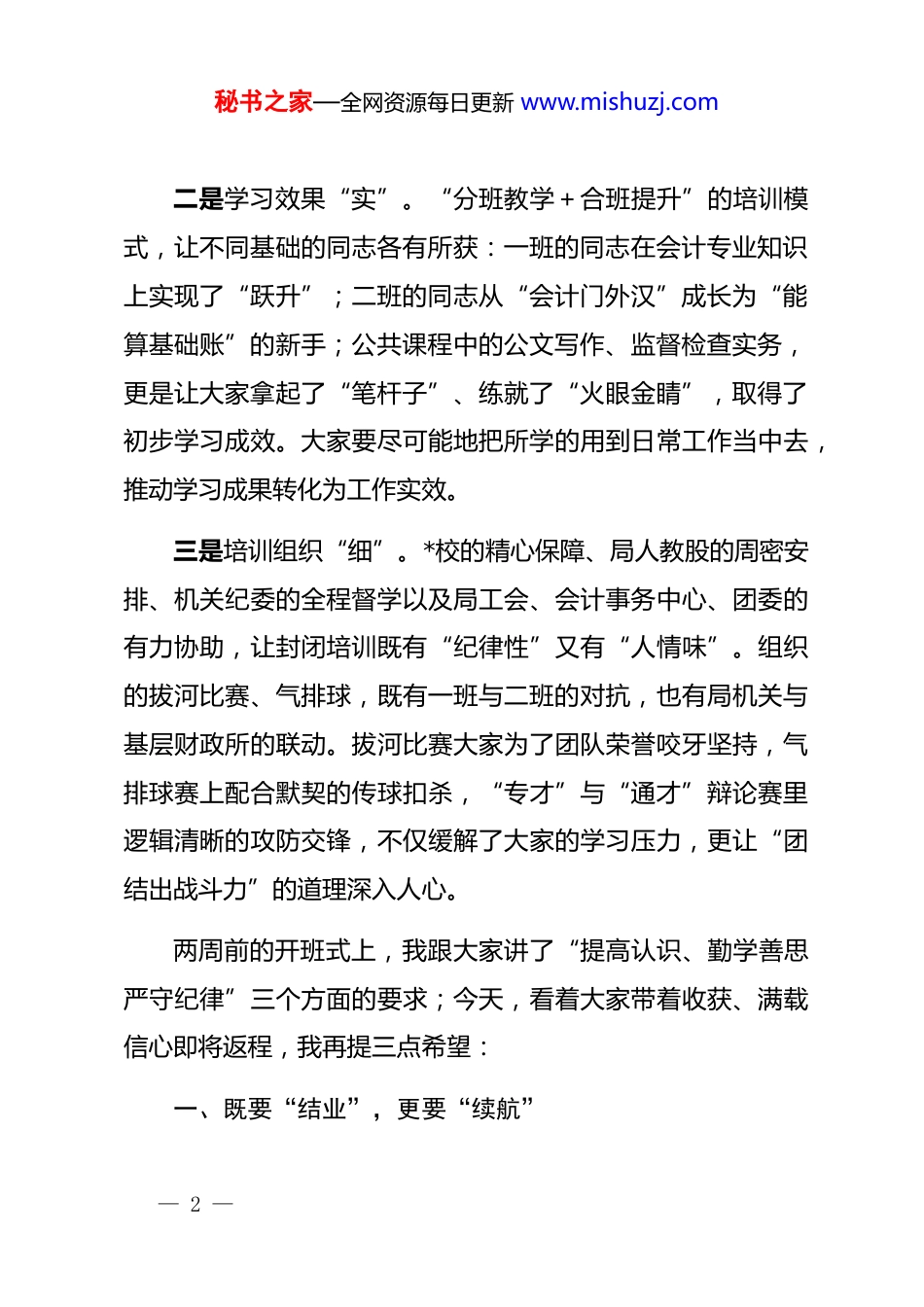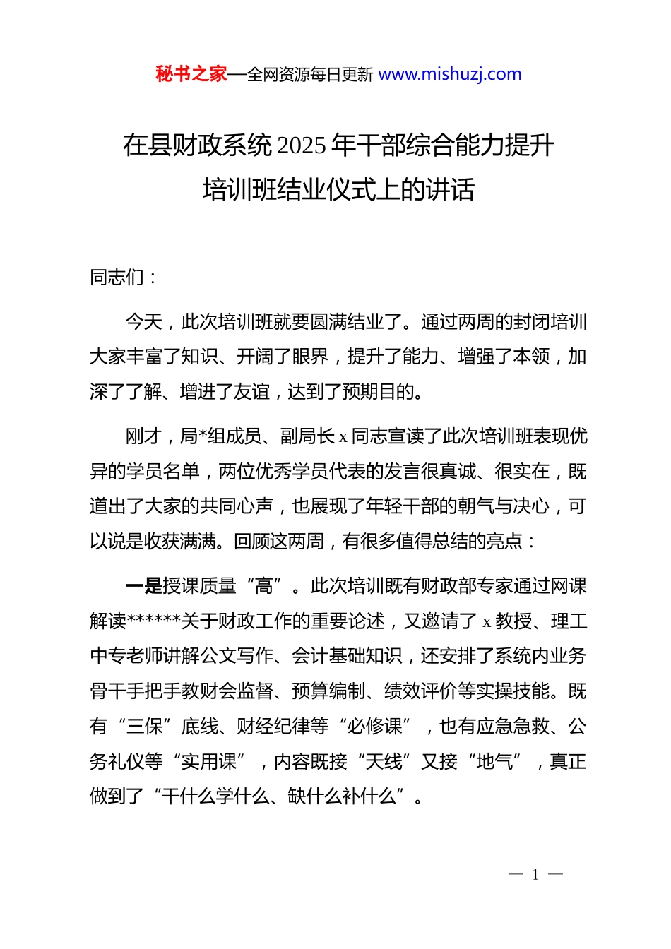 秘书之家—全网资源每日更新 www.mishuzj.com在县财政系统 2025 年干部综合能力提升培训班结业仪式上的讲话同志们:今天,此次培训班就要圆满结业了。通过两周的封闭培训大家丰富了知识、开阔了眼界,提升了能力、增强了本领,加深了了解、增进了友谊,达到了预期目的。刚才,局*组成员、副局长 x 同志宣读了此次培训班表现优异的学员名单,两位优秀学员代表的发言很真诚、很实在,既道出了大家的共同心声,也展现了年轻干部的朝气与决心,可以说是收获满满。回顾这两周,有很多值得总结的亮点:一是授课质量“高”。此次培训既有财政部专家通过网课解读******关于财政工作的重要论述,又邀请了 x 教授、理工中专老师讲解公文写作、会计基础知识,还安排了系统内业务骨干手把手教财会监督、预算编制、绩效评价等实操技能。既有“三保”底线、财经纪律等“必修课”,也有应急急救、公务礼仪等“实用课”,内容既接“天线”又接“地气”,真正做到了“干什么学什么、缺什么补什么”。— 1 —秘书之家—全网资源每日更新 www.mishuzj.com二是学习效果“实”。“分班教学+合班提升”的培训模式,让不同基础的同志各有所获:一班的同志在会计专业知识上实现了“跃升”;二班的同志从“会计门外汉”成长为“能算基础账”的新手;公共课程中的公文写作、监督检查实务,更是让大家拿起了“笔杆子”、练就了“火眼金睛”,取得了初步学习成效。大家要尽可能地把所学的用到日常工作当中去,推动学习成果转化为工作实效。三是培训组织“细”。*校的精心保障、局人教股的周密安排、机关纪委的全程督学以及局工会、会计事务中心、团委的有力协助,让封闭培训既有“纪律性”又有“人情味”。组织的拔河比赛、气排球,既有一班与二班的对抗,也有局机关与基层财政所的联动。拔河比赛大家为了团队荣誉咬牙坚持,气排球赛上配合默契的传球扣杀,“专才”与“通才”辩论赛里逻辑清晰的攻防交锋,不仅缓解了大家的学习压力,更让“团结出战斗力”的道理深入人心。两周前的开班式上,我跟大家讲了“提高认识、勤学善思严守纪律”三个方面的要求;今天,看着大家带着收获、满载信心即将返程,我再提三点希望:一、既要“结业”,更要“续航”— 2 —秘书之家—全网资源每日更新 www.mishuzj.com要坚持把学习变成终身习惯。这次培训是“加油站”,不是“终点站”。财政科学管理正在大步推进,财政政策更新快,需要大家快速学习、精准把握、高效落实。希望大家把“结业”当作“续航”的起点:一要盯着“天线”学。持续关注中央经济工作会议精神、全省财政科学管理部署要求、市县财政工作要求以及全局工作目标,精准把握政策导向与实践要求,与本职工作深入融合,确保方向不偏;二要围着“业务”学。针对预算编制、绩效评价、国资管理等岗位需求,要坚持哪里不足就要及时补起来,做到靶向发力,精准提升;三要跟着“实践”学。在资金拨付、监督检查等具体工作中多问“为什么”“怎么办”,把每个难题都变成学习的契机、成长的阶梯。尤其对年轻干部特别是刚入职的干部来说,更要保持“空杯心态”,既要向书本学,也要向老同志学,把“新手期”变成“成长期”。二、既要“懂账”,更要“懂事”要坚持把能力用到干实事处。财政工作,既要算清“数字账”,更要算好“政治账”“民生账”。开班时我提到,有的同志在财政资金统筹使用中存在“卡壳”问题,本质是对“资金背后是政策、是民心”的理解不深。这次培训专门安排的— 3 —秘书之家—全网资源每日更新 www.mishuzj.com“三保”底线实务课程,就是要让大家明白:每一分钱都关系到义务教育、基本医疗、民生兜底,慢一步可能影响群众获得感,错一步可能偏离政策方向。回去后,希望大家把学到的本领转化为“三种能力”:一是“解难题”的能力。比如用绩效评价方法管好项目资金,避免“撒胡椒面”;用好监督检查中的“逆查法”“抽查法”“分析法”,推动工作提效;二是“善沟通”的能力。面对部门预算申报、群众政策咨询,既要讲清“不能办”的规矩,也要说明“怎么办”的路径;三是“会写作”的能力。机关的工作性质究其实质是综合文秘工作...