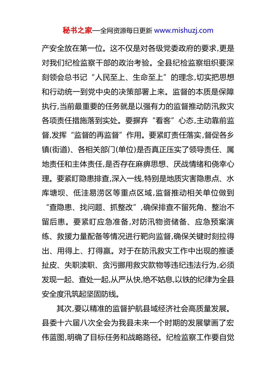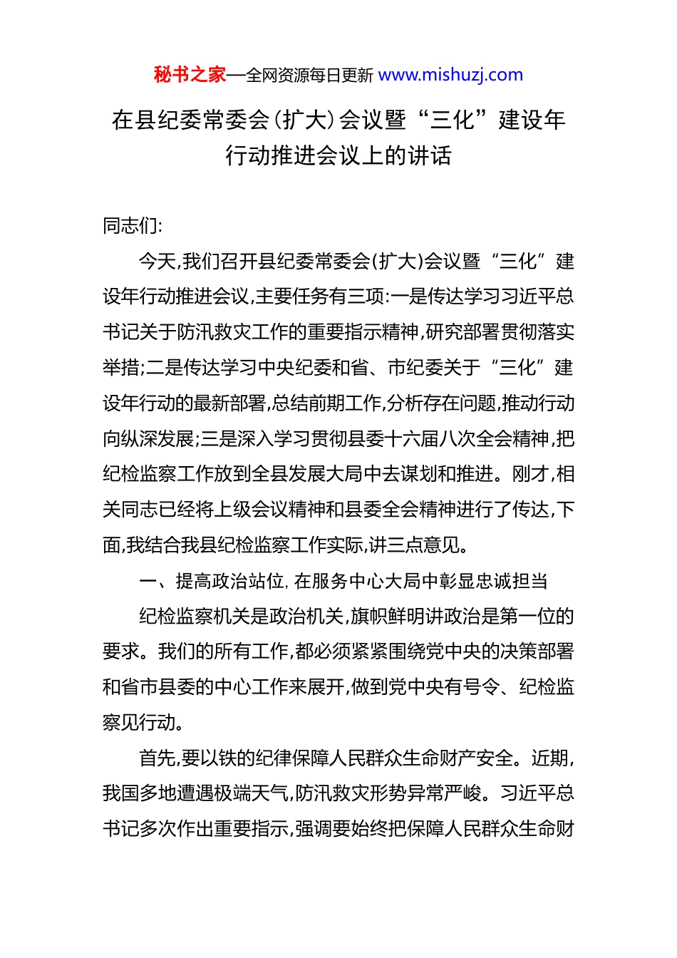 秘书之家—全网资源每日更新 www.mishuzj.com在县纪委常委会(扩大)会议暨“三化”建设年行动推进会议上的讲话 同志们:今天,我们召开县纪委常委会(扩大)会议暨“三化”建设年行动推进会议,主要任务有三项:一是传达学习习近平总书记关于防汛救灾工作的重要指示精神,研究部署贯彻落实举措;二是传达学习中央纪委和省、市纪委关于“三化”建设年行动的最新部署,总结前期工作,分析存在问题,推动行动向纵深发展;三是深入学习贯彻县委十六届八次全会精神,把纪检监察工作放到全县发展大局中去谋划和推进。刚才,相关同志已经将上级会议精神和县委全会精神进行了传达,下面,我结合我县纪检监察工作实际,讲三点意见。一、提高政治站位,在服务中心大局中彰显忠诚担当纪检监察机关是政治机关,旗帜鲜明讲政治是第一位的要求。我们的所有工作,都必须紧紧围绕党中央的决策部署和省市县委的中心工作来展开,做到党中央有号令、纪检监察见行动。首先,要以铁的纪律保障人民群众生命财产安全。近期,我国多地遭遇极端天气,防汛救灾形势异常严峻。习近平总书记多次作出重要指示,强调要始终把保障人民群众生命财秘书之家—全网资源每日更新 www.mishuzj.com产安全放在第一位。这不仅是对各级党委政府的要求,更是对我们纪检监察干部的政治考验。全县纪检监察组织要深刻领会总书记“人民至上、生命至上”的理念,切实把思想和行动统一到党中央的决策部署上来。监督的本质是保障执行,当前最重要的任务就是以强有力的监督推动防汛救灾各项责任措施落到实处。要摒弃“看客”心态,主动靠前监督,发挥“监督的再监督”作用。要紧盯责任落实,督促各乡镇(街道)、各相关部门(单位)是否真正压实了领导责任、属地责任和主体责任,是否存在麻痹思想、厌战情绪和侥幸心理。要紧盯隐患排查,深入一线,特别是地质灾害隐患点、水库塘坝、低洼易涝区等重点区域,监督推动相关单位做到“查隐患、找问题、抓整改”,确保排查不留死角、整治不留后患。要紧盯应急准备,对防汛物资储备、应急预案演练、救援力量配备等情况进行靶向监督,确保关键时刻拉得出、用得上、打得赢。对于在防汛救灾工作中出现的推诿扯皮、失职渎职、贪污挪用救灾款物等违纪违法行为,必须发现一起、查处一起,从严从快,绝不姑息,以铁的纪律为全县安全度汛筑起坚固防线。其次,要以精准的监督护航县域经济社会高质量发展。县委十六届八次全会为我县未来一个时期的发展擘画了宏伟蓝图,明确了目标任务和战略路径。纪检监察工作要自觉秘书之家—全网资源每日更新 www.mishuzj.com融入这个大局,找准切入点和着力点。全会提出的每一个重大项目、每一项重点工程、每一条惠民政策,都是我们监督的重点。要建立健全重大决策部署监督落实机制,通过专项监督、政治巡察、日常监督相结合的方式,推动全会精神落地生根。例如,在优化营商环境方面,要严肃查处吃拿卡要、庸懒散拖、推诿扯皮等破坏营商环境的行为 ,推动构建“亲”“清”统一的新型政商关系。在重点项目建设方面,要加强对项目审批、招投标、资金使用等关键环节的监督,严防腐败问题滋生,确保项目廉洁高效推进,成为阳光工程、廉洁工程。今年上半年,全县纪检监察机关共处置问题线索320 件,立案 115 件,给予党纪政务处分 102 人,为国家和集体挽回经济损失超过 1200 万元。这些数据表明,正风肃纪反腐不仅是净化政治生态的需要,更是保障经济社会健康发展的必然要求。我们必须清醒认识到,监督不是发展的“绊脚石”,而是高质量发展的“压舱石”。一个风清气正的政治生态,必然会转化为强大的发展动能。二、深化“三化”建设,在守正创新中提升履职能力今年是中央纪委确定的“三化”建设年。推进纪检监察工作规范化、法治化、正规化建设,是新时代新征程对纪检监察工作提出的内在要求,是推动高质量发展的必由之路。根据中央纪委和省市纪委的推进会议精神,结合市纪委秘书之家—全网资源每日更新 www.mishuzj.com近期梳理指出的“十个问题”,我们必须坚持问题导向,拿出更实的举措,推动我县“三化”建设迈上新台阶。第一,在“规范化”上再深化,核心是构建权责清晰、流程严密、运转高效的工作体系。规范化是基础,是纪检监察工作...