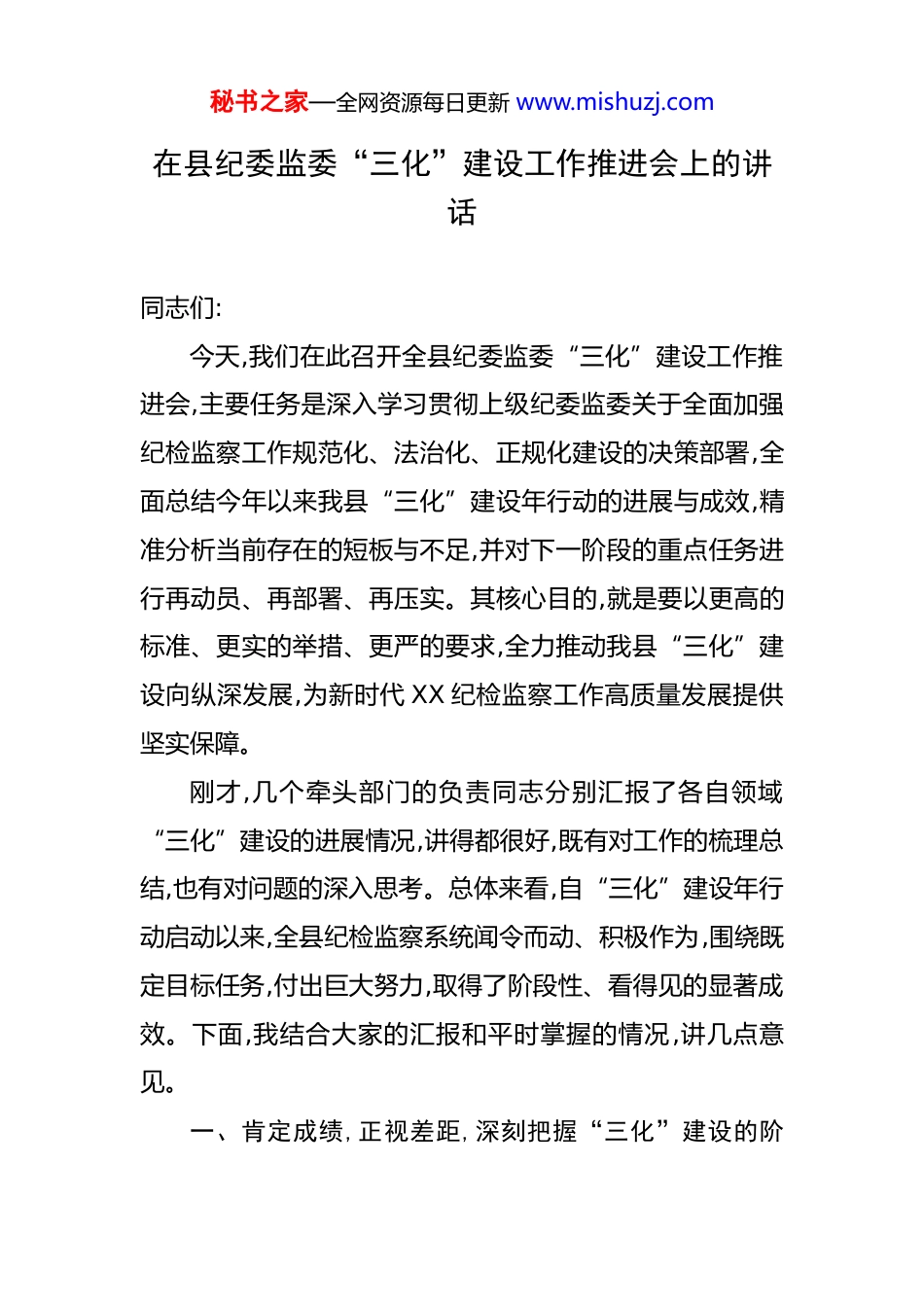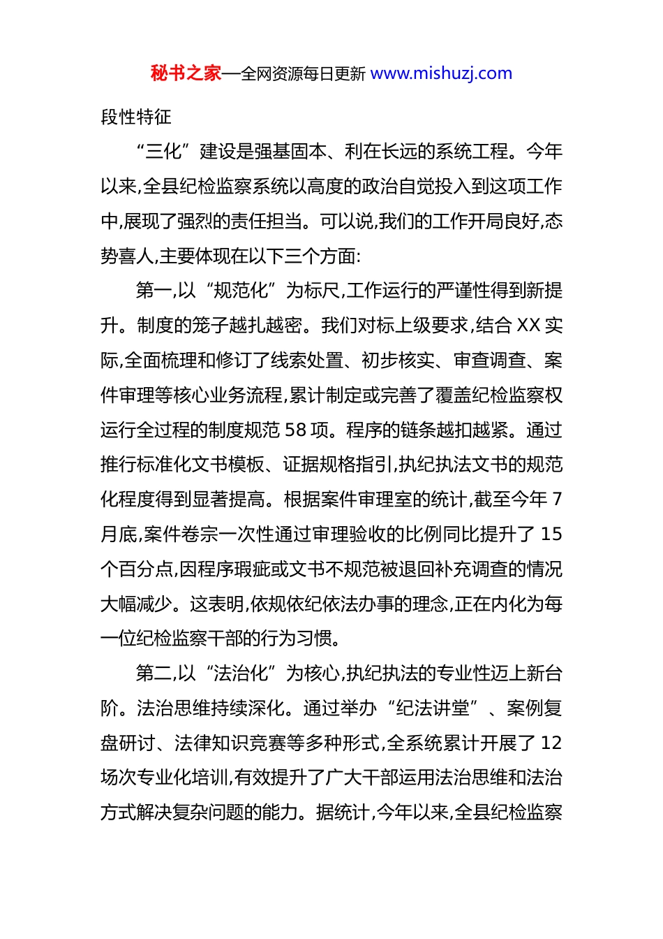 秘书之家—全网资源每日更新 www.mishuzj.com在县纪委监委“三化”建设工作推进会上的讲话 同志们:今天,我们在此召开全县纪委监委“三化”建设工作推进会,主要任务是深入学习贯彻上级纪委监委关于全面加强纪检监察工作规范化、法治化、正规化建设的决策部署,全面总结今年以来我县“三化”建设年行动的进展与成效,精准分析当前存在的短板与不足,并对下一阶段的重点任务进行再动员、再部署、再压实。其核心目的,就是要以更高的标准、更实的举措、更严的要求,全力推动我县“三化”建设向纵深发展,为新时代 XX 纪检监察工作高质量发展提供坚实保障。刚才,几个牵头部门的负责同志分别汇报了各自领域“三化”建设的进展情况,讲得都很好,既有对工作的梳理总结,也有对问题的深入思考。总体来看,自“三化”建设年行动启动以来,全县纪检监察系统闻令而动、积极作为,围绕既定目标任务,付出巨大努力,取得了阶段性、看得见的显著成效。下面,我结合大家的汇报和平时掌握的情况,讲几点意见。一、肯定成绩,正视差距,深刻把握“三化”建设的阶秘书之家—全网资源每日更新 www.mishuzj.com段性特征“三化”建设是强基固本、利在长远的系统工程。今年以来,全县纪检监察系统以高度的政治自觉投入到这项工作中,展现了强烈的责任担当。可以说,我们的工作开局良好,态势喜人,主要体现在以下三个方面:第一,以“规范化”为标尺,工作运行的严谨性得到新提升。制度的笼子越扎越密。我们对标上级要求,结合 XX 实际,全面梳理和修订了线索处置、初步核实、审查调查、案件审理等核心业务流程,累计制定或完善了覆盖纪检监察权运行全过程的制度规范 58 项。程序的链条越扣越紧。通过推行标准化文书模板、证据规格指引,执纪执法文书的规范化程度得到显著提高。根据案件审理室的统计,截至今年 7月底,案件卷宗一次性通过审理验收的比例同比提升了 15个百分点,因程序瑕疵或文书不规范被退回补充调查的情况大幅减少。这表明,依规依纪依法办事的理念,正在内化为每一位纪检监察干部的行为习惯。第二,以“法治化”为核心,执纪执法的专业性迈上新台阶。法治思维持续深化。通过举办“纪法讲堂”、案例复盘研讨、法律知识竞赛等多种形式,全系统累计开展了 12场次专业化培训,有效提升了广大干部运用法治思维和法治方式解决复杂问题的能力。据统计,今年以来,全县纪检监察秘书之家—全网资源每日更新 www.mishuzj.com干部在案件查办中,对于法理情的把握更加精准,因定性不准、量纪畸轻畸重而引发的申诉复议数量 ,同比下降了30%。办案质效显著增强。我们坚持证据为王,严格落实“二十四字”基本要求,确保办理的每一起案件都经得起历史和人民的检验。一些过去认为难啃的“硬骨头”案件,在法治化轨道的保障下得以成功突破,取得了良好的政治效果、纪法效果和社会效果的有机统一。第三,以“正规化”为保障,干部队伍的战斗力实现新跨越。组织建设更加有力。我们完成了对乡镇(街道)纪(工)委的标准化建设,实现了标准化谈话室、档案室、办公办案设备的全覆盖。队伍管理更加严格。我们严格执行监督执纪工作规则和监督执法工作规定,完善了干部日常监督管理机制,强化了保密纪律和工作纪律,纪检监察干部队伍的“铁军”形象更加鲜明。例如,在近期开展的一次内部督察中,未发现一起违反“十个严禁”的情况,展现了队伍过硬的作风。在肯定成绩的同时,也必须清醒地认识到,对照上级的更高要求,对照高质量发展的现实需要,对照人民群众的殷切期盼,我们的“三化”建设工作还存在一些不容忽视的问题和短板。一是思想认识存在温差,工作推进不够均衡。有的单位秘书之家—全网资源每日更新 www.mishuzj.com和部门对“三化”建设的极端重要性认识不足,将其视为一项“软任务”,存在“上头热、下头冷”、“机关热、基层冷”的现象。部分干部认为“三化”建设主要是办公室、案件监督管理室等综合部门的事情,与一线办案监督关系不大,存在“与己无关”的错误思想。这种思想上的温差直接导致了行动上的落差,使得全县“三化”建设的整体步调不一,成效参差不齐。二是结合融合存在表象,体系效能不够彰明。“三化”建设与主责主业“两张皮”的现象依然在一定程...