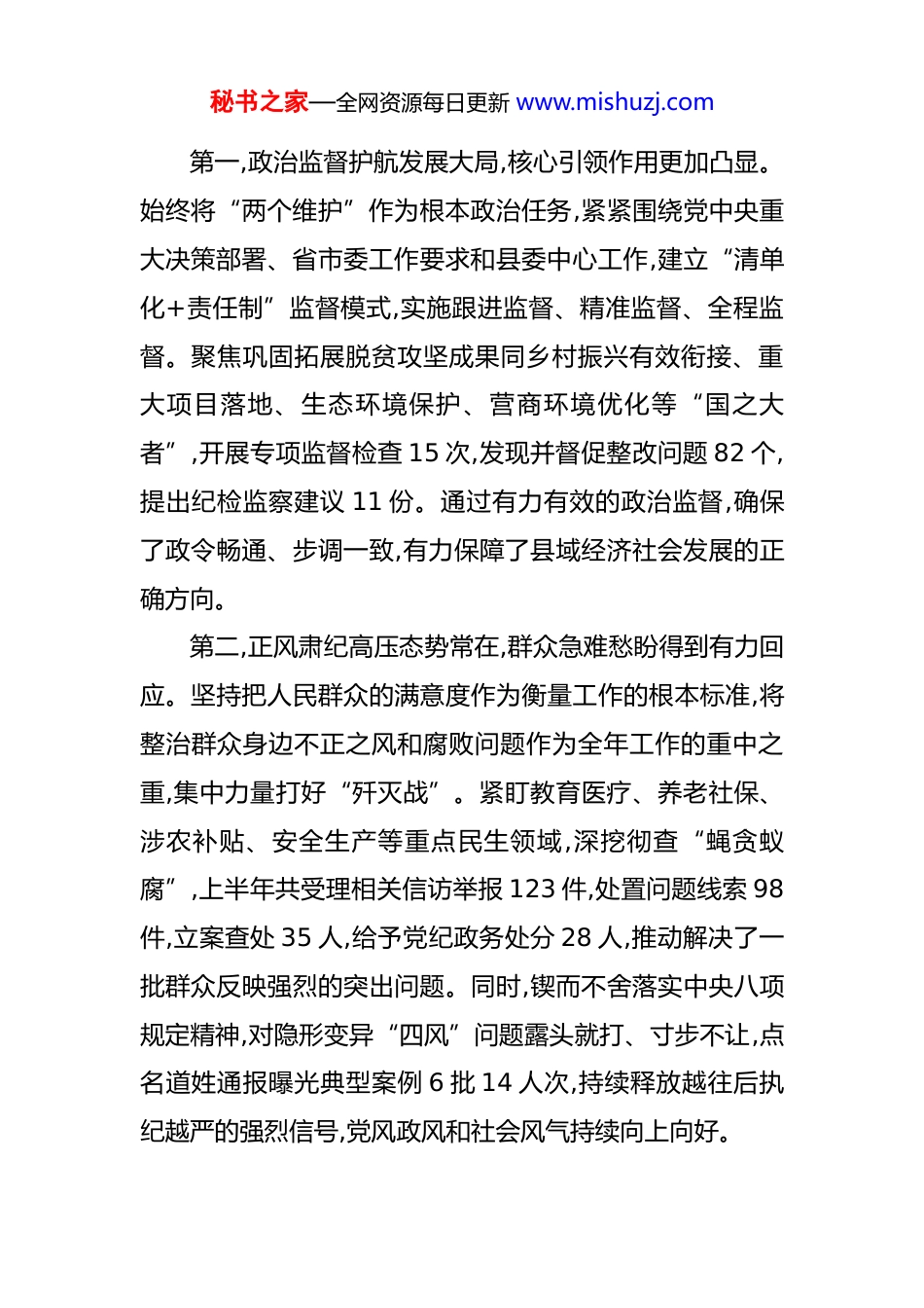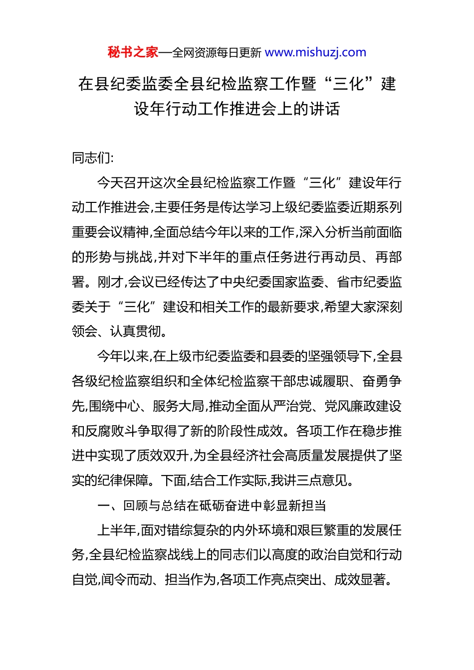 秘书之家—全网资源每日更新 www.mishuzj.com在县纪委监委全县纪检监察工作暨“三化”建设年行动工作推进会上的讲话 同志们:今天召开这次全县纪检监察工作暨“三化”建设年行动工作推进会,主要任务是传达学习上级纪委监委近期系列重要会议精神,全面总结今年以来的工作,深入分析当前面临的形势与挑战,并对下半年的重点任务进行再动员、再部署。刚才,会议已经传达了中央纪委国家监委、省市纪委监委关于“三化”建设和相关工作的最新要求,希望大家深刻领会、认真贯彻。今年以来,在上级市纪委监委和县委的坚强领导下,全县各级纪检监察组织和全体纪检监察干部忠诚履职、奋勇争先,围绕中心、服务大局,推动全面从严治党、党风廉政建设和反腐败斗争取得了新的阶段性成效。各项工作在稳步推进中实现了质效双升,为全县经济社会高质量发展提供了坚实的纪律保障。下面,结合工作实际,我讲三点意见。一、回顾与总结在砥砺奋进中彰显新担当上半年,面对错综复杂的内外环境和艰巨繁重的发展任务,全县纪检监察战线上的同志们以高度的政治自觉和行动自觉,闻令而动、担当作为,各项工作亮点突出、成效显著。秘书之家—全网资源每日更新 www.mishuzj.com第一,政治监督护航发展大局,核心引领作用更加凸显。始终将“两个维护”作为根本政治任务,紧紧围绕党中央重大决策部署、省市委工作要求和县委中心工作,建立“清单化+责任制”监督模式,实施跟进监督、精准监督、全程监督。聚焦巩固拓展脱贫攻坚成果同乡村振兴有效衔接、重大项目落地、生态环境保护、营商环境优化等“国之大者”,开展专项监督检查 15 次,发现并督促整改问题 82 个,提出纪检监察建议 11 份。通过有力有效的政治监督,确保了政令畅通、步调一致,有力保障了县域经济社会发展的正确方向。第二,正风肃纪高压态势常在,群众急难愁盼得到有力回应。坚持把人民群众的满意度作为衡量工作的根本标准,将整治群众身边不正之风和腐败问题作为全年工作的重中之重,集中力量打好“歼灭战”。紧盯教育医疗、养老社保、涉农补贴、安全生产等重点民生领域,深挖彻查“蝇贪蚁腐”,上半年共受理相关信访举报 123 件,处置问题线索 98件,立案查处 35 人,给予党纪政务处分 28 人,推动解决了一批群众反映强烈的突出问题。同时,锲而不舍落实中央八项规定精神,对隐形变异“四风”问题露头就打、寸步不让,点名道姓通报曝光典型案例 6 批 14 人次,持续释放越往后执纪越严的强烈信号,党风政风和社会风气持续向上向好。秘书之家—全网资源每日更新 www.mishuzj.com第三,案件查办质量效率并重,一体推进“三不腐”能力显著提升。始终保持惩治腐败的战略定力和高压态势,聚焦金融、国企、工程建设等权力集中、资金密集、资源富集的重点领域,紧盯“关键少数”,严肃查处了一批有影响力的案件。上半年,全县纪检监察组织共处置问题线索 210 件,同比增长 12%;立案 72 件,其中科级干部案件 15 件,留置 5人。在办案过程中,不仅追求数量,更注重质量和效率的统一,严格依规依纪依法,确保每一起案件都经得起历史和人民的检验。同时,强化以案促改、以案促治,深入剖析典型案件背后的制度漏洞和监管缺失,制发纪检监察建议书 21 份,督促相关单位建章立制 30 余项,一体推进不敢腐、不能腐、不想腐的综合效应初步显现。第四,“三化”建设与清廉建设协同并进,队伍自身建设根基持续筑牢。将“规范化、法治化、正规化”建设作为提升履职能力的“生命线工程”,全面启动“三化”建设年行动。通过开展“四比一创”活动,即比学习、比办案、比作风、比贡献,创一流业绩,激发了干部队伍的内生动力。同时,全域深化“清廉 XX”建设,创新打造“清廉单元+”模式,成功培育了一批清廉机关、清廉村居、清廉学校示范点,廉洁文化宣传载体不断丰富,崇廉尚洁的社会氛围日益浓厚。在肯定成绩的同时,也必须清醒地认识到,对照党中央的秘书之家—全网资源每日更新 www.mishuzj.com要求和人民群众的期盼,工作中仍然存在一些不容忽视的短板和弱项。例如,政治监督的穿透力、精准度仍有提升空间,从发现问题到推动系统治理的闭环机制尚不完善;少数领域和单位的“四风”问题树倒根存,隐形变异...