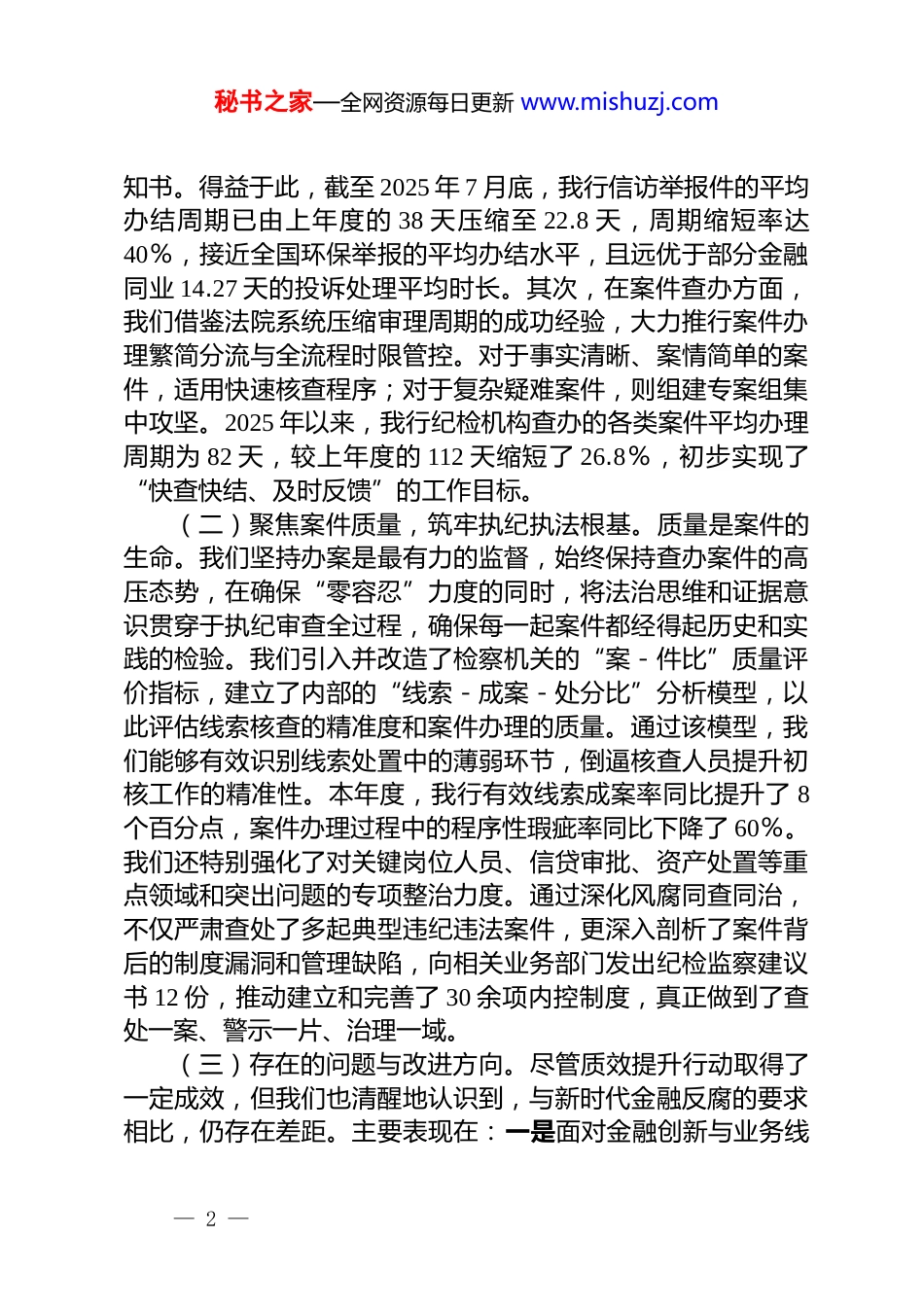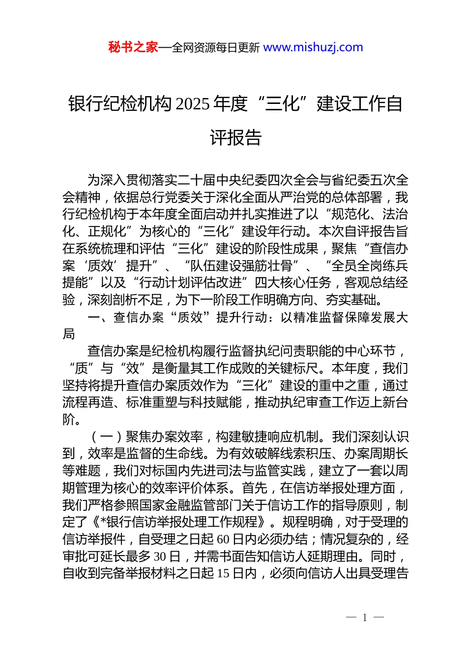 秘书之家—全网资源每日更新 www.mishuzj.com银行纪检机构 2025 年度“三化”建设工作自评报告为深入贯彻落实二十届中央纪委四次全会与省纪委五次全会精神,依据总行党委关于深化全面从严治党的总体部署,我行纪检机构于本年度全面启动并扎实推进了以“规范化、法治化、正规化”为核心的“三化”建设年行动。本次自评报告旨在系统梳理和评估“三化”建设的阶段性成果,聚焦“查信办案‘质效’提升”、“队伍建设强筋壮骨”、“全员全岗练兵提能”以及“行动计划评估改进”四大核心任务,客观总结经验,深刻剖析不足,为下一阶段工作明确方向、夯实基础。一、查信办案“质效”提升行动:以精准监督保障发展大局查信办案是纪检机构履行监督执纪问责职能的中心环节,“质”与“效”是衡量其工作成败的关键标尺。本年度,我们坚持将提升查信办案质效作为“三化”建设的重中之重,通过流程再造、标准重塑与科技赋能,推动执纪审查工作迈上新台阶。(一)聚焦办案效率,构建敏捷响应机制。我们深刻认识到,效率是监督的生命线。为有效破解线索积压、办案周期长等难题,我们对标国内先进司法与监管实践,建立了一套以周期管理为核心的效率评价体系。首先,在信访举报处理方面,我们严格参照国家金融监管部门关于信访工作的指导原则,制定了《*银行信访举报处理工作规程》。规程明确,对于受理的信访举报件,自受理之日起 60 日内必须办结;情况复杂的,经审批可延长最多 30 日,并需书面告知信访人延期理由。同时,自收到完备举报材料之日起 15 日内,必须向信访人出具受理告— 1 —秘书之家—全网资源每日更新 www.mishuzj.com知书。得益于此,截至 2025 年 7 月底,我行信访举报件的平均办结周期已由上年度的 38 天压缩至 22.8 天,周期缩短率达40%,接近全国环保举报的平均办结水平,且远优于部分金融同业 14.27 天的投诉处理平均时长。其次,在案件查办方面,我们借鉴法院系统压缩审理周期的成功经验,大力推行案件办理繁简分流与全流程时限管控。对于事实清晰、案情简单的案件,适用快速核查程序;对于复杂疑难案件,则组建专案组集中攻坚。2025 年以来,我行纪检机构查办的各类案件平均办理周期为 82 天,较上年度的 112 天缩短了 26.8%,初步实现了“快查快结、及时反馈”的工作目标。(二)聚焦案件质量,筑牢执纪执法根基。质量是案件的生命。我们坚持办案是最有力的监督,始终保持查办案件的高压态势,在确保“零容忍”力度的同时,将法治思维和证据意识贯穿于执纪审查全过程,确保每一起案件都经得起历史和实践的检验。我们引入并改造了检察机关的“案-件比”质量评价指标,建立了内部的“线索-成案-处分比”分析模型,以此评估线索核查的精准度和案件办理的质量。通过该模型,我们能够有效识别线索处置中的薄弱环节,倒逼核查人员提升初核工作的精准性。本年度,我行有效线索成案率同比提升了 8个百分点,案件办理过程中的程序性瑕疵率同比下降了 60%。我们还特别强化了对关键岗位人员、信贷审批、资产处置等重点领域和突出问题的专项整治力度。通过深化风腐同查同治,不仅严肃查处了多起典型违纪违法案件,更深入剖析了案件背后的制度漏洞和管理缺陷,向相关业务部门发出纪检监察建议书 12 份,推动建立和完善了 30 余项内控制度,真正做到了查处一案、警示一片、治理一域。(三)存在的问题与改进方向。尽管质效提升行动取得了一定成效,但我们也清醒地认识到,与新时代金融反腐的要求相比,仍存在差距。主要表现在:一是面对金融创新与业务线— 2 —秘书之家—全网资源每日更新 www.mishuzj.com上化带来的新型、隐性腐败问题,我们的调查取证手段和专业分析能力仍有待提升;二是案件审理的专业化水平有待加强,特别是在定性量纪的精准度方面,需要进一步深化对党纪法规和国家法律的理解与适用;三是“查”与“治”的衔接还不够顺畅,部分纪检监察建议的整改跟踪问效机制尚未完全形成闭环。二、队伍建设强筋壮骨行动:锻造忠诚干净担当的纪检铁军纪检监察工作是“得罪人”的工作,必须由最忠诚、最干净、最担当的干部来做。我们...