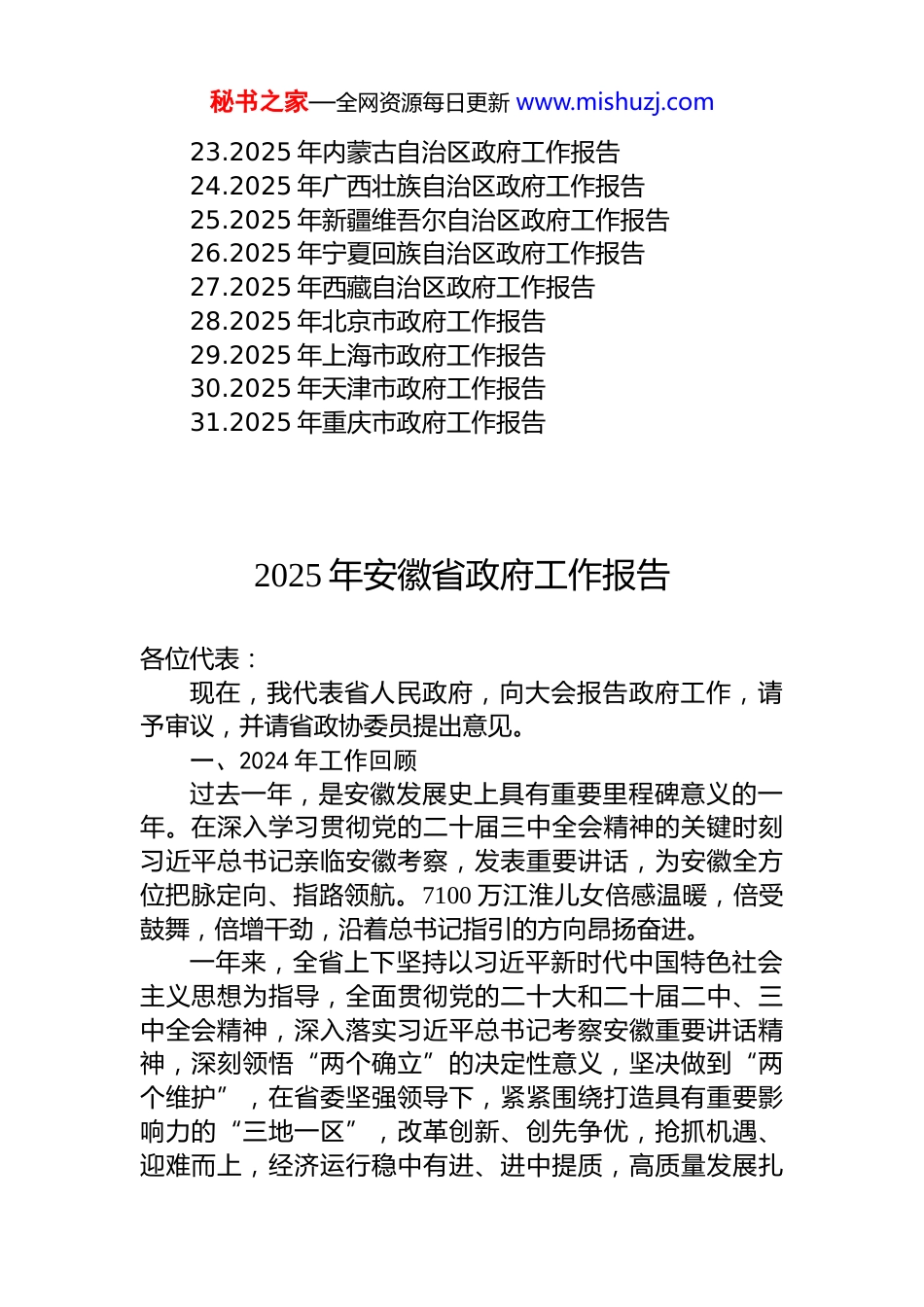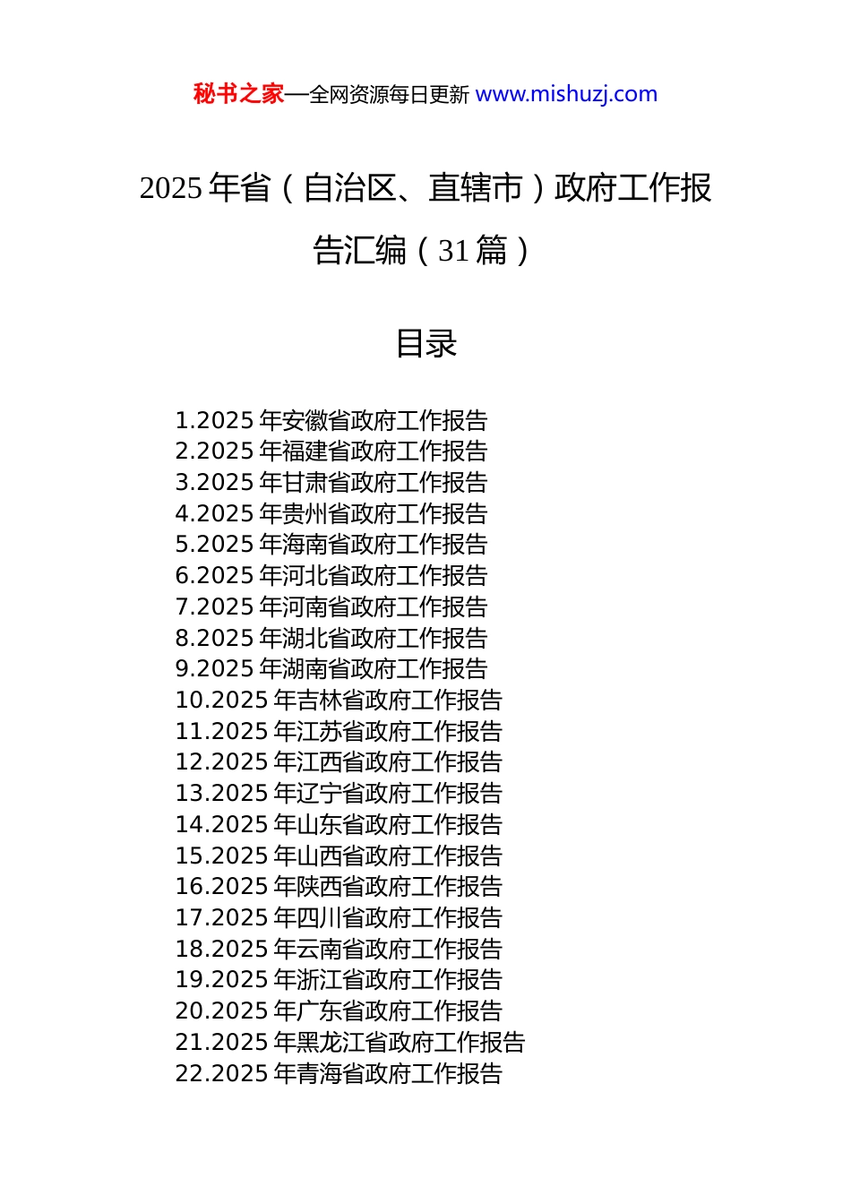 秘书之家—全网资源每日更新 www.mishuzj.com2025 年省(自治区、直辖市)政府工作报告汇编(31 篇)目录1.2025 年安徽省政府工作报告2.2025 年福建省政府工作报告3.2025 年甘肃省政府工作报告4.2025 年贵州省政府工作报告5.2025 年海南省政府工作报告6.2025 年河北省政府工作报告7.2025 年河南省政府工作报告8.2025 年湖北省政府工作报告9.2025 年湖南省政府工作报告10.2025 年吉林省政府工作报告11.2025 年江苏省政府工作报告12.2025 年江西省政府工作报告13.2025 年辽宁省政府工作报告14.2025 年山东省政府工作报告15.2025 年山西省政府工作报告16.2025 年陕西省政府工作报告17.2025 年四川省政府工作报告18.2025 年云南省政府工作报告19.2025 年浙江省政府工作报告20.2025 年广东省政府工作报告21.2025 年黑龙江省政府工作报告22.2025 年青海省政府工作报告秘书之家—全网资源每日更新 www.mishuzj.com23.2025 年内蒙古自治区政府工作报告24.2025 年广西壮族自治区政府工作报告25.2025 年新疆维吾尔自治区政府工作报告26.2025 年宁夏回族自治区政府工作报告27.2025 年西藏自治区政府工作报告28.2025 年北京市政府工作报告29.2025 年上海市政府工作报告30.2025 年天津市政府工作报告31.2025 年重庆市政府工作报告2025 年安徽省政府工作报告各位代表:现在,我代表省人民政府,向大会报告政府工作,请予审议,并请省政协委员提出意见。一、2024 年工作回顾过去一年,是安徽发展史上具有重要里程碑意义的一年。在深入学习贯彻党的二十届三中全会精神的关键时刻习近平总书记亲临安徽考察,发表重要讲话,为安徽全方位把脉定向、指路领航。7100 万江淮儿女倍感温暖,倍受鼓舞,倍增干劲,沿着总书记指引的方向昂扬奋进。一年来,全省上下坚持以习近平新时代中国特色社会主义思想为指导,全面贯彻党的二十大和二十届二中、三中全会精神,深入落实习近平总书记考察安徽重要讲话精神,深刻领悟“两个确立”的决定性意义,坚决做到“两个维护”,在省委坚强领导下,紧紧围绕打造具有重要影响力的“三地一区”,改革创新、创先争优,抢抓机遇、迎难而上,经济运行稳中有进、进中提质,高质量发展扎秘书之家—全网资源每日更新 www.mishuzj.com实推进,美好安徽建设迈出坚实步伐。——经济实力跃上新台阶。全省地区生产总值增长5.8%,经济总量跨上 5 万亿元台阶。粮食产量 836.9 亿斤,再创历史新高。规上工业增加值增长 9%,增速居工业大省第 1 位。社会消费品零售总额、固定资产投资、一般公共预算收入等指标增速快于全国。——科技创新策源地建设实现新突破。量子信息、聚变能源、深空探测三大科创引领高地建设成效显著,“祖冲之三号”实现超导量子计算最强优越性,聚变能源商业化进程走在世界前列,“天都”双星实现绕月编队飞行。九韶内核软件、超导质子回旋加速器等一批技术和产品打破国外垄断,多语种智能语音项目荣获国家科技进步奖一等奖。每万人口高价值发明专利拥有量增长 28.2%。新增高新技术企业 3500 家以上、科技型中小企业 7533 家、专精特新“小巨人”企业 113 家,总数均居全国第一方阵,“乔木”参天、“灌木”茁壮、“苗木”葱郁的创新生态加快形成。——新兴产业聚集地建设迸发新动能。战略性新兴产业产值占规上工业比重 43.6%、提高 0.7 个百分点,高技术制造业增加值占规上工业比重 16.1%、提高 2.1 个百分点。汽车产量继续保持 40%以上增长、达 357 万辆,新能源汽车产量增长 94.5%、达 168.4 万辆,产量均居全国第 2 位。集成电路产量增长 47.4%,工业机器人产量增长 81.4%。光储产业综合竞争力评价居全国第 3 位,人工智能产业发展评价居全国第 6 位。安徽产业向新发力、向智而行,新质生产力发展脉动强劲。——改革开放新高地建设取得新进展。零基预算、“政产学研金服用”融合发展、科技金融等改革创新举措获国务院综合督查通报推广,职务科技成果赋权改革成为全国样板。进出口总额和出口额均升至全国第 9 位,“新三样”产品出口增长 23.6%。整车出口量跃居全国首位,全国秘...