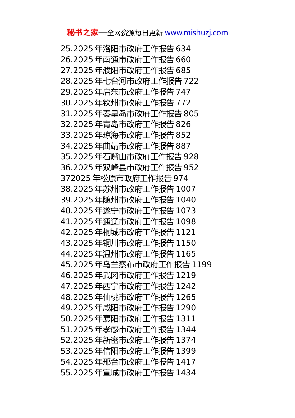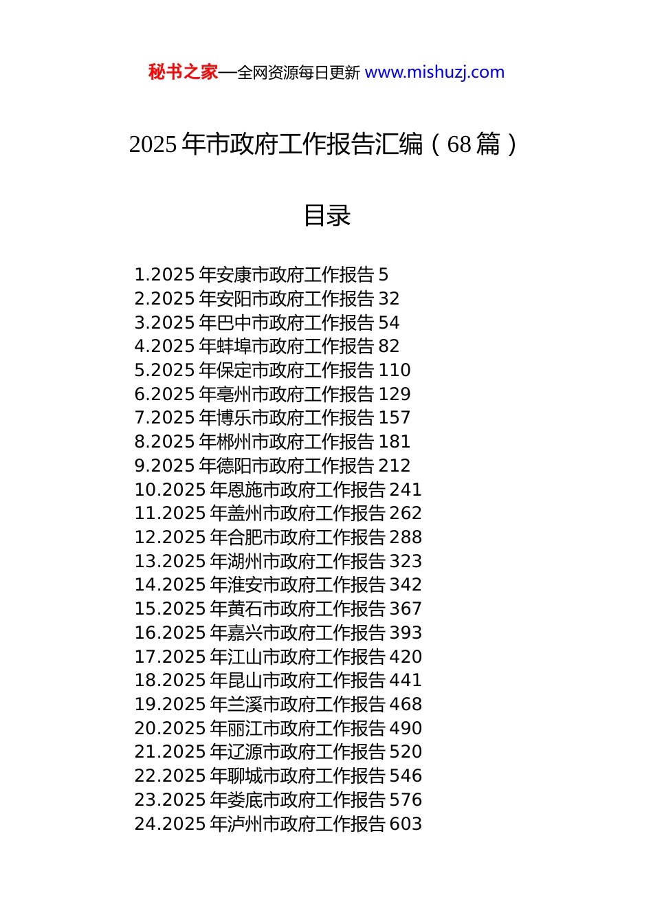 秘书之家—全网资源每日更新 www.mishuzj.com2025 年市政府工作报告汇编(68 篇)目录1.2025 年安康市政府工作报告 52.2025 年安阳市政府工作报告 323.2025 年巴中市政府工作报告 544.2025 年蚌埠市政府工作报告 825.2025 年保定市政府工作报告 1106.2025 年亳州市政府工作报告 1297.2025 年博乐市政府工作报告 1578.2025 年郴州市政府工作报告 1819.2025 年德阳市政府工作报告 21210.2025 年恩施市政府工作报告 24111.2025 年盖州市政府工作报告 26212.2025 年合肥市政府工作报告 28813.2025 年湖州市政府工作报告 32314.2025 年淮安市政府工作报告 34215.2025 年黄石市政府工作报告 36716.2025 年嘉兴市政府工作报告 39317.2025 年江山市政府工作报告 42018.2025 年昆山市政府工作报告 44119.2025 年兰溪市政府工作报告 46820.2025 年丽江市政府工作报告 49021.2025 年辽源市政府工作报告 52022.2025 年聊城市政府工作报告 54623.2025 年娄底市政府工作报告 57624.2025 年泸州市政府工作报告 603秘书之家—全网资源每日更新 www.mishuzj.com25.2025 年洛阳市政府工作报告 63426.2025 年南通市政府工作报告 66027.2025 年濮阳市政府工作报告 68528.2025 年七台河市政府工作报告 72229.2025 年启东市政府工作报告 74730.2025 年钦州市政府工作报告 77231.2025 年秦皇岛市政府工作报告 80532.2025 年青岛市政府工作报告 82633.2025 年琼海市政府工作报告 85234.2025 年曲靖市政府工作报告 88735.2025 年石嘴山市政府工作报告 92836.2025 年双峰县市政府工作报告 952372025 年松原市政府工作报告 97438.2025 年苏州市政府工作报告 100739.2025 年随州市政府工作报告 104040.2025 年遂宁市政府工作报告 107341.2025 年通辽市政府工作报告 109842.2025 年桐城市政府工作报告 112143.2025 年铜川市政府工作报告 115044.2025 年温州市政府工作报告 116545.2025 年乌兰察布市政府工作报告 119946.2025 年武冈市政府工作报告 121947.2025 年西宁市政府工作报告 124248.2025 年仙桃市政府工作报告 126549.2025 年咸阳市政府工作报告 129050.2025 年襄阳市政府工作报告 131151.2025 年孝感市政府工作报告 134452.2025 年新密市政府工作报告 137453.2025 年信阳市政府工作报告 139954.2025 年邢台市政府工作报告 141755.2025 年宣城市政府工作报告 1434秘书之家—全网资源每日更新 www.mishuzj.com56.2025 年延安市政府工作报告 145957.2025 年义乌市政府工作报告 148458.2025 年永城市政府工作报告 151059.2025 年扎兰屯市政府工作报告 153460.2025 年张家港市政府工作报告 155661.2025 年张家口市政府工作报告 158062.2025 年长沙市政府工作报告 160063.2025 年肇庆市政府工作报告 163364.2025 年镇江市政府工作报告 166865.2025 年郑州市政府工作报告 169466.2025 年舟山市政府工作报告 172967.2025 年资阳市政府工作报告 175168.2025 年遵义市政府工作报告 17752025 年安康市政府工作报告各位代表:现在,我代表市人民政府向大会报告工作,请予审议,并请市政协委员和其他列席人员提出意见。一、2024 年工作回顾去年是安康高质量发展固本强基、蓄势提速的关键一年。我们坚持改革破题、创新聚力、实干奋进,各项工作从点线发力迈向全面提升。全市地区生产总值增长 6%,一般公共预算收支分别增长 7.6%、5.7%,城镇和农村居民人均可支配收入分别增长 5%、7.2%。(一)强调度稳增长,经济运行回升向好。调动一切积极因素,正向发力对冲下行压力。项目投资支撑有力。加强项目“谋、投、建、管、用”全生命周期管理,30 个省级、382 个市级重点项目年度投资 80.3 亿元、577.9 亿元,秘书之家—全网资源每日更新 www.mishuzj.com分别完成计划任务的 138.3%、111.4%。西渝高铁、恒河水库等重大项目加快推进,太伦新材料、生活垃圾焚烧发电等 256 个产业项目建成投运。新谋划储备项目 1837 个,投资体量 3872 亿元。项目建设带动...