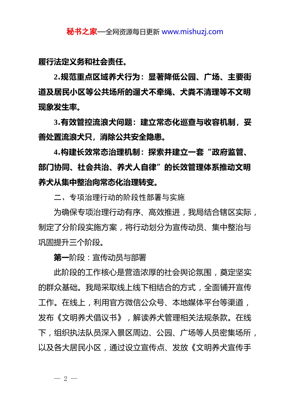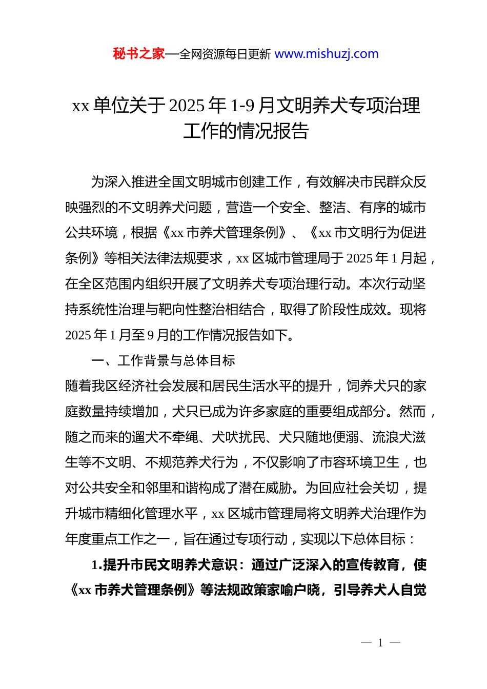 秘书之家—全网资源每日更新 www.mishuzj.comxx 单位关于 2025 年 1-9 月文明养犬专项治理工作的情况报告为深入推进全国文明城市创建工作,有效解决市民群众反映强烈的不文明养犬问题,营造一个安全、整洁、有序的城市公共环境,根据《xx 市养犬管理条例》、《xx 市文明行为促进条例》等相关法律法规要求,xx 区城市管理局于 2025 年 1 月起,在全区范围内组织开展了文明养犬专项治理行动。本次行动坚持系统性治理与靶向性整治相结合,取得了阶段性成效。现将2025 年 1 月至 9 月的工作情况报告如下。一、工作背景与总体目标随着我区经济社会发展和居民生活水平的提升,饲养犬只的家庭数量持续增加,犬只已成为许多家庭的重要组成部分。然而,随之而来的遛犬不牵绳、犬吠扰民、犬只随地便溺、流浪犬滋生等不文明、不规范养犬行为,不仅影响了市容环境卫生,也对公共安全和邻里和谐构成了潜在威胁。为回应社会关切,提升城市精细化管理水平,xx 区城市管理局将文明养犬治理作为年度重点工作之一,旨在通过专项行动,实现以下总体目标:1.提升市民文明养犬意识:通过广泛深入的宣传教育,使《xx 市养犬管理条例》等法规政策家喻户晓,引导养犬人自觉— 1 —秘书之家—全网资源每日更新 www.mishuzj.com履行法定义务和社会责任。2.规范重点区域养犬行为:显著降低公园、广场、主要街道及居民小区等公共场所的遛犬不牵绳、犬粪不清理等不文明现象发生率。3.有效管控流浪犬问题:建立常态化巡查与收容机制,妥善处置流浪犬只,消除公共安全隐患。4.构建长效常态治理机制:探索并建立一套“政府监管、部门协同、社会共治、养犬人自律”的长效管理体系推动文明养犬从集中整治向常态化治理转变。二、专项治理行动的阶段性部署与实施为确保专项治理行动有序、高效推进,我局结合辖区实际,制定了分阶段实施方案,将行动划分为宣传动员、集中整治与巩固提升三个阶段。第一阶段:宣传动员与部署此阶段的工作核心是营造浓厚的社会舆论氛围,奠定坚实的群众基础。我局采取线上线下相结合的方式,全面铺开宣传工作。在线上,利用官方微信公众号、本地媒体平台等渠道,发布《文明养犬倡议书》,解读养犬管理相关法规条款。在线下,组织执法队员深入景区周边、公园、广场等人员密集场所,以及各大居民小区,通过设立宣传点、发放《文明养犬宣传手— 2 —秘书之家—全网资源每日更新 www.mishuzj.com册》、现场讲解等形式,向市民详细阐述犬只登记、强制免疫、法律责任及违规处罚标准等关键内容。据统计,此阶段共计发放宣传资料超过 8000 份,开展集中宣传活动 15 场次,有效提升了市民对文明养犬重要性的认识。第二阶段:集中排查与整治在前期宣传铺垫的基础上,我局转入集中整治阶段,以“宣传引导+日常巡查+集中整治”的组合拳模式,对不文明养犬行为进行重点治理(源文件)。一是聚焦重点时段与区域。针对不文明遛犬行为多发于清晨和傍晚的特点,我局启动了“黎明和黄昏行动”,于每日早6:00 至 8:00 和晚 6:30 至 8:30 两个时段,组织执法力量在重点区域进行机动巡查与定点值守。二是强化联合执法力度。针对流浪犬抓捕、犬吠扰民等治理难点,我局第一执法中队联合局养犬管理办公室,开展“拉网式”巡查行动(源文件),对发现的无主犬、流浪犬进行及时捕捉,并按照《xx 市收容暂扣犬只实施细则》的要求,将其安全送往市级指定的犬只收容站进行妥善安置。三是严格依法查处违规行为。巡查中,执法人员坚持教育劝导与依法处罚相结合的原则。对于初次违规且情节轻微的行为,以劝导教育为主;但对于遛犬不牵绳、纵容犬只随地便溺— 3 —秘书之家—全网资源每日更新 www.mishuzj.com且不清理等行为,经劝导后拒不改正的,则依据《xx 市文明行为促进条例》等法规,果断开具罚单,予以行政处罚。这一举措有效强化了法律的威慑力。第三阶段:巩固提升与长效管理进入 9 月,专项行动重心逐步转向成果巩固和长效机制建设。我局持续保持日常巡查力度不减,严防不文明养犬行为反弹回潮。同时,积极总结前期工作经验,着手研究制定《xx 区文明养犬长效管理...