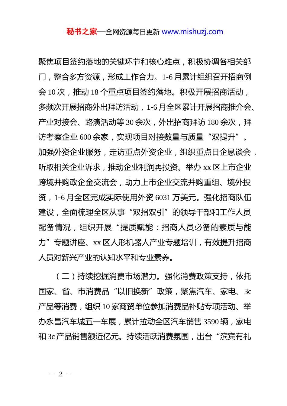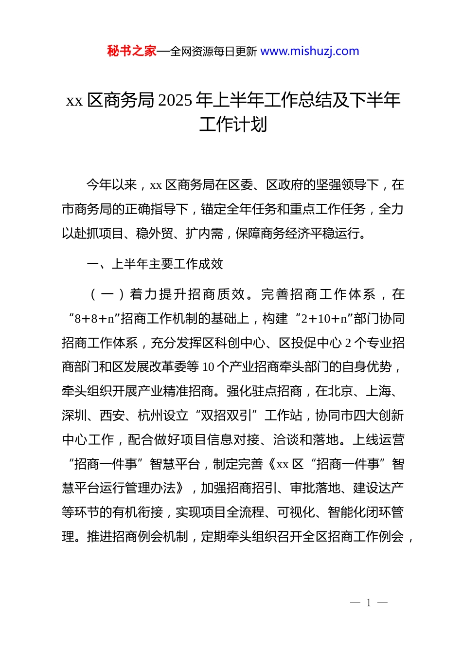 秘书之家—全网资源每日更新 www.mishuzj.comxx 区商务局 2025 年上半年工作总结及下半年工作计划今年以来,xx 区商务局在区委、区政府的坚强领导下,在市商务局的正确指导下,锚定全年任务和重点工作任务,全力以赴抓项目、稳外贸、扩内需,保障商务经济平稳运行。一、上半年主要工作成效( 一 ) 着 力 提 升 招 商 质 效 。 完 善 招 商 工 作 体 系 , 在“8+8+n”招商工作机制的基础上,构建“2+10+n”部门协同招商工作体系,充分发挥区科创中心、区投促中心 2 个专业招商部门和区发展改革委等 10 个产业招商牵头部门的自身优势,牵头组织开展产业精准招商。强化驻点招商,在北京、上海、深圳、西安、杭州设立“双招双引”工作站,协同市四大创新中心工作,配合做好项目信息对接、洽谈和落地。上线运营“招商一件事”智慧平台,制定完善《xx 区“招商一件事”智慧平台运行管理办法》,加强招商招引、审批落地、建设达产等环节的有机衔接,实现项目全流程、可视化、智能化闭环管理。推进招商例会机制,定期牵头组织召开全区招商工作例会,— 1 —秘书之家—全网资源每日更新 www.mishuzj.com聚焦项目签约落地的关键环节和核心难点,积极协调各相关部门,整合多方资源,形成工作合力。1-6 月累计组织召开招商例会 10 次,推动 18 个重点项目签约落地。积极开展招商活动,多频次开展招商外出拜访活动,1-6 月全区累计开展招商推介会、产业对接会、路演活动等 30 余次,外出招商拜访 180 余次,拜访考察企业 600 余家,实现项目对接数量与质量“双提升”。加强外资企业服务,走访重点外资企业,组织重点日企恳谈会,听取相关企业诉求,推动企业利润再投资。举办 xx 区上市企业跨境并购政企金交流会,助力上市企业交流并购重组、境外投资,1-6 月全区完成实际使用外资 6031 万美元。强化招商队伍建设,全面梳理全区从事“双招双引”的领导干部和工作人员配备情况,组织开展“提质赋能:招商人员必备的素质与能力”专题讲座、xx 区人形机器人产业专题培训,有效提升招商人员对新兴产业的认知水平和专业素养。(二)持续挖掘消费市场潜力。强化消费政策支持,依托国家、省、市消费品“以旧换新”政策,聚焦汽车、家电、3c产品等消费,组织 10 家商贸单位参加消费品补贴专项活动、举办永昌汽车城五一车展,累计拉动全区汽车销售 3590 辆,家电和 3c 产品销售额近亿元。持续活跃消费氛围,出台“滨宾有礼— 2 —秘书之家—全网资源每日更新 www.mishuzj.com巳巳如意”促消费若干措施,做强“苏超票根经济”,拉动汽车、餐饮消费近 10 亿元。1-6 月,全区实现社会消费品零售总额 209.3 亿元,同比增长 5.6%;完成批发业销售额 543.6 亿元,同比增长 9.5%,零售业销售额 166 亿元,同比增长 10.4%。营造融合消费场景,充分利用赛事、景区等资源禀赋,联动“女王跑”举办龙头渚商文旅体运动市集,在雪浪山生态园开展“我和春天有个约会”文旅市集,紧抓“苏超”赛事热度举办“滨”纷好车燃擎苏超万达广场微巡展活动,形成“商文旅体”跨界融合的消费场景。策划开展“商务惠民促消费‘供’聚仙河迎新春”年货集市、“金蛇昂首闹元宵同心共绘运河湾”元宵市集、第七届“双品网购节”全国启动仪式等线上线下融合的促消费活动。引育新消费业态,推动盒马区域总部签约,小米汽车五湖大道店、荟品仓融创茂店顺利开业,完善新零售业态布局;引导商业综合体引进柳真真、海屿季、倒倒满火塘等特色餐饮、文化体验首店,形成“首发首秀+场景营造”的消费新地标。完成溪南农贸市场、洪桥集贸市场改造提升,打造“干净、智能、便民”的现代化农贸市场;西园社区、隐秀苑社区、溪南社区 3 个社区纳入 2025 年“一刻钟便民生活圈”试点项目库。— 3 —秘书之家—全网资源每日更新 www.mishuzj.com(三)对外贸易承压前行。优化稳外贸保障举措,密切关注国际贸易形势,深入了解企业订单、关税影响等情况,开展多轮调研摸底,强化分析研判。建立重点外贸企业服务机制,储备当前稳外贸稳就业的政策措施,积极帮助企业应对...