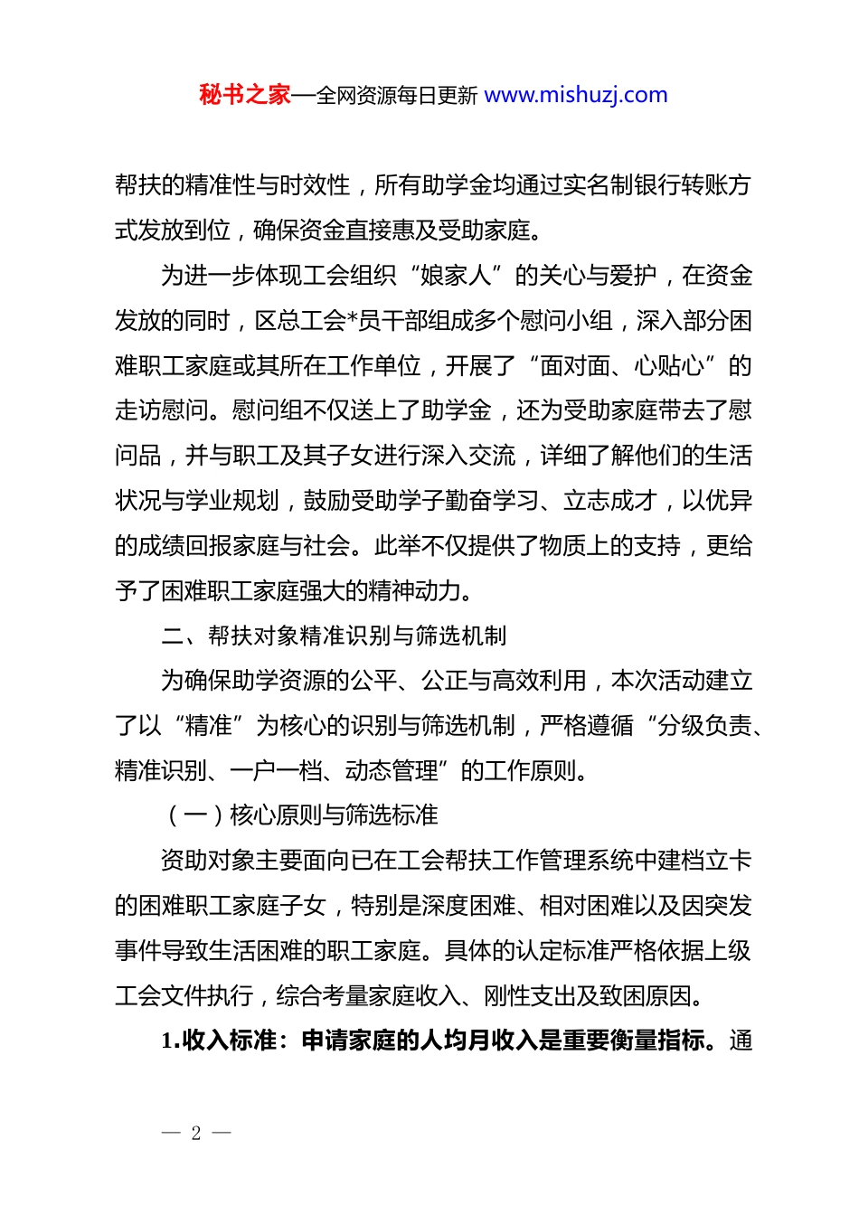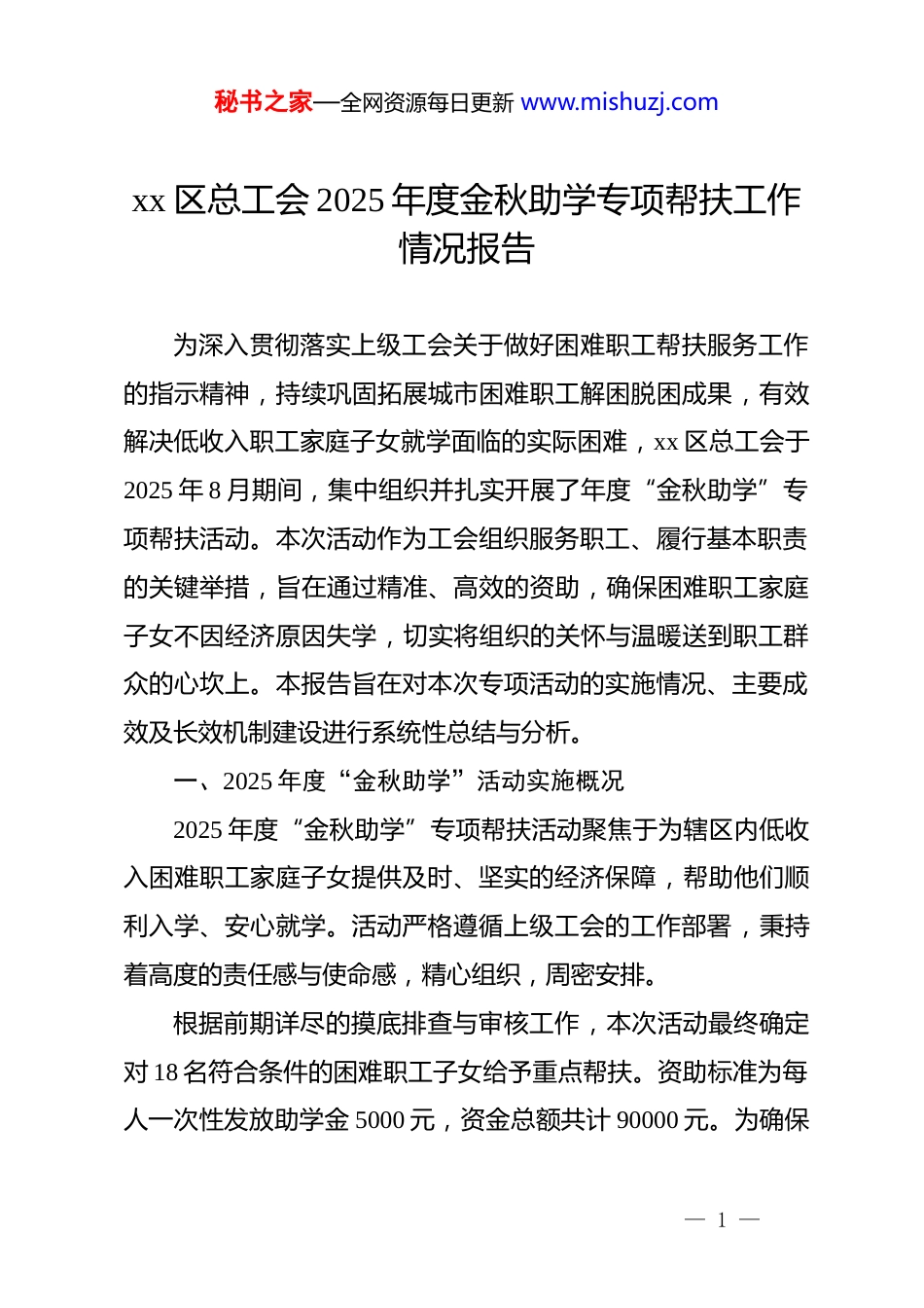 秘书之家—全网资源每日更新 www.mishuzj.comxx 区总工会 2025 年度金秋助学专项帮扶工作情况报告为深入贯彻落实上级工会关于做好困难职工帮扶服务工作的指示精神,持续巩固拓展城市困难职工解困脱困成果,有效解决低收入职工家庭子女就学面临的实际困难,xx 区总工会于2025 年 8 月期间,集中组织并扎实开展了年度“金秋助学”专项帮扶活动。本次活动作为工会组织服务职工、履行基本职责的关键举措,旨在通过精准、高效的资助,确保困难职工家庭子女不因经济原因失学,切实将组织的关怀与温暖送到职工群众的心坎上。本报告旨在对本次专项活动的实施情况、主要成效及长效机制建设进行系统性总结与分析。一、2025 年度“金秋助学”活动实施概况2025 年度“金秋助学”专项帮扶活动聚焦于为辖区内低收入困难职工家庭子女提供及时、坚实的经济保障,帮助他们顺利入学、安心就学。活动严格遵循上级工会的工作部署,秉持着高度的责任感与使命感,精心组织,周密安排。根据前期详尽的摸底排查与审核工作,本次活动最终确定对 18 名符合条件的困难职工子女给予重点帮扶。资助标准为每人一次性发放助学金 5000 元,资金总额共计 90000 元。为确保— 1 —秘书之家—全网资源每日更新 www.mishuzj.com帮扶的精准性与时效性,所有助学金均通过实名制银行转账方式发放到位,确保资金直接惠及受助家庭。为进一步体现工会组织“娘家人”的关心与爱护,在资金发放的同时,区总工会*员干部组成多个慰问小组,深入部分困难职工家庭或其所在工作单位,开展了“面对面、心贴心”的走访慰问。慰问组不仅送上了助学金,还为受助家庭带去了慰问品,并与职工及其子女进行深入交流,详细了解他们的生活状况与学业规划,鼓励受助学子勤奋学习、立志成才,以优异的成绩回报家庭与社会。此举不仅提供了物质上的支持,更给予了困难职工家庭强大的精神动力。二、帮扶对象精准识别与筛选机制为确保助学资源的公平、公正与高效利用,本次活动建立了以“精准”为核心的识别与筛选机制,严格遵循“分级负责、精准识别、一户一档、动态管理”的工作原则。(一)核心原则与筛选标准资助对象主要面向已在工会帮扶工作管理系统中建档立卡的困难职工家庭子女,特别是深度困难、相对困难以及因突发事件导致生活困难的职工家庭。具体的认定标准严格依据上级工会文件执行,综合考量家庭收入、刚性支出及致困原因。1.收入标准:申请家庭的人均月收入是重要衡量指标。通— 2 —秘书之家—全网资源每日更新 www.mishuzj.com常情况下,家庭人均月收入需低于 xx 市城镇居民最低生活保障标准的特定倍数,例如 2 倍以内。在计算收入时,会科学扣除因重大疾病、子女教育等产生的必要刚性支出,以更准确地反映家庭的实际可支配收入水平。2.学段范围:工会助学资金重点用于非义务教育阶段。资助对象主要为子女在全日制普通高中、中等职业学校、普通高等院校就读的困难职工家庭。3.排除条款:为确保公平,活动明确规定了不予纳入帮扶范围的情形,包括但不限于:家庭拥有 2 套及以上住房或高档非经营性车辆、子女在高收费私立学校就读、在申请过程中提供虚假材料或信息不实等情况。(二)严格的认定与审核流程帮扶对象的产生过程是一个自下而上、层层审核、公开透明的规范化流程。1.个人申请与基层核查:符合条件的职工需向所在单位的基层工会提交书面申请,并附上身份证、户口簿、收入证明、录取通知书或在校证明、重大疾病诊断书等相关证明材料。基层工会接到申请后,作为第一责任主体,须对申请材料的真实性、完整性进行初步审核,并组织人员进行入户调查与走访核实,全面了解申请家庭的实际生活状况。— 3 —秘书之家—全网资源每日更新 www.mishuzj.com2.公开公示与民主评议:经基层工会初步核实,拟上报的困难职工家庭名单必须在其所在单位或社区进行公示,公示期不少于 5 个工作日。公示内容包括职工姓名、致困原因、拟帮扶类别等,并附上监督举报电话,主动接受广大职工群众的监督。3.区级复审与建档备案:公示无异议后,基层工会将完整的申报材料上报至区总工会职工服务中心。区总工会组织专人...