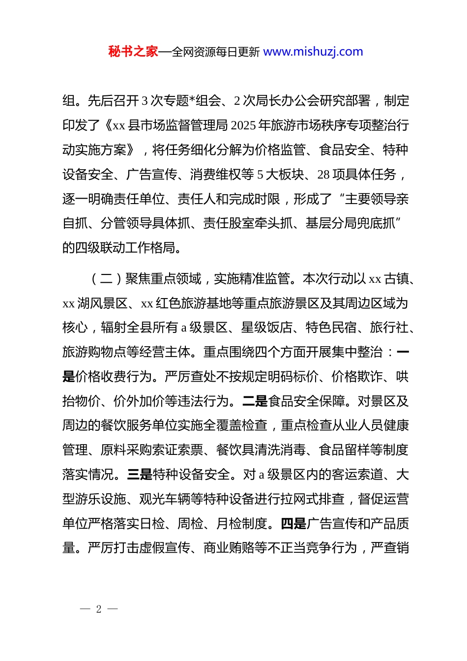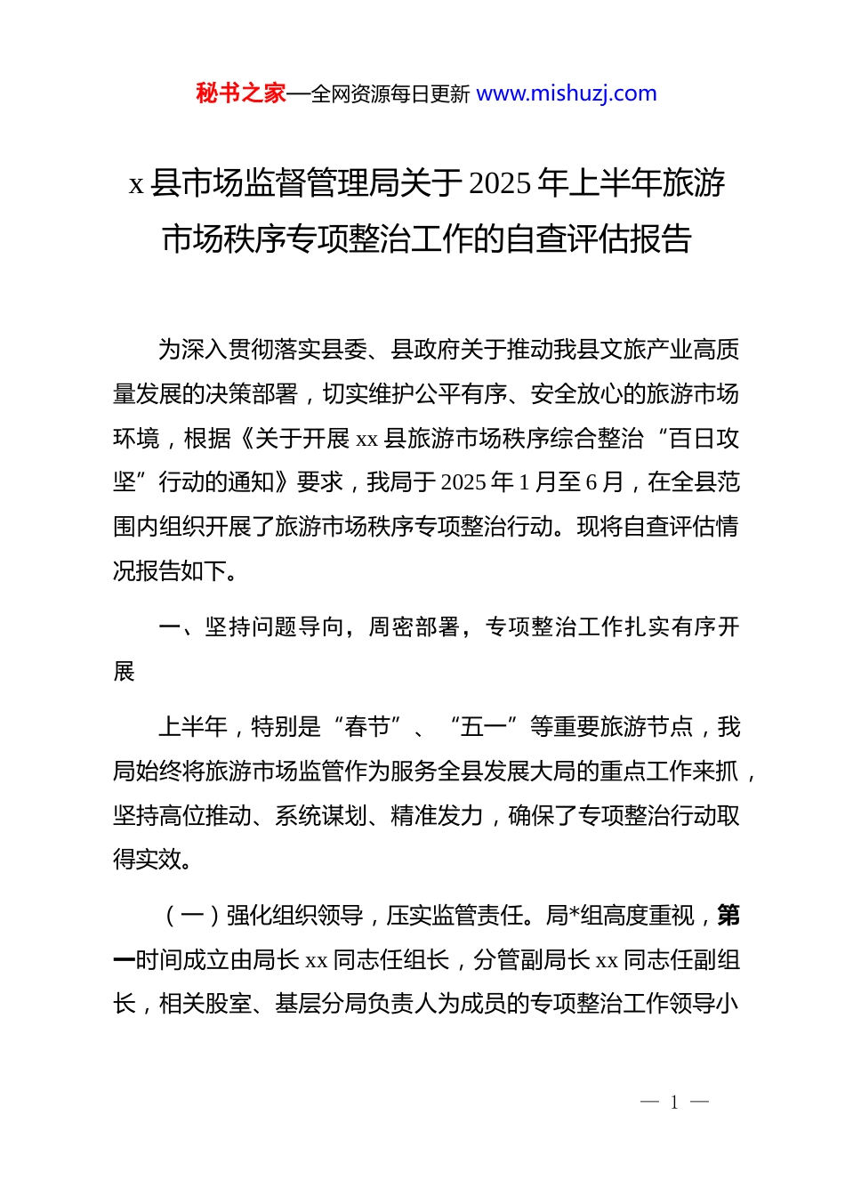 秘书之家—全网资源每日更新 www.mishuzj.comx 县市场监督管理局关于 2025 年上半年旅游市场秩序专项整治工作的自查评估报告为深入贯彻落实县委、县政府关于推动我县文旅产业高质量发展的决策部署,切实维护公平有序、安全放心的旅游市场环境,根据《关于开展 xx 县旅游市场秩序综合整治“百日攻坚”行动的通知》要求,我局于 2025 年 1 月至 6 月,在全县范围内组织开展了旅游市场秩序专项整治行动。现将自查评估情况报告如下。一、坚持问题导向,周密部署,专项整治工作扎实有序开展上半年,特别是“春节”、“五一”等重要旅游节点,我局始终将旅游市场监管作为服务全县发展大局的重点工作来抓,坚持高位推动、系统谋划、精准发力,确保了专项整治行动取得实效。(一)强化组织领导,压实监管责任。局*组高度重视,第一时间成立由局长 xx 同志任组长,分管副局长 xx 同志任副组长,相关股室、基层分局负责人为成员的专项整治工作领导小— 1 —秘书之家—全网资源每日更新 www.mishuzj.com组。先后召开 3 次专题*组会、2 次局长办公会研究部署,制定印发了《xx 县市场监督管理局 2025 年旅游市场秩序专项整治行动实施方案》,将任务细化分解为价格监管、食品安全、特种设备安全、广告宣传、消费维权等 5 大板块、28 项具体任务,逐一明确责任单位、责任人和完成时限,形成了“主要领导亲自抓、分管领导具体抓、责任股室牵头抓、基层分局兜底抓”的四级联动工作格局。(二)聚焦重点领域,实施精准监管。本次行动以 xx 古镇、xx 湖风景区、xx 红色旅游基地等重点旅游景区及其周边区域为核心,辐射全县所有 a 级景区、星级饭店、特色民宿、旅行社、旅游购物点等经营主体。重点围绕四个方面开展集中整治:一是价格收费行为。严厉查处不按规定明码标价、价格欺诈、哄抬物价、价外加价等违法行为。二是食品安全保障。对景区及周边的餐饮服务单位实施全覆盖检查,重点检查从业人员健康管理、原料采购索证索票、餐饮具清洗消毒、食品留样等制度落实情况。三是特种设备安全。对 a 级景区内的客运索道、大型游乐设施、观光车辆等特种设备进行拉网式排查,督促运营单位严格落实日检、周检、月检制度。四是广告宣传和产品质量。严厉打击虚假宣传、商业贿赂等不正当竞争行为,严查销— 2 —秘书之家—全网资源每日更新 www.mishuzj.com售假冒伪劣、“三无”旅游产品的违法行为。(三)创新监管方式,提升整治效能。一是推行“智慧+”监管。依托“xx 智慧监管平台”,对全县 13 家重点旅游餐饮单位实现“互联网+明厨亮灶”全覆盖,消费者可通过手机 app实时查看后厨操作。运用大数据技术对网络订餐、在线旅游平台的价格和宣传行为进行线上监测,上半年共监测相关信息 3.5万余条,发现并处置问题线索 112 条。二是深化部门协同。加强与文旅、公安、交通、应急等部门的协作配合,建立信息共享、线索移送、联合执法“三项机制”。上半年共组织开展跨部门联合执法 16 次,联合约谈经营主体 32 家,有效形成了监管合力。三是强化信用约束。将旅游市场经营主体的行政处罚、抽查检查结果等信息,依法依规记于其名下,并同步推送至“信用 xx”平台,实施信用分级分类监管,让守信者无事不扰,让失信者寸步难行。二、坚持标本兼治,综合施策,旅游市场环境实现显著提升通过为期半年的专项整治,我县旅游市场存在的突出问题得到有效遏制,市场秩序、消费环境、安全水平和品牌形象得到全面提升。— 3 —秘书之家—全网资源每日更新 www.mishuzj.com(一)市场秩序更加规范,公平竞争环境持续向好。上半年,我局共出动执法人员 860 余人次,检查各类旅游市场经营主体 1527 家次,现场责令整改问题 315 个。立案查处旅游市场相关违法案件 48 起,罚没款共计 32.6 万元。其中,查处价格违法案件 11 起,不正当竞争及虚假宣传案件 8 起,销售不合格产品案件 17 起。通过高压严打,有效震慑了违法经营行为,旅游市场“宰客”、“欺客”等乱象得到根本性扭转。据县文旅局数据,上半年我县接待游客数量同比增长 21%,但旅游消费投诉量同...