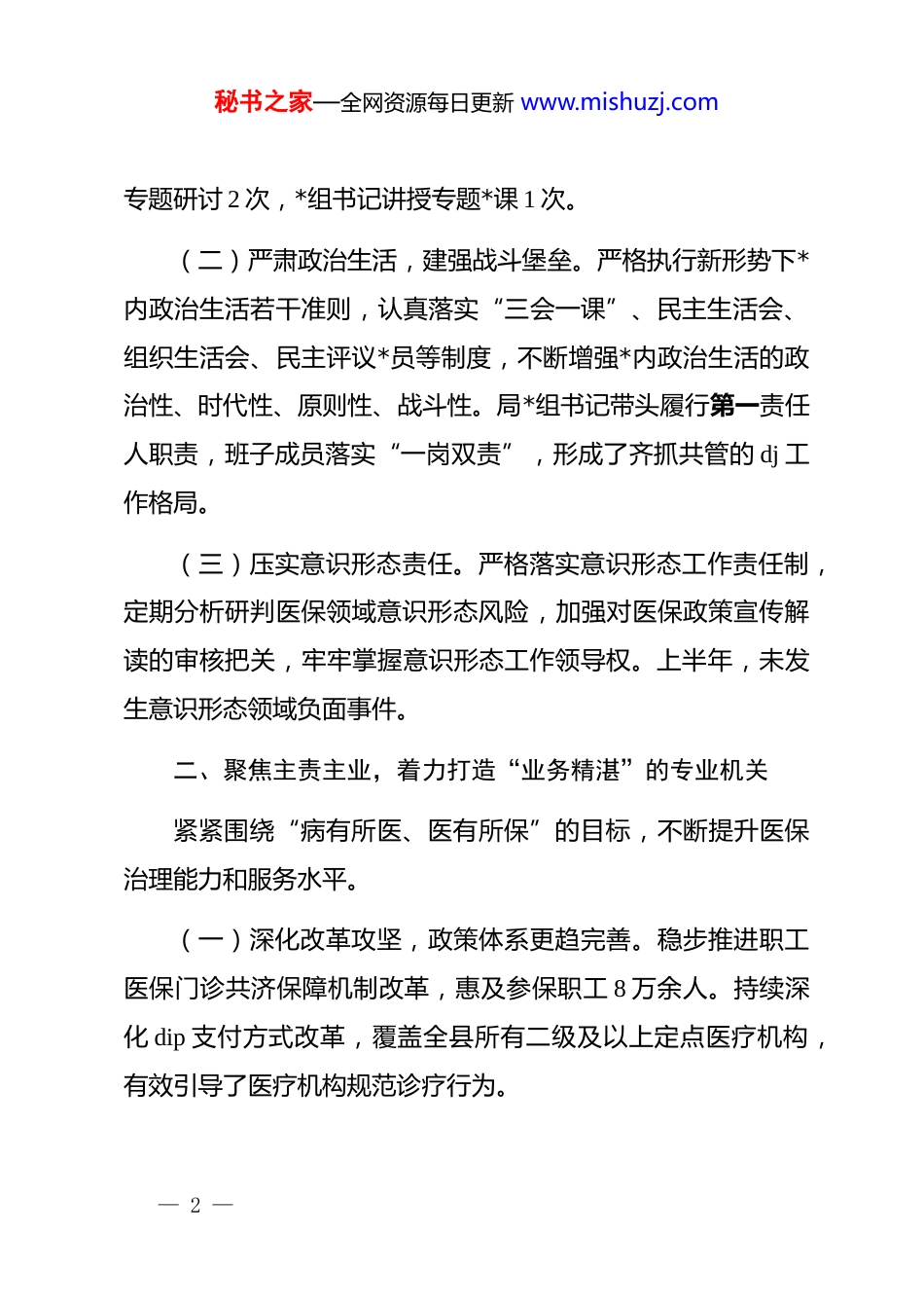 秘书之家—全网资源每日更新 www.mishuzj.comx 县医疗保障局关于推进模范机关创建工作情况的汇报县委直属机关工委:自模范机关创建工作开展以来,县医保局*组深入学习贯彻******关于加强和改进机关*的建设的重要论述,严格按照县委的部署要求,以创建“让*放心、人民满意”的模范机关为目标,坚持以 dj 为引领,聚焦主责主业,着力在“政治强、业务精、作风硬、服务优”上下功夫,推动机关*的建设和医保事业发展深度融合、互促共进。现将有关情况汇报如下。一、坚持政治统领,着力锻造“对*忠诚”的政治机关始终把*的政治建设摆在首位,教育引导全局*员干部深刻领悟“两个确立”的决定性意义,坚决做到“两个维护”。(一)强化理论武装,筑牢思想根基。严格落实“第一议题”制度,将******关于医疗保障工作的****批示精神作为*组会、理论学习中心组学习的首要内容。扎实开展 dj 学习教育,通过举办读书班、专题*课、警示教育等方式,引导*员干部学纪、知纪、明纪、守纪。上半年,开展中心组学习 6 次,组织— 1 —秘书之家—全网资源每日更新 www.mishuzj.com专题研讨 2 次,*组书记讲授专题*课 1 次。(二)严肃政治生活,建强战斗堡垒。严格执行新形势下*内政治生活若干准则,认真落实“三会一课”、民主生活会、组织生活会、民主评议*员等制度,不断增强*内政治生活的政治性、时代性、原则性、战斗性。局*组书记带头履行第一责任人职责,班子成员落实“一岗双责”,形成了齐抓共管的 dj 工作格局。(三)压实意识形态责任。严格落实意识形态工作责任制,定期分析研判医保领域意识形态风险,加强对医保政策宣传解读的审核把关,牢牢掌握意识形态工作领导权。上半年,未发生意识形态领域负面事件。二、聚焦主责主业,着力打造“业务精湛”的专业机关紧紧围绕“病有所医、医有所保”的目标,不断提升医保治理能力和服务水平。(一)深化改革攻坚,政策体系更趋完善。稳步推进职工医保门诊共济保障机制改革,惠及参保职工 8 万余人。持续深化 dip 支付方式改革,覆盖全县所有二级及以上定点医疗机构,有效引导了医疗机构规范诊疗行为。— 2 —秘书之家—全网资源每日更新 www.mishuzj.com(二)强化基金监管,守护群众“救命钱”。坚持“零容忍”态度,保持打击欺诈骗保高压态势。上半年,联合卫健、公安、市场监管等部门开展专项检查,检查定点医药机构 150家,处理违规机构 35 家,追回医保基金及违约金共计 125 万元,公开曝光典型案例 2 起,有力震慑了违法违规行为。(三)优化经办服务,群众办事更加便捷。深化“放管服”改革,大力推进医保服务“网上办、掌上办”。目前,25项高频医保服务事项实现全程网办。在乡镇便民服务中心设立医保服务窗口,将 15 项服务事项下沉基层,打通服务群众“最后一公里”。三、加强作风建设,着力锤炼“纪律严明”的廉洁机关持之以恒正风肃纪,营造风清气正的政治生态。(一)深入纠治“四风”。严格落实中央八项规定及其实施细则精神,紧盯重要节点、重点领域,加强监督检查,坚决防止“四风”问题反弹回潮。大力整治形式主义、官僚主义,精简会议文件,切实为基层减负。(二)加强廉政风险防控。全面梳理医保经办、基金监管、药品采购等关键环节的廉政风险点,制定防控措施,建立健全— 3 —秘书之家—全网资源每日更新 www.mishuzj.com内控制度,用制度管权、管事、管人。(三)加强廉洁文化建设。深入开展“廉洁医保”文化创建活动,通过设立廉政文化墙、组织观看廉政电影、开展家风家教活动等方式,引导*员干部筑牢拒腐防变的思想道德防线。四、践行初心使命,着力建设“人民满意”的服务机关始终站稳人民立场,用心用情用力解决群众急难愁盼问题。(一)开展“医保守护”*员志愿服务。组织*员干部深入社区、企业、乡村,开展医保政策宣传、业务咨询、现场办理等志愿服务活动。上半年,共开展活动 20 余场次,服务群众3000 余人。(二)优化异地就医结算服务。简化异地就医备案流程,扩大跨省异地就医直接结算覆盖范围,有效解决了群众异地就医“跑腿垫资”难题。(三)用心解决群众诉求。畅通...