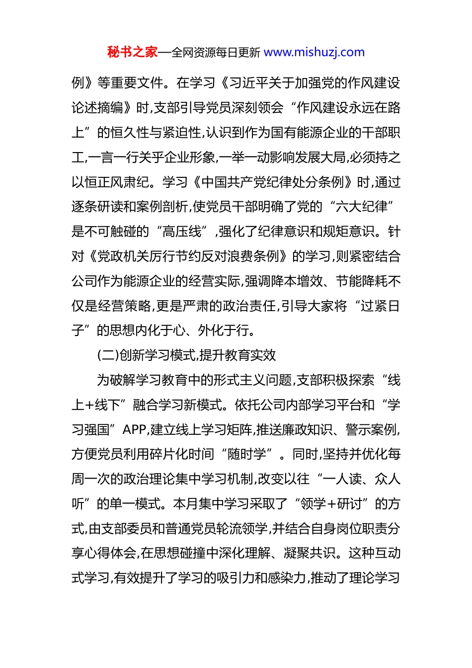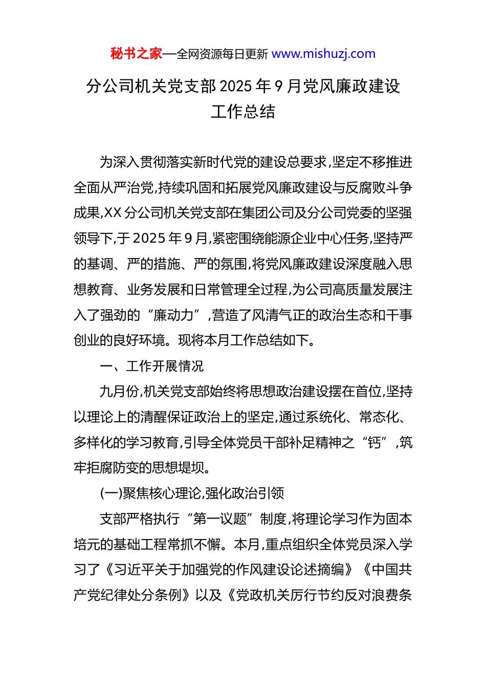 秘书之家—全网资源每日更新 www.mishuzj.com分公司机关党支部 2025 年 9 月党风廉政建设工作总结 为深入贯彻落实新时代党的建设总要求,坚定不移推进全面从严治党,持续巩固和拓展党风廉政建设与反腐败斗争成果,XX 分公司机关党支部在集团公司及分公司党委的坚强领导下,于 2025 年 9 月,紧密围绕能源企业中心任务,坚持严的基调、严的措施、严的氛围,将党风廉政建设深度融入思想教育、业务发展和日常管理全过程,为公司高质量发展注入了强劲的“廉动力”,营造了风清气正的政治生态和干事创业的良好环境。现将本月工作总结如下。一、工作开展情况九月份,机关党支部始终将思想政治建设摆在首位,坚持以理论上的清醒保证政治上的坚定,通过系统化、常态化、多样化的学习教育,引导全体党员干部补足精神之“钙”,筑牢拒腐防变的思想堤坝。(一)聚焦核心理论,强化政治引领支部严格执行“第一议题”制度,将理论学习作为固本培元的基础工程常抓不懈。本月,重点组织全体党员深入学习了《习近平关于加强党的作风建设论述摘编》《中国共产党纪律处分条例》以及《党政机关厉行节约反对浪费条秘书之家—全网资源每日更新 www.mishuzj.com例》等重要文件。在学习《习近平关于加强党的作风建设论述摘编》时,支部引导党员深刻领会“作风建设永远在路上”的恒久性与紧迫性,认识到作为国有能源企业的干部职工,一言一行关乎企业形象,一举一动影响发展大局,必须持之以恒正风肃纪。学习《中国共产党纪律处分条例》时,通过逐条研读和案例剖析,使党员干部明确了党的“六大纪律”是不可触碰的“高压线”,强化了纪律意识和规矩意识。针对《党政机关厉行节约反对浪费条例》的学习,则紧密结合公司作为能源企业的经营实际,强调降本增效、节能降耗不仅是经营策略,更是严肃的政治责任,引导大家将“过紧日子”的思想内化于心、外化于行。(二)创新学习模式,提升教育实效为破解学习教育中的形式主义问题,支部积极探索“线上+线下”融合学习新模式。依托公司内部学习平台和“学习强国”APP,建立线上学习矩阵,推送廉政知识、警示案例,方便党员利用碎片化时间“随时学”。同时,坚持并优化每周一次的政治理论集中学习机制,改变以往“一人读、众人听”的单一模式。本月集中学习采取了“领学+研讨”的方式,由支部委员和普通党员轮流领学,并结合自身岗位职责分享心得体会,在思想碰撞中深化理解、凝聚共识。这种互动式学习,有效提升了学习的吸引力和感染力,推动了理论学习秘书之家—全网资源每日更新 www.mishuzj.com从“要我学”向“我要学”的转变。(三)丰富教育载体,营造廉洁氛围支部坚持将廉洁文化建设融入日常、抓在经常。本月,分层级、全覆盖组织签订了《廉政承诺书》,从公司领导班子成员到各部门关键岗位人员,再到一线普通党员,层层递交承诺,公开接受监督,将廉洁自律的责任压实到每一个人肩上。同时,深入开展廉洁谈话活动,支部书记与部门负责人、重点岗位人员进行了一对一的提醒谈话,旨在抓早抓小、防微杜渐。为增强警示教育的直观性和冲击力,支部集中组织观看了《守护白衬衫》《收与守》《答好人生题走好人生路》等廉洁微视频。这些短片以真实案例为蓝本,生动展现了腐败行为对个人前途、家庭幸福和事业发展的毁灭性打击,特别是“白衬衫”从洁白到染尘的比喻,深刻警示党员干部要珍惜职业生涯,扣好廉洁从业的“第一粒扣子”。此外,公司办公区的公示栏每周更新一期廉洁警示短句海报,如“清廉是福,贪欲是祸”“廉洁从业,行稳致远”等,通过这种潜移默化的方式,让廉洁理念时时在线、处处可见,营造了“以廉为荣、以贪为耻”的浓厚氛围。(四)存在问题及改进方向在肯定成绩的同时,支部也清醒地认识到工作中存在的秘书之家—全网资源每日更新 www.mishuzj.com不足。借鉴相关调研成果分析,当前工作主要存在以下短板:一是学习教育形式的创新力度仍需加大,虽然采用了“线上+线下”模式,但在调动全员参与的互动性、趣味性上还有提升空间,可以适度引入知识竞赛、辩论赛等更具活力的形式。二是党建工作与业务工作的融合深度有待加强,部分党员在思想深处仍存在“两张皮”现象,未能完全将党风廉政建设的要求转化为推动业务发展...