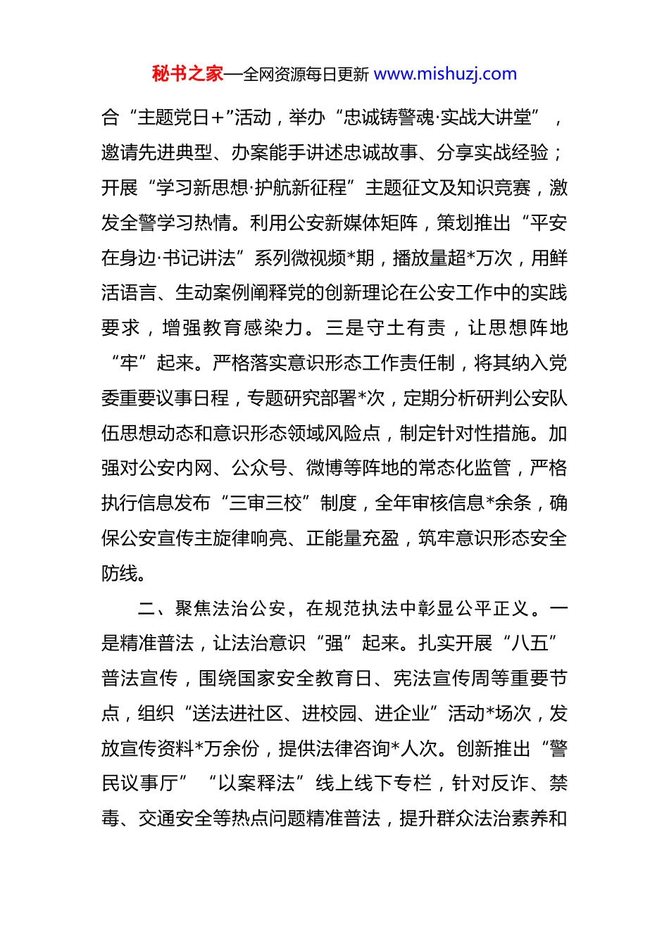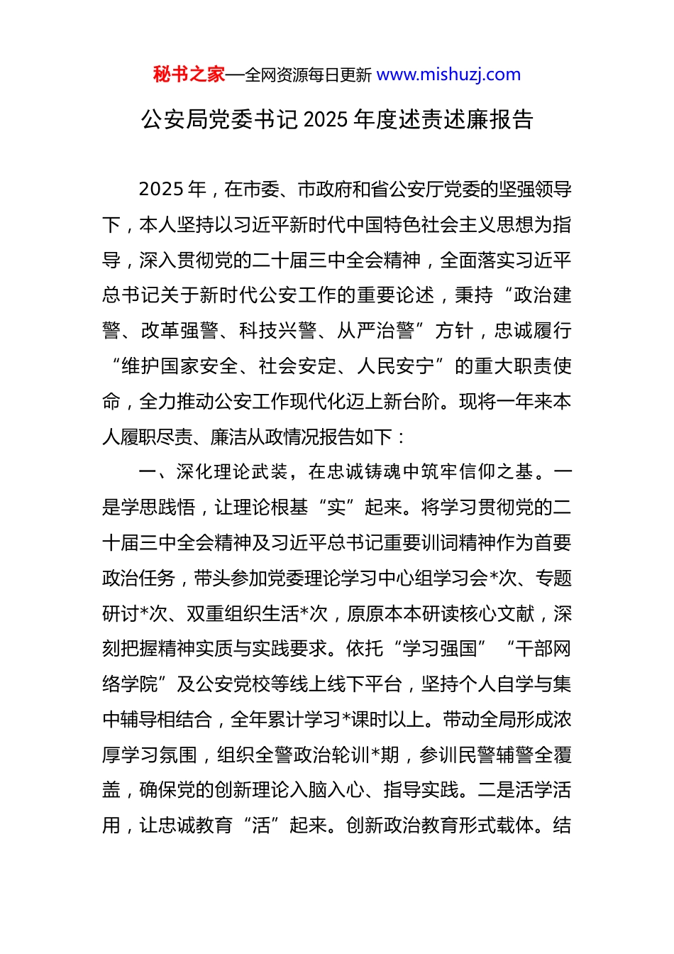 秘书之家—全网资源每日更新 www.mishuzj.com公安局党委书记 2025 年度述责述廉报告 2025 年,在市委、市政府和省公安厅党委的坚强领导下,本人坚持以习近平新时代中国特色社会主义思想为指导,深入贯彻党的二十届三中全会精神,全面落实习近平总书记关于新时代公安工作的重要论述,秉持“政治建警、改革强警、科技兴警、从严治警”方针,忠诚履行“维护国家安全、社会安定、人民安宁”的重大职责使命,全力推动公安工作现代化迈上新台阶。现将一年来本人履职尽责、廉洁从政情况报告如下:一、深化理论武装,在忠诚铸魂中筑牢信仰之基。一是学思践悟,让理论根基“实”起来。将学习贯彻党的二十届三中全会精神及习近平总书记重要训词精神作为首要政治任务,带头参加党委理论学习中心组学习会*次、专题研讨*次、双重组织生活*次,原原本本研读核心文献,深刻把握精神实质与实践要求。依托“学习强国”“干部网络学院”及公安党校等线上线下平台,坚持个人自学与集中辅导相结合,全年累计学习*课时以上。带动全局形成浓厚学习氛围,组织全警政治轮训*期,参训民警辅警全覆盖,确保党的创新理论入脑入心、指导实践。二是活学活用,让忠诚教育“活”起来。创新政治教育形式载体。结秘书之家—全网资源每日更新 www.mishuzj.com合“主题党日+”活动,举办“忠诚铸警魂·实战大讲堂”,邀请先进典型、办案能手讲述忠诚故事、分享实战经验;开展“学习新思想·护航新征程”主题征文及知识竞赛,激发全警学习热情。利用公安新媒体矩阵,策划推出“平安在身边·书记讲法”系列微视频*期,播放量超*万次,用鲜活语言、生动案例阐释党的创新理论在公安工作中的实践要求,增强教育感染力。三是守土有责,让思想阵地“牢”起来。严格落实意识形态工作责任制,将其纳入党委重要议事日程,专题研究部署*次,定期分析研判公安队伍思想动态和意识形态领域风险点,制定针对性措施。加强对公安内网、公众号、微博等阵地的常态化监管,严格执行信息发布“三审三校”制度,全年审核信息*余条,确保公安宣传主旋律响亮、正能量充盈,筑牢意识形态安全防线。二、聚焦法治公安,在规范执法中彰显公平正义。一是精准普法,让法治意识“强”起来。扎实开展“八五”普法宣传,围绕国家安全教育日、宪法宣传周等重要节点,组织“送法进社区、进校园、进企业”活动*场次,发放宣传资料*万余份,提供法律咨询*人次。创新推出“警民议事厅”“以案释法”线上线下专栏,针对反诈、禁毒、交通安全等热点问题精准普法,提升群众法治素养和秘书之家—全网资源每日更新 www.mishuzj.com安全防范能力。二是规范用权,让执法过程“明”起来。严格执行重大执法决策、疑难复杂案件集体讨论制度,全年主持审议重大案件*起、重要警务决策*项,确保决策合法合规、程序正当。深化执法权力运行机制改革,完善执法办案管理中心“一站式”运行模式。全面推行法律顾问和公职律师制度,重大决策、规范性文件起草、合同审核等必经法律审查,全年法律顾问提供意见*次,有效防控执法风险。三是严格监督,让执法质量“优”起来。完善执法监督管理机制,强化对警情处置、受案立案、调查取证、强制措施等重点环节的闭环式监督。全年开展常态化网上执法巡查*次、重点案件评查*起、执法专项督察*轮,发现问题*个,全部督促整改到位。严格落实执法过错责任追究制度,倒逼执法规范化水平持续提升。行政复议被维持率/行政诉讼胜诉率达*%。三、扛牢主责主业,在护航发展中展现硬核担当。一是打防并举,让平安基石“稳”起来。始终保持对各类突出违法犯罪的高压震慑态势。深入推进扫黑除恶常态化,打掉涉黑恶团伙*个。重拳打击电信网络诈骗等新型犯罪,破获案件*起,为群众止损*亿元。持续整治“黄赌毒”“盗抢骗”“食药环”等突出治安问题,有效净化社会环境。严密社会面整体防控,优化巡防机制,“两抢一盗”秘书之家—全网资源每日更新 www.mishuzj.com发案率同比下降*%。全年刑事案件破案率提升至*%,治安案件查处率*%,公众安全感满意度达*%,位居全省前列。二是锐意改革,让警务效能“升”起来。全面推进公安改革系统性重塑。深化“...