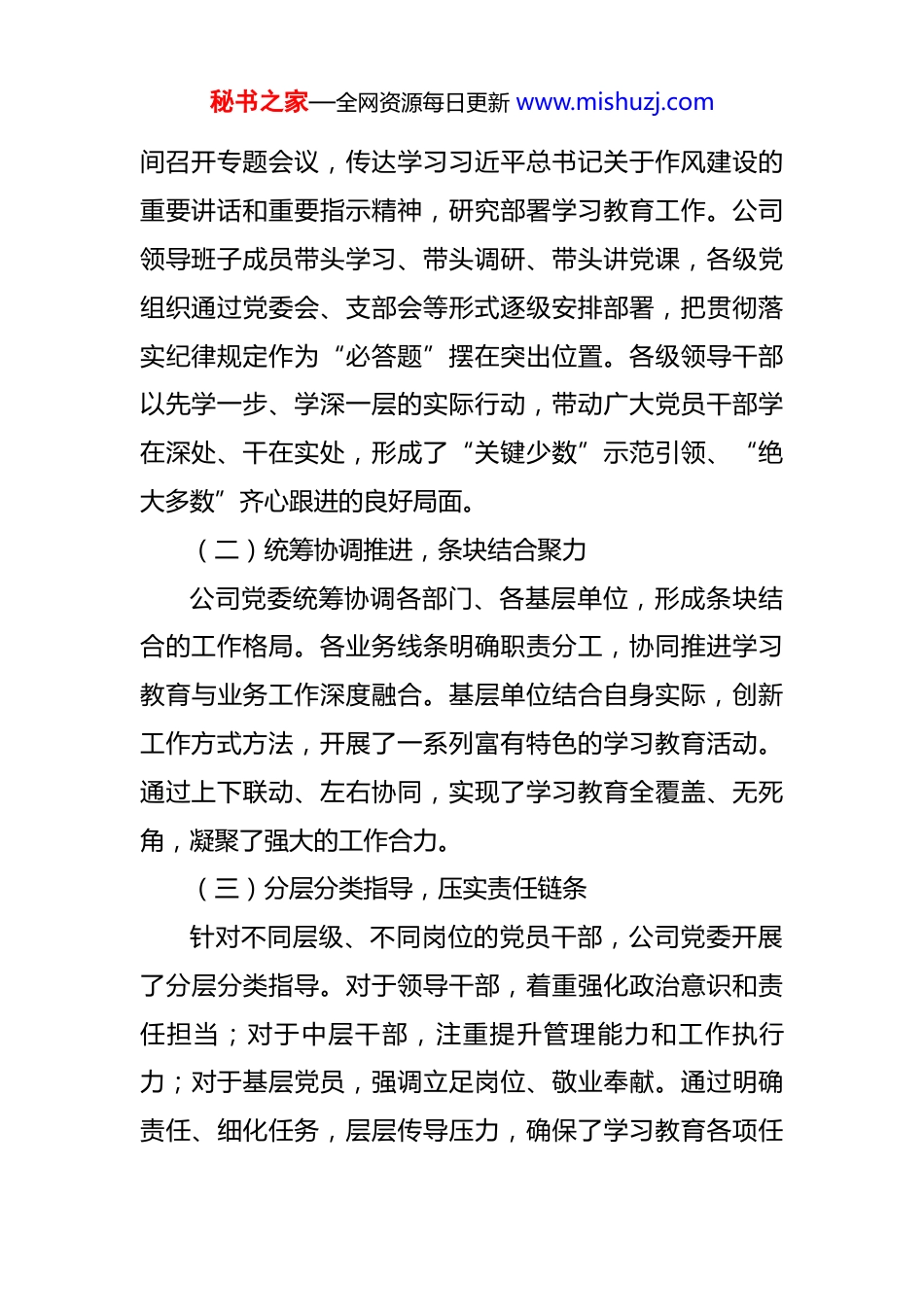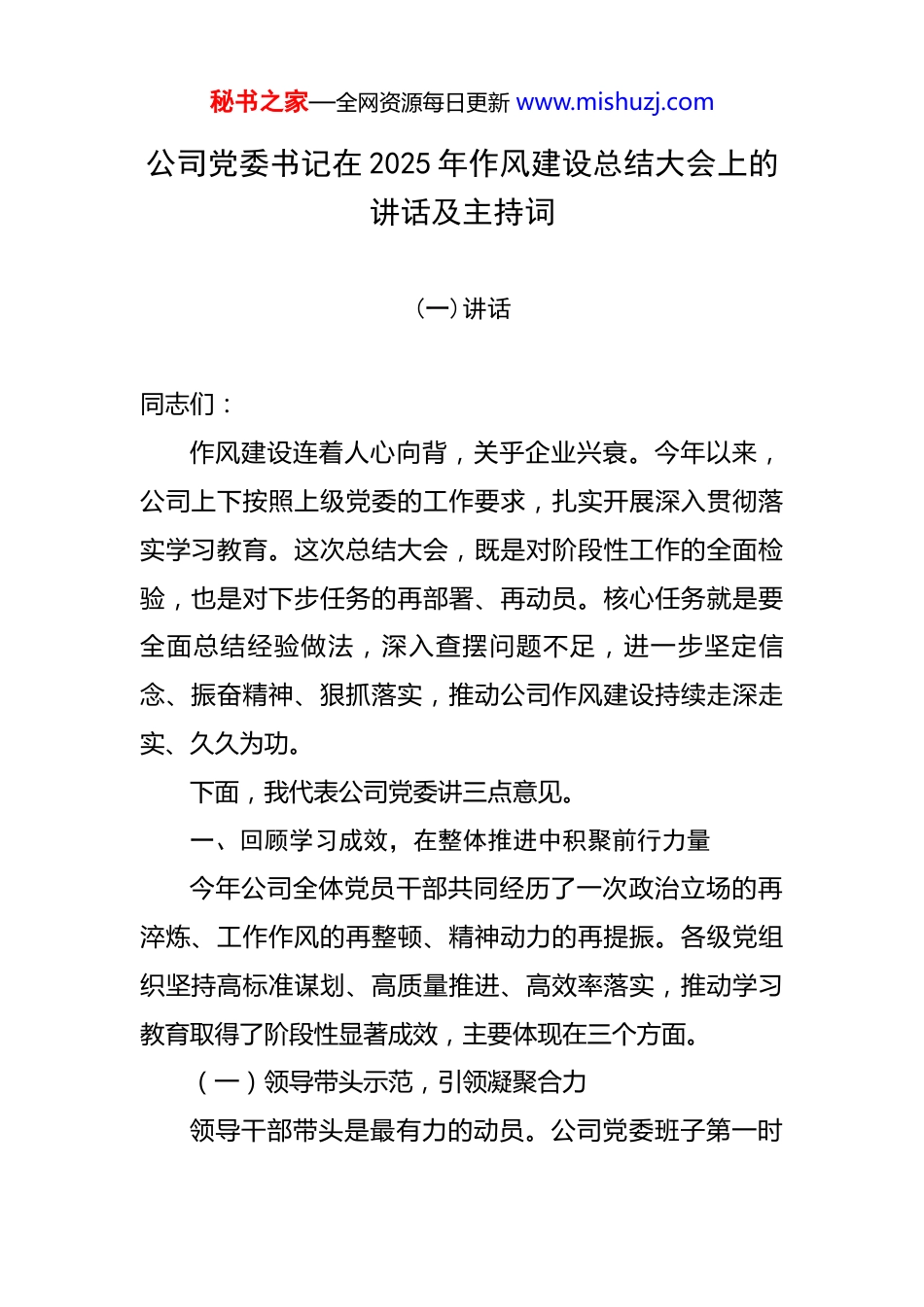 秘书之家—全网资源每日更新 www.mishuzj.com公司党委书记在 2025 年作风建设总结大会上的讲话及主持词 (一)讲话同志们:作风建设连着人心向背,关乎企业兴衰。今年以来,公司上下按照上级党委的工作要求,扎实开展深入贯彻落实学习教育。这次总结大会,既是对阶段性工作的全面检验,也是对下步任务的再部署、再动员。核心任务就是要全面总结经验做法,深入查摆问题不足,进一步坚定信念、振奋精神、狠抓落实,推动公司作风建设持续走深走实、久久为功。下面,我代表公司党委讲三点意见。一、回顾学习成效,在整体推进中积聚前行力量今年公司全体党员干部共同经历了一次政治立场的再淬炼、工作作风的再整顿、精神动力的再提振。各级党组织坚持高标准谋划、高质量推进、高效率落实,推动学习教育取得了阶段性显著成效,主要体现在三个方面。(一)领导带头示范,引领凝聚合力领导干部带头是最有力的动员。公司党委班子第一时秘书之家—全网资源每日更新 www.mishuzj.com间召开专题会议,传达学习习近平总书记关于作风建设的重要讲话和重要指示精神,研究部署学习教育工作。公司领导班子成员带头学习、带头调研、带头讲党课,各级党组织通过党委会、支部会等形式逐级安排部署,把贯彻落实纪律规定作为“必答题”摆在突出位置。各级领导干部以先学一步、学深一层的实际行动,带动广大党员干部学在深处、干在实处,形成了“关键少数”示范引领、“绝大多数”齐心跟进的良好局面。(二)统筹协调推进,条块结合聚力公司党委统筹协调各部门、各基层单位,形成条块结合的工作格局。各业务线条明确职责分工,协同推进学习教育与业务工作深度融合。基层单位结合自身实际,创新工作方式方法,开展了一系列富有特色的学习教育活动。通过上下联动、左右协同,实现了学习教育全覆盖、无死角,凝聚了强大的工作合力。(三)分层分类指导,压实责任链条针对不同层级、不同岗位的党员干部,公司党委开展了分层分类指导。对于领导干部,着重强化政治意识和责任担当;对于中层干部,注重提升管理能力和工作执行力;对于基层党员,强调立足岗位、敬业奉献。通过明确责任、细化任务,层层传导压力,确保了学习教育各项任秘书之家—全网资源每日更新 www.mishuzj.com务落到实处。二、深化学习教育,在入脑入心中筑牢思想之基深入贯彻落实学习教育只有入脑入心,才能见行见效。公司各级党组织把深入学习习近平总书记关于作风建设的重要论述作为根本遵循,把原原本本学规定、结合实际促转化作为重要抓手,不断丰富内容、创新方式、提升质效,切实把学习教育成果转化为坚定的政治自觉和实际行动。(一)原原本本学规定,学深悟透精髓组织党员干部原原本本学习纪律规定以及公司相关规章制度。通过集中学习、个人自学、专题研讨等多种形式,引导党员干部深刻领会规定的精神实质和具体要求。广大党员干部认真研读文件,撰写学习心得,做到学深悟透、融会贯通。(二)警示教育常提醒,以案为鉴守底线开展常态化警示教育活动,通过组织观看警示教育片、参观廉政教育基地、剖析典型案例等方式,引导党员干部以案为鉴,自觉坚守纪律底线。同时,加强对重点领域、关键岗位的廉政风险防控,建立健全防范机制,有效预防腐败问题的发生。(三)多元培训强解读,学思践悟促提升秘书之家—全网资源每日更新 www.mishuzj.com举办各类专题培训、讲座,邀请专家学者进行深入解读,帮助党员干部准确把握纪律规定的内涵和要求。通过线上线下相结合的方式,拓宽学习渠道,提高学习效果。鼓励党员干部将学习成果运用到实际工作中,做到学思用贯通、知信行统一。三、聚焦长效机制,在担当实干中推动作风转变作风建设只有进行时,没有完成时。深入贯彻落实学习教育的最终落脚点,是要以制度固化成果、以行动推动转化,真正把好作风融入日常、落在实处,形成风清气正、干事创业的浓厚氛围。(一)坚持学以致用,将作风建设融入发展实践把贯彻落实纪律规定与公司生产经营、改革发展等各项工作紧密结合起来,以优良的作风推动工作落实。广大党员干部立足岗位,主动担当作为,积极解决工作中的重点难点问题。通过优化工作流程、...