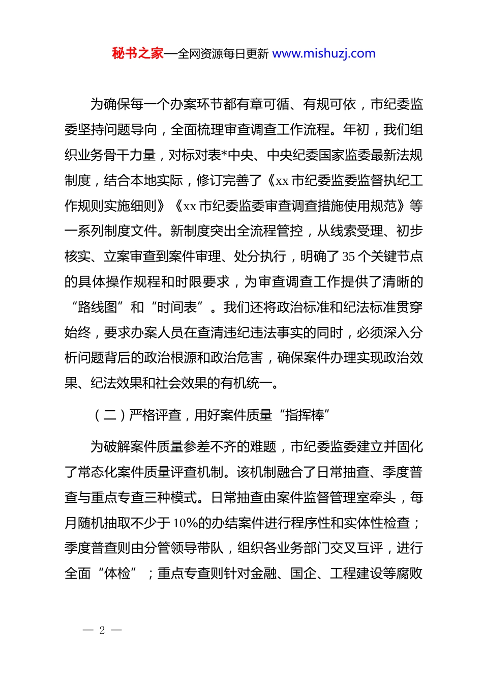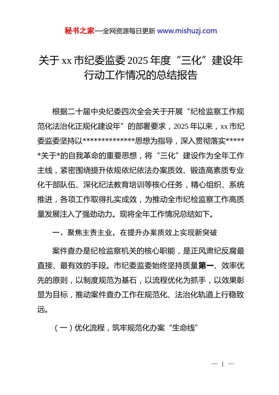 秘书之家—全网资源每日更新 www.mishuzj.com关于 xx 市纪委监委 2025 年度“三化”建设年行动工作情况的总结报告根据二十届中央纪委四次全会关于开展“纪检监察工作规范化法治化正规化建设年”的部署要求,2025 年以来,xx 市纪委监委坚持以**************思想为指导,深入贯彻落实******关于*的自我革命的重要思想,将“三化”建设作为全年工作主线,紧密围绕提升依规依纪依法办案质效、锻造高素质专业化干部队伍、深化纪法教育培训等核心任务,精心组织、系统推进,各项工作取得扎实成效,为推动全市纪检监察工作高质量发展注入了强劲动力。现将全年工作情况总结如下。一、聚焦主责主业,在提升办案质效上实现新突破案件查办是纪检监察机关的核心职能,是正风肃纪反腐最直接、最有效的手段。市纪委监委始终坚持质量第一、效率优先的原则,以制度规范为基石,以流程优化为抓手,以效果彰显为目标,推动案件查办工作在规范化、法治化轨道上行稳致远。(一)优化流程,筑牢规范化办案“生命线”— 1 —秘书之家—全网资源每日更新 www.mishuzj.com为确保每一个办案环节都有章可循、有规可依,市纪委监委坚持问题导向,全面梳理审查调查工作流程。年初,我们组织业务骨干力量,对标对表*中央、中央纪委国家监委最新法规制度,结合本地实际,修订完善了《xx 市纪委监委监督执纪工作规则实施细则》《xx 市纪委监委审查调查措施使用规范》等一系列制度文件。新制度突出全流程管控,从线索受理、初步核实、立案审查到案件审理、处分执行,明确了 35 个关键节点的具体操作规程和时限要求,为审查调查工作提供了清晰的“路线图”和“时间表”。我们还将政治标准和纪法标准贯穿始终,要求办案人员在查清违纪违法事实的同时,必须深入分析问题背后的政治根源和政治危害,确保案件办理实现政治效果、纪法效果和社会效果的有机统一。(二)严格评查,用好案件质量“指挥棒”为破解案件质量参差不齐的难题,市纪委监委建立并固化了常态化案件质量评查机制。该机制融合了日常抽查、季度普查与重点专查三种模式。日常抽查由案件监督管理室牵头,每月随机抽取不少于 10%的办结案件进行程序性和实体性检查;季度普查则由分管领导带队,组织各业务部门交叉互评,进行全面“体检”;重点专查则针对金融、国企、工程建设等腐败— 2 —秘书之家—全网资源每日更新 www.mishuzj.com易发多发领域,组织专项评查组进行深度“解剖”。截至 2025年 9 月,全市共对 280 余件已办结案件开展质量评查,发现并指出证据链不完整、定性不精准、文书制作不规范等 5 大类、120 余个具体问题。我们对评查发现的问题实行“清单化管理+台账式督办”,形成问题清单、整改清单、责任清单,书面反馈给承办部门,明确整改时限和要求,并由案管室逐项跟踪问效,确保问题整改“清仓见底”,真正让案件质量评查成为提升办案水平的有力“指挥棒”。(三)标本兼治,做深查办案件“后半篇文章”查办案件不是终点,而是实现长效治理的起点。市纪委监委坚持一体推进“三不腐”,在保持惩治腐败高压态势的同时,更加注重发挥案件查办的治本功能。我们严格执行“一案一剖析”“一案一建议”“一案一警示”制度。对于查结的每一起重大典型案件,都由办案组深入剖析案件发生的深层次原因、制度漏洞和监管短板,形成高质量的案件剖析报告。在此基础上,向涉案单位或主管部门制发纪检监察建议书,提出具体、可操作的整改意见。2025 年以来,全市纪检监察机关共制发纪检监察建议书 68 份,推动相关单位完善制度机制 80 余项。为防止建议书“一发了之”,我们还建立了整改情况“回头看”— 3 —秘书之家—全网资源每日更新 www.mishuzj.com机制,由监督检查室对建议书的执行落实情况进行专项督查,对整改不力、敷衍塞责的严肃追责问责,形成“查处—整改—治理—监督”的闭环效应,实现了“查处一案、警示一片、治理一域”的综合效果。二、坚持严管厚爱,在锻造纪检监察铁军上展现新作为纪检监察工作的高质量发展,关键在于建设一支政治过硬、本领高强的“铁军”队伍。市纪委监委始终将队伍建设摆在突出...