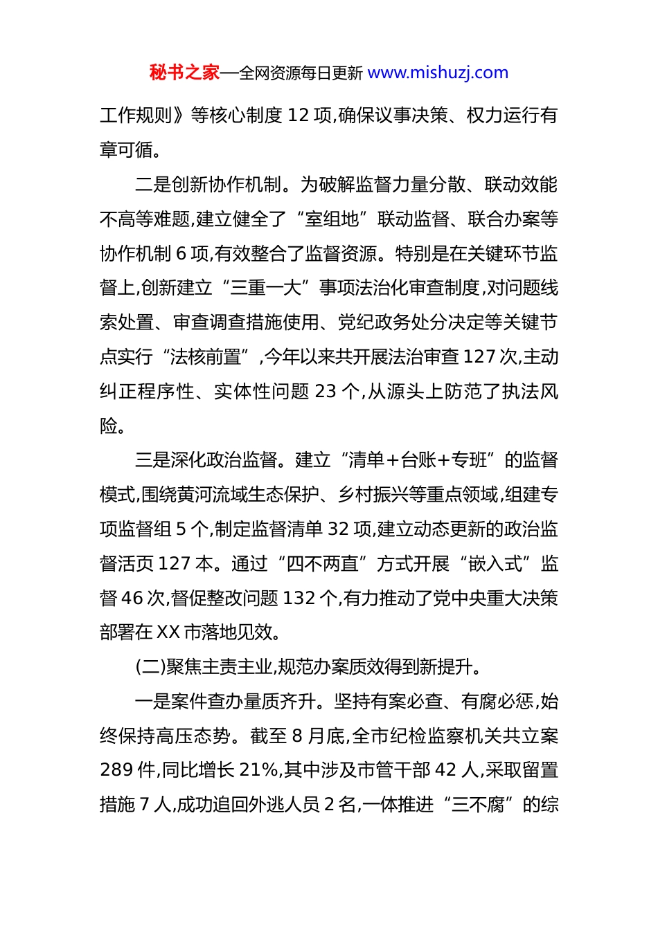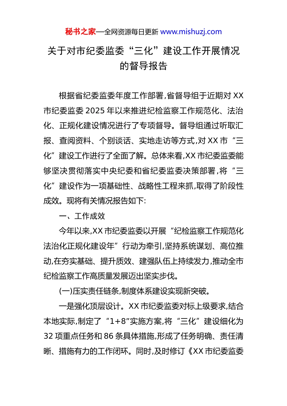 秘书之家—全网资源每日更新 www.mishuzj.com关于对市纪委监委“三化”建设工作开展情况的督导报告根据省纪委监委年度工作部署,省督导组于近期对 XX市纪委监委 2025 年以来推进纪检监察工作规范化、法治化、正规化建设情况进行了专项督导。督导组通过听取汇报、查阅资料、个别谈话、实地走访等方式,对 XX 市“三化”建设工作进行了全面了解。总体来看,XX 市纪委监委能够坚决贯彻落实中央纪委和省纪委监委决策部署,将“三化”建设作为一项基础性、战略性工程来抓,取得了阶段性成效。现将有关情况报告如下:一、工作成效今年以来,XX 市纪委监委以开展“纪检监察工作规范化法治化正规化建设年”行动为牵引,坚持系统谋划、高位推动,在夯实基础、提升质效、建强队伍上持续发力,推动全市纪检监察工作高质量发展迈出坚实步伐。(一)压实责任链条,制度体系建设实现新突破。一是强化顶层设计。XX 市纪委监委对标上级要求,结合本地实际,制定了“1+8”实施方案,将“三化”建设细化为32 项重点任务和 86 条具体措施,形成了任务明确、责任清晰、措施有力的工作闭环。同时,及时修订《XX 市纪委监委秘书之家—全网资源每日更新 www.mishuzj.com工作规则》等核心制度 12 项,确保议事决策、权力运行有章可循。二是创新协作机制。为破解监督力量分散、联动效能不高等难题,建立健全了“室组地”联动监督、联合办案等协作机制 6 项,有效整合了监督资源。特别是在关键环节监督上,创新建立“三重一大”事项法治化审查制度,对问题线索处置、审查调查措施使用、党纪政务处分决定等关键节点实行“法核前置”,今年以来共开展法治审查 127 次,主动纠正程序性、实体性问题 23 个,从源头上防范了执法风险。三是深化政治监督。建立“清单+台账+专班”的监督模式,围绕黄河流域生态保护、乡村振兴等重点领域,组建专项监督组 5 个,制定监督清单 32 项,建立动态更新的政治监督活页 127 本。通过“四不两直”方式开展“嵌入式”监督 46 次,督促整改问题 132 个,有力推动了党中央重大决策部署在 XX 市落地见效。(二)聚焦主责主业,规范办案质效得到新提升。一是案件查办量质齐升。坚持有案必查、有腐必惩,始终保持高压态势。截至 8 月底,全市纪检监察机关共立案289 件,同比增长 21%,其中涉及市管干部 42 人,采取留置措施 7 人,成功追回外逃人员 2 名,一体推进“三不腐”的综秘书之家—全网资源每日更新 www.mishuzj.com合效能持续彰显。二是数字赋能精准监督。建成“智慧纪检监察”平台,整合民生资金、公车管理等 21 类数据资源,开发运用“红黄蓝”三色预警模型。平台运行以来,累计生成异常数据预警 432 条,经核查发现有效问题线索 89 条,给予党纪政务处分 12 人,科技防腐的精准性和实效性初步显现。三是案件质量闭环管控。在全省率先探索建立“监督执纪执法质量评查体系”,制定包含 6 大项 128 条评分细则的《案件质量评查标准》,对所有办结案件实行“一案一评查、一案一反馈”。今年已评查案件 289 件,发现并督促整改程序不规范、定性不精准等问题 432 个,推动案件优良率提升至 95%,有效倒逼办案人员法治意识和程序意识的增强。(三)坚持严管厚爱,干部队伍建设展现新气象。一是实施“青廉工程”筑牢思想根基。建立“第一议题”制度,将学习贯彻习近平总书记重要讲话和指示批示精神作为常委会“首课”,全年开展专题学习 28 次。针对年轻干部,通过组织“重走长征路”红色教育、建立“导师帮带制”等方式,由班子成员与 35 岁以下年轻干部“一对一”结对,扣好廉洁从政“第一粒扣子”。二是搭建实战平台锤炼过硬本领。选派 23 名业务骨干秘书之家—全网资源每日更新 www.mishuzj.com赴省纪委监委参与粮食购销、扫黑除恶“打伞破网”等专项工作,安排 17 名干部进行为期 6 个月的全脱产轮岗交流,在实践中提升综合素养。在 2025 年全省纪检监察系统业务技能竞赛中,XX 市代表队荣获团体二等奖,3 名干部分别在笔录制作、案件分析等单项竞赛中夺魁。三是创新培训模式提升专业能力。常态化举办“纪检监察大讲堂”,邀请省内业务专家和法学教授授课 24 ...