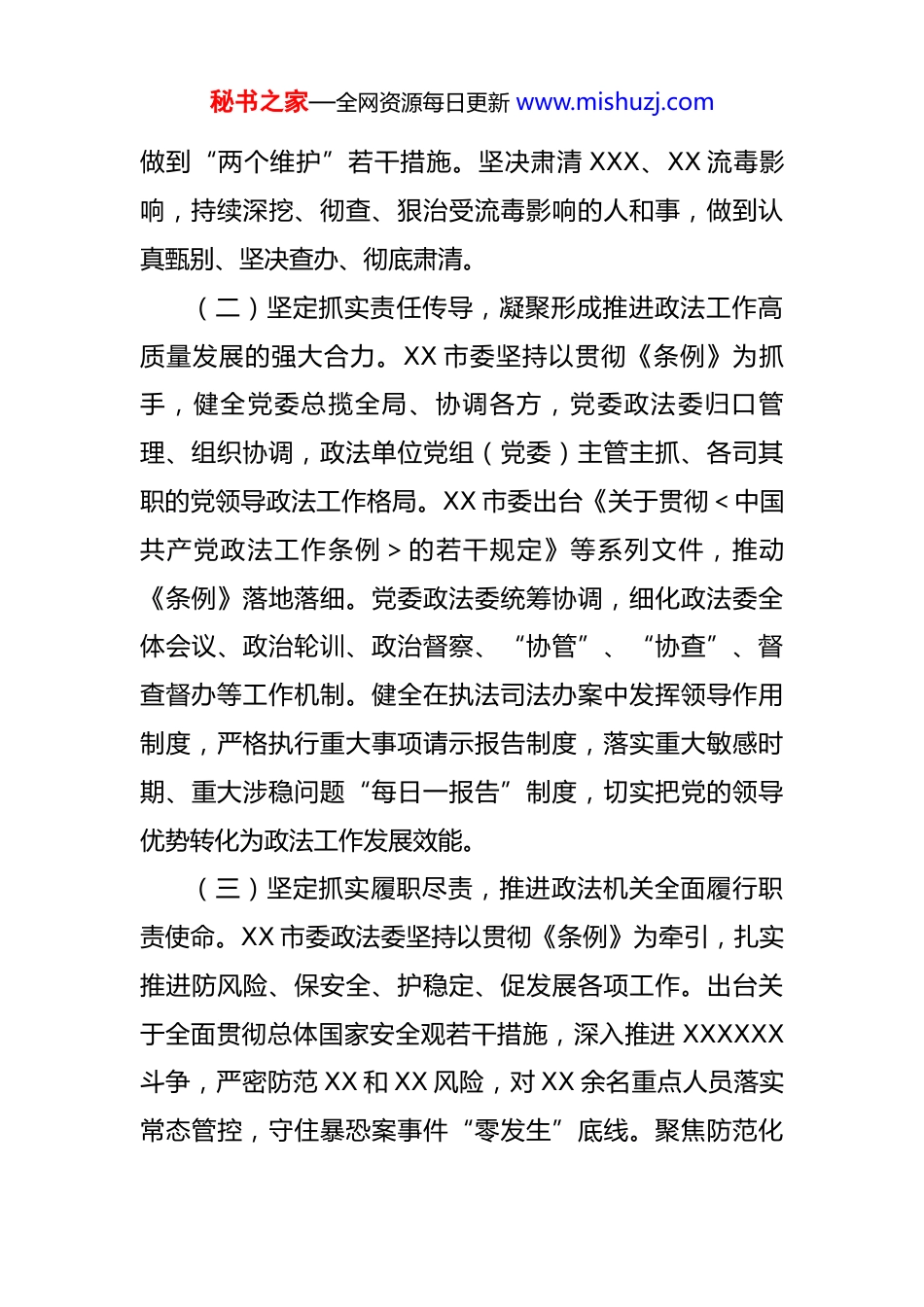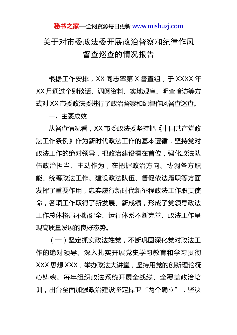 秘书之家—全网资源每日更新 www.mishuzj.com关于对市委政法委开展政治督察和纪律作风督查巡查的情况报告 根据工作安排,XX 同志率第 X 督查组,于 XXXX 年XX 月通过个别谈话、调阅资料、实地观摩、明查暗访等方式对 XX 市委政法委进行了政治督察和纪律作风督查巡查。一、主要成效从督查情况看,XX 市委政法委坚持把《中国共产党政法工作条例》作为新时代政法工作的基本遵循,坚持党对政法工作的绝对领导,把政治建设摆在首位,强化政法队伍政治担当、主动作为,在把握政治方向、协调各方职能、统筹政法工作、建设政法队伍、督促依法履职等方面发挥了重要作用,忠实履行新时代新征程政法工作职责使命,各项工作取得了新发展、新成绩,形成了党领导政法工作总体格局不断健全、运行体系不断完善、政法工作呈现高质量发展的良好态势。(一)坚定抓实政法姓党,不断巩固深化党对政法工作的绝对领导。深入扎实开展党史学习教育和学习贯彻XXX 思想 XXX,举办政法大讲堂,坚持用党的创新理论凝心铸魂。每年组织政法系统开展全战线、全覆盖政治培训,出台全面加强政治建设坚定捍卫“两个确立”,坚决秘书之家—全网资源每日更新 www.mishuzj.com做到“两个维护”若干措施。坚决肃清 XXX、XX 流毒影响,持续深挖、彻查、狠治受流毒影响的人和事,做到认真甄别、坚决查办、彻底肃清。(二)坚定抓实责任传导,凝聚形成推进政法工作高质量发展的强大合力。XX 市委坚持以贯彻《条例》为抓手,健全党委总揽全局、协调各方,党委政法委归口管理、组织协调,政法单位党组(党委)主管主抓、各司其职的党领导政法工作格局。XX 市委出台《关于贯彻<中国共产党政法工作条例>的若干规定》等系列文件,推动《条例》落地落细。党委政法委统筹协调,细化政法委全体会议、政治轮训、政治督察、“协管”、“协查”、督查督办等工作机制。健全在执法司法办案中发挥领导作用制度,严格执行重大事项请示报告制度,落实重大敏感时期、重大涉稳问题“每日一报告”制度,切实把党的领导优势转化为政法工作发展效能。(三)坚定抓实履职尽责,推进政法机关全面履行职责使命。XX 市委政法委坚持以贯彻《条例》为牵引,扎实推进防风险、保安全、护稳定、促发展各项工作。出台关于全面贯彻总体国家安全观若干措施,深入推进 XXXXXX斗争,严密防范 XX 和 XX 风险,对 XX 余名重点人员落实常态管控,守住暴恐案事件“零发生”底线。聚焦防范化秘书之家—全网资源每日更新 www.mishuzj.com解重大涉稳风险,形成“党委统领、部门齐抓,上下联动、左右协作、同频共振”的工作格局。注重源头防范化解重大群体性涉稳风险。开展法治化营商环境专项行动,持续优化法治化营商环境,重拳出击破获涉黑涉恶刑事案件 XX 起,累计打掉涉黑恶犯罪团伙 XX 个,查处涉黑涉恶腐败和“保护伞”问题 XX 件 XX 人。(四)坚定抓实过硬政法队伍建设,锻造忠诚干净担当的政法铁军。XX 市委政法把政法队伍建设作为基础性工程,坚持按照纪律部队标准实行准军事化管理,不断推进全面从严管党治警向纵深发展。XX 市委每年专题研究部署政法队伍建设工作,出台关于民主生活会督导、干部“协管”、“协查”、交流、日常管理监督等一系列配套制度文件,扎实开展政法队伍教育整顿,立案审查调查千警 XX人、留置 XX 人,形成了强有力震慑效应。持续加强纪律作风建设,XX 市委政法委牵头对 XX 个市级政法单位和 XX个区委政法委进行全覆盖式政治督察和纪律作风督查巡查,发现整改问题 XX 余个。二、存在的主要问题一是党的创新理论武装和贯彻落实中央、市委决策部署有差距。学习 XXX 思想不全面、不系统、不深入,缺乏对党的创新理论的系统研究和深刻理解,在常学常新、学秘书之家—全网资源每日更新 www.mishuzj.com深悟透上还有较大差距。理论指导实践、推动工作、破解难题的主动性和创造性发挥不够充分,在市域社会治理、服务民营企业发展等方面缺乏实用管用招法。在落实中央、市委决策部署过程中,对社会矛盾纠纷调处化解中心管理还存在薄弱环节。二是贯彻落实《条例》缺乏力度。履行《条例》规定...