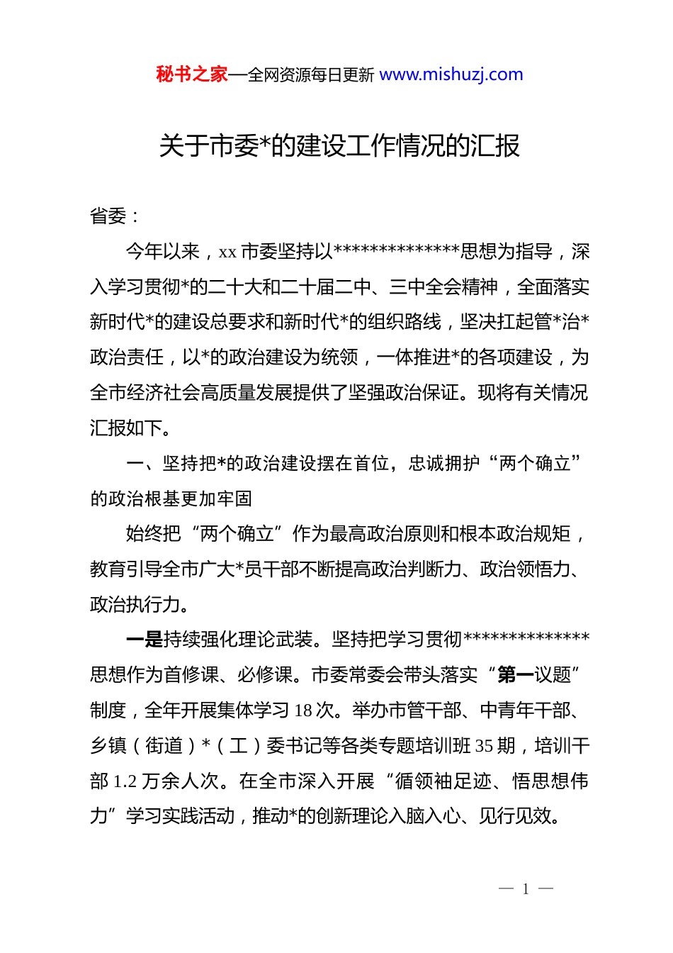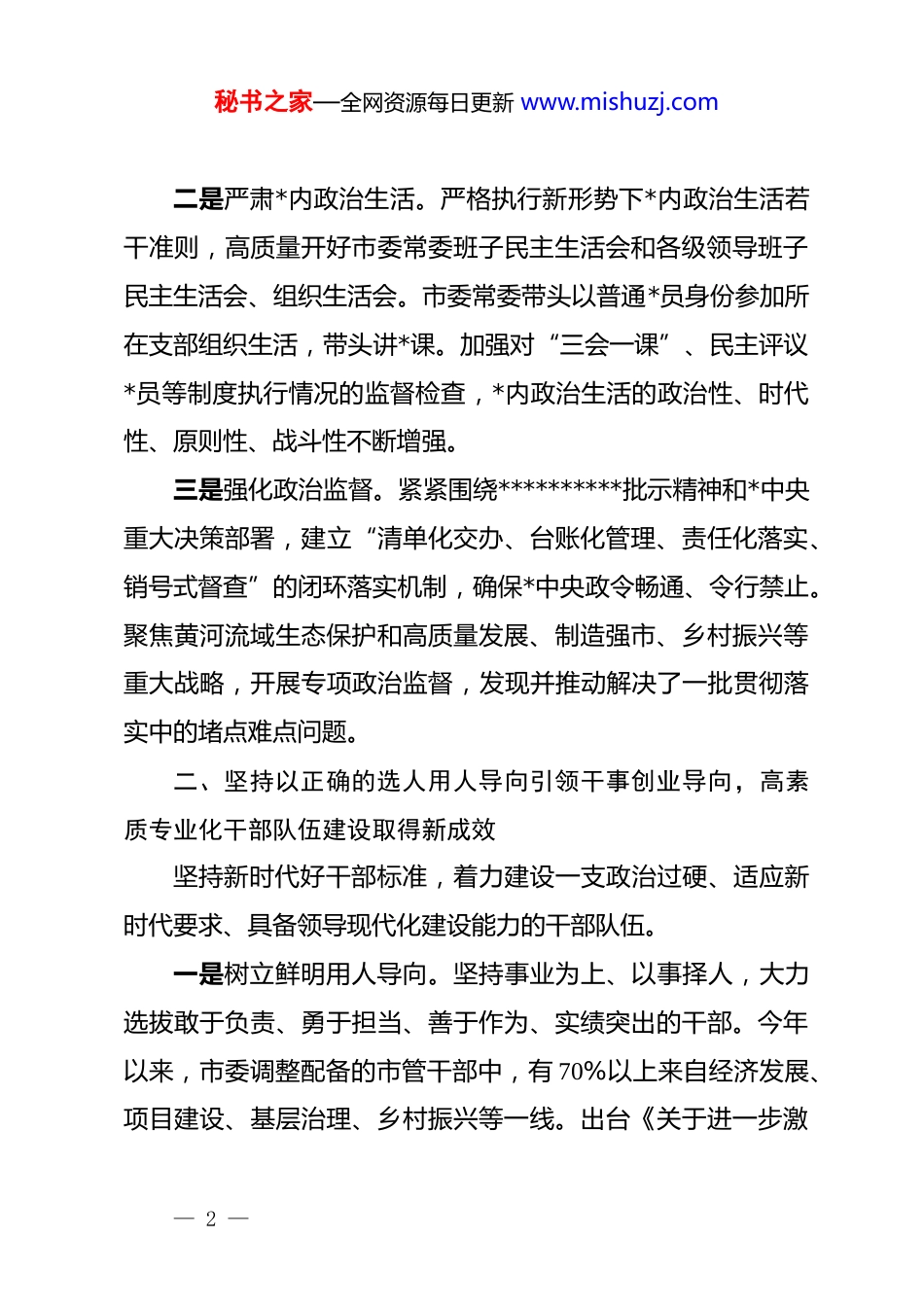 秘书之家—全网资源每日更新 www.mishuzj.com关于市委*的建设工作情况的汇报省委:今年以来,xx 市委坚持以**************思想为指导,深入学习贯彻*的二十大和二十届二中、三中全会精神,全面落实新时代*的建设总要求和新时代*的组织路线,坚决扛起管*治*政治责任,以*的政治建设为统领,一体推进*的各项建设,为全市经济社会高质量发展提供了坚强政治保证。现将有关情况汇报如下。一、坚持把*的政治建设摆在首位,忠诚拥护“两个确立”的政治根基更加牢固始终把“两个确立”作为最高政治原则和根本政治规矩,教育引导全市广大*员干部不断提高政治判断力、政治领悟力、政治执行力。一是持续强化理论武装。坚持把学习贯彻**************思想作为首修课、必修课。市委常委会带头落实“第一议题”制度,全年开展集体学习 18 次。举办市管干部、中青年干部、乡镇(街道)*(工)委书记等各类专题培训班 35 期,培训干部 1.2 万余人次。在全市深入开展“循领袖足迹、悟思想伟力”学习实践活动,推动*的创新理论入脑入心、见行见效。— 1 —秘书之家—全网资源每日更新 www.mishuzj.com二是严肃*内政治生活。严格执行新形势下*内政治生活若干准则,高质量开好市委常委班子民主生活会和各级领导班子民主生活会、组织生活会。市委常委带头以普通*员身份参加所在支部组织生活,带头讲*课。加强对“三会一课”、民主评议*员等制度执行情况的监督检查,*内政治生活的政治性、时代性、原则性、战斗性不断增强。三是强化政治监督。紧紧围绕**********批示精神和*中央重大决策部署,建立“清单化交办、台账化管理、责任化落实、销号式督查”的闭环落实机制,确保*中央政令畅通、令行禁止。聚焦黄河流域生态保护和高质量发展、制造强市、乡村振兴等重大战略,开展专项政治监督,发现并推动解决了一批贯彻落实中的堵点难点问题。二、坚持以正确的选人用人导向引领干事创业导向,高素质专业化干部队伍建设取得新成效坚持新时代好干部标准,着力建设一支政治过硬、适应新时代要求、具备领导现代化建设能力的干部队伍。一是树立鲜明用人导向。坚持事业为上、以事择人,大力选拔敢于负责、勇于担当、善于作为、实绩突出的干部。今年以来,市委调整配备的市管干部中,有 70%以上来自经济发展、项目建设、基层治理、乡村振兴等一线。出台《关于进一步激— 2 —秘书之家—全网资源每日更新 www.mishuzj.com励广大干部新时代新担当新作为的实施意见》,完善干部考核评价体系,将招商引资、项目建设等中心工作成效作为评价干部的重要依据。二是优化干部队伍结构。统筹做好女干部、少数民族干部和*外干部培养选拔工作。大力发现培养选拔优秀年轻干部,实施“雏鹰”成长计划,选派 50 名 35 岁以下年轻干部到长三角、珠三角等发达地区体悟实训,选派 100 名年轻干部到信访维稳、征地拆迁等吃劲岗位上锻炼。目前,全市 40 岁以下处级干部占比达到 22%,乡镇(街道)领导班子成员平均年龄下降至 38.5岁。三是加强干部教育培训。围绕提升“七种能力”,精准实施干部履职能力提升工程。依托市委*校主阵地,整合市内高校、红色教育基地、头部企业等资源,构建“1+n”干部教育培训基地体系。聚焦数字经济、生物医药、新材料等重点产业链,举办专题研修班,有效提升了干部推动高质量发展的专业素养。三、坚持大抓基层的鲜明导向,基层*组织政治功能和组织功能不断增强以增强*组织政治功能和组织功能为重点,推动基层*组织全面进步、全面过硬。一是深化农村基层 dj。全面推行村*组织书记通过法定程序— 3 —秘书之家—全网资源每日更新 www.mishuzj.com担任村委会主任,“一肩挑”比例达到 99.8%。持续实施“头雁工程”,举办村(社区)*组织书记市级示范培训班,实现全覆盖轮训。大力发展壮大村级集体经济,2024 年,全市所有行政村集体经济收入均超过 10 万元,其中 50 万元以上的村占比达到 35%。二是提升城市基层 dj 质效。深化街道管理体制改革,推动资源、服务、管理向社区下沉。全面推行社区*组织书记事业岗位管理,加强专业化社区工作者队伍建设。构建“街道*工委—社...
