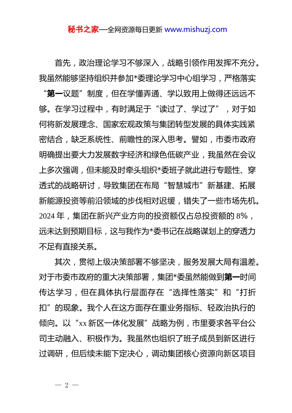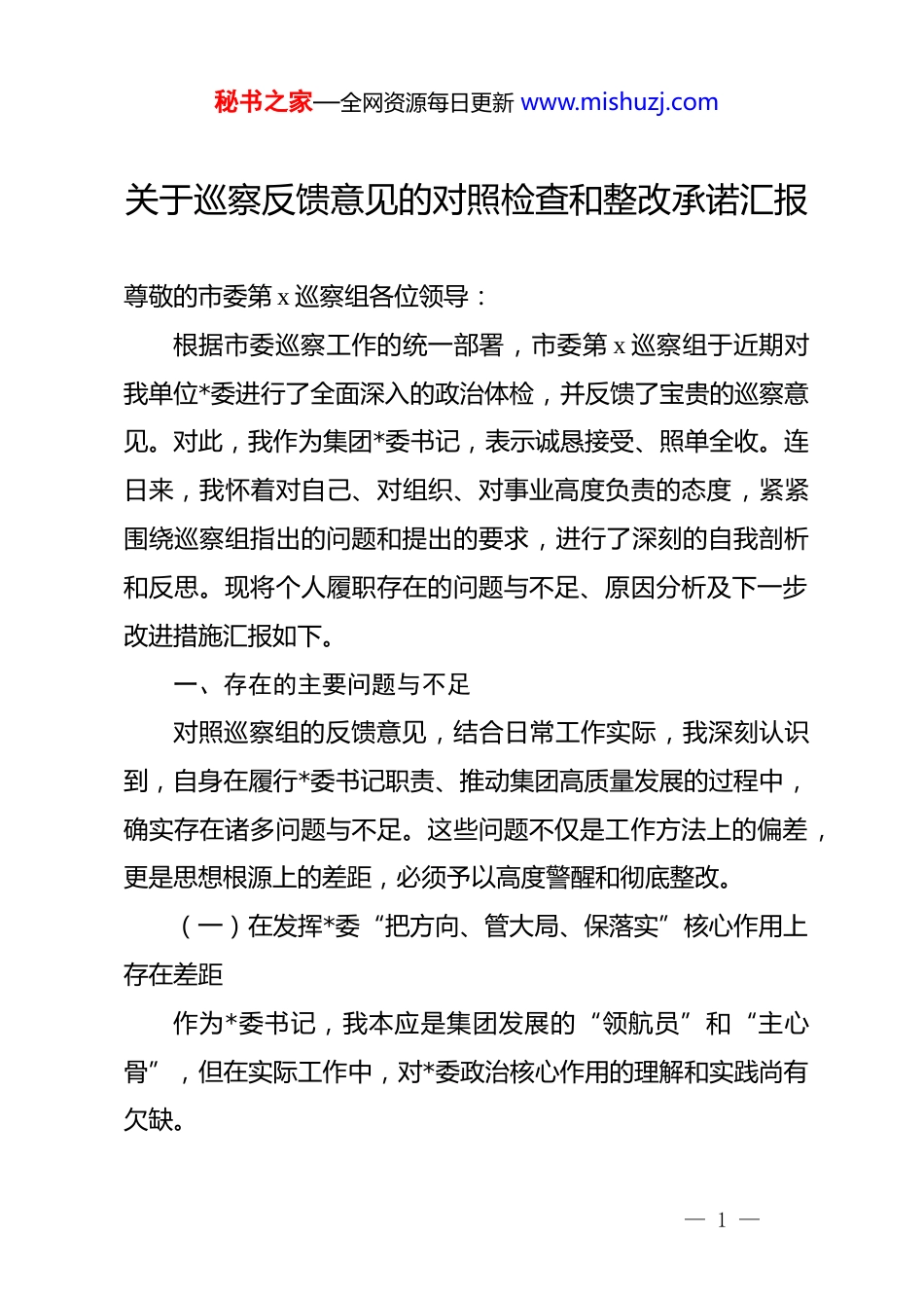 秘书之家—全网资源每日更新 www.mishuzj.com关于巡察反馈意见的对照检查和整改承诺汇报尊敬的市委第 x 巡察组各位领导:根据市委巡察工作的统一部署,市委第 x 巡察组于近期对我单位*委进行了全面深入的政治体检,并反馈了宝贵的巡察意见。对此,我作为集团*委书记,表示诚恳接受、照单全收。连日来,我怀着对自己、对组织、对事业高度负责的态度,紧紧围绕巡察组指出的问题和提出的要求,进行了深刻的自我剖析和反思。现将个人履职存在的问题与不足、原因分析及下一步改进措施汇报如下。一、存在的主要问题与不足对照巡察组的反馈意见,结合日常工作实际,我深刻认识到,自身在履行*委书记职责、推动集团高质量发展的过程中,确实存在诸多问题与不足。这些问题不仅是工作方法上的偏差,更是思想根源上的差距,必须予以高度警醒和彻底整改。(一)在发挥*委“把方向、管大局、保落实”核心作用上存在差距作为*委书记,我本应是集团发展的“领航员”和“主心骨”,但在实际工作中,对*委政治核心作用的理解和实践尚有欠缺。— 1 —秘书之家—全网资源每日更新 www.mishuzj.com首先,政治理论学习不够深入,战略引领作用发挥不充分。我虽然能够坚持组织并参加*委理论学习中心组学习,严格落实“第一议题”制度,但在学懂弄通、学以致用上做得还远远不够。在学习过程中,有时满足于“读过了、学过了”,对于如何将新发展理念、国家宏观政策与集团转型发展的具体实践紧密结合,缺乏系统性、前瞻性的深入思考。譬如,市委市政府明确提出要大力发展数字经济和绿色低碳产业,我虽然在会议上多次强调,但未能及时牵头组织*委班子就此进行专题性、穿透式的战略研讨,导致集团在布局“智慧城市”新基建、拓展新能源投资等前沿领域的步伐相对迟缓,错失了一些市场先机。2024 年,集团在新兴产业方向的投资额仅占总投资额的 8%,远未达到预期目标,这与我作为*委书记在战略谋划上的穿透力不足有直接关系。其次,贯彻上级决策部署不够坚决,服务发展大局有温差。对于市委市政府的重大决策部署,集团*委虽然能做到第一时间传达学习,但在具体执行层面存在“选择性落实”和“打折扣”的现象。我个人在这方面存在重业务指标、轻政治执行的倾向。以“xx 新区一体化发展”战略为例,市里要求各平台公司主动融入、积极作为。我虽然也组织了班子成员到新区进行过调研,但后续未能下定决心,调动集团核心资源向新区项目— 2 —秘书之家—全网资源每日更新 www.mishuzj.com倾斜,总担心新区的项目投资周期长、回报不确定,会影响集团当期的营收和利润数据。这种求稳怕乱、患得患失的心态,导致集团在新区建设中的角色从“主力军”降格为“参与者”,未能充分彰显市属国企在重大战略中的担当和作为。再者,“三重一大”决策制度执行不够严格,*委前置研究讨论程序有时虚化。我深刻反思,在工作中确实存在为了追求所谓的“效率”而简化决策流程的情况。尤其是在一些时间紧、任务重的项目上,我有时会先入为主形成意见,习惯于在董事长办公会或总经理办公会上与行政班子成员商议并形成初步方案,再提交*委会审议。这使得*委的前置研究讨论在客观上变成了对既定方案的“背书”环节,未能充分发挥*委在重大决策中的前置把关和集体决策作用。比如,在 2025 年初的“xx 片区综合开发项目”二期融资方案决策中,由于时间紧迫,我直接召集财务和投融资部门开会敲定了高达 15 亿元的融资方案,提交*委会时,留给各位委员研究思考的时间不足,讨论不够充分,导致后续在执行中发现方案对利率波动的风险预估不足,增加了集团的财务成本。(二)在履行全面从严治*“两个责任”上存在短板作为管*治*的第一责任人,我深感自己肩上的担子之重,但对照巡察要求,深查细照,仍发现存在明显差距。— 3 —秘书之家—全网资源每日更新 www.mishuzj.com第一,落实主体责任不够到位,压力传导层层递减。我对全面从 v 治*工作的复杂性和长期性认识不足,存在一定的“重业务、轻 dj”思想。虽然每年都按要求主持召开*风廉政建设专题会议、签订责任书,但往往是“以会议落实会议、以文件落实文件”,对责任...