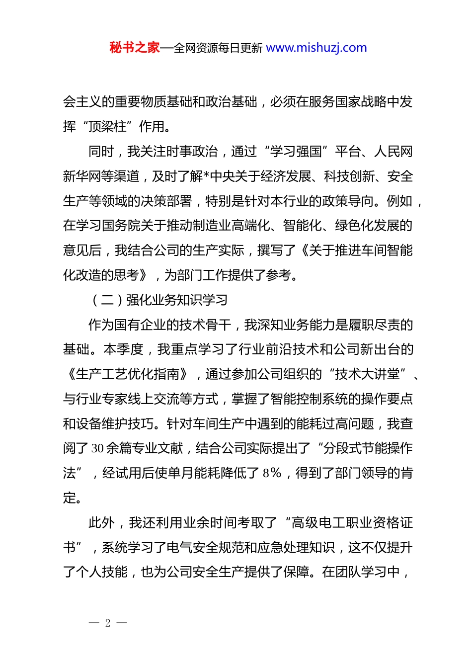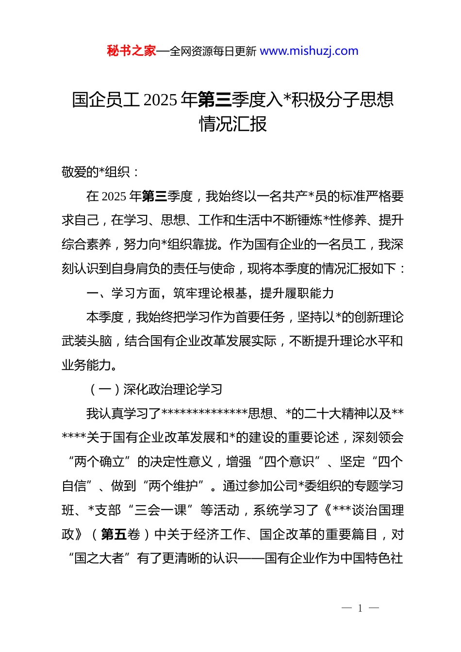 秘书之家—全网资源每日更新 www.mishuzj.com国企员工 2025 年第三季度入*积极分子思想情况汇报敬爱的*组织:在 2025 年第三季度,我始终以一名共产*员的标准严格要求自己,在学习、思想、工作和生活中不断锤炼*性修养、提升综合素养,努力向*组织靠拢。作为国有企业的一名员工,我深刻认识到自身肩负的责任与使命,现将本季度的情况汇报如下:一、学习方面,筑牢理论根基,提升履职能力本季度,我始终把学习作为首要任务,坚持以*的创新理论武装头脑,结合国有企业改革发展实际,不断提升理论水平和业务能力。(一)深化政治理论学习我认真学习了**************思想、*的二十大精神以及******关于国有企业改革发展和*的建设的重要论述,深刻领会“两个确立”的决定性意义,增强“四个意识”、坚定“四个自信”、做到“两个维护”。通过参加公司*委组织的专题学习班、*支部“三会一课”等活动,系统学习了《***谈治国理政》(第五卷)中关于经济工作、国企改革的重要篇目,对“国之大者”有了更清晰的认识——国有企业作为中国特色社— 1 —秘书之家—全网资源每日更新 www.mishuzj.com会主义的重要物质基础和政治基础,必须在服务国家战略中发挥“顶梁柱”作用。同时,我关注时事政治,通过“学习强国”平台、人民网新华网等渠道,及时了解*中央关于经济发展、科技创新、安全生产等领域的决策部署,特别是针对本行业的政策导向。例如,在学习国务院关于推动制造业高端化、智能化、绿色化发展的意见后,我结合公司的生产实际,撰写了《关于推进车间智能化改造的思考》,为部门工作提供了参考。(二)强化业务知识学习作为国有企业的技术骨干,我深知业务能力是履职尽责的基础。本季度,我重点学习了行业前沿技术和公司新出台的《生产工艺优化指南》,通过参加公司组织的“技术大讲堂”、与行业专家线上交流等方式,掌握了智能控制系统的操作要点和设备维护技巧。针对车间生产中遇到的能耗过高问题,我查阅了 30 余篇专业文献,结合公司实际提出了“分段式节能操作法”,经试用后使单月能耗降低了 8%,得到了部门领导的肯定。此外,我还利用业余时间考取了“高级电工职业资格证书”,系统学习了电气安全规范和应急处理知识,这不仅提升了个人技能,也为公司安全生产提供了保障。在团队学习中,— 2 —秘书之家—全网资源每日更新 www.mishuzj.com我主动分享所学知识,牵头组织了 3 次技术分享会,带动身边同事共同进步,形成了“比学赶超”的良好氛围。二、思想方面,坚定理想信念,锤炼*性修养本季度,我始终以*员标准校准思想航向,在思想上、政治上、行动上同*中央保持高度一致,不断增强*性修养和政治觉悟。(一)坚定入*信念,深化思想认同通过学习*史和新中国史,我深刻认识到中国共产*的先进性和伟大性。在参观公司*史学习教育基地时,老一辈国企人“逢山开路、遇水架桥”的奋斗故事让我深受触动——上世纪七八十年代,公司前辈们在设备简陋、技术落后的条件下,仅用三年时间就建成了省内第一条自动化生产线,靠的正是“听*话、跟*走”的坚定信念。这让我更加坚定了入*的决心:要像前辈们一样,把个人理想融入企业发展和国家建设中,以实际行动践行对*的忠诚。在参加*支部组织的“入*为什么、在*干什么”主题讨论时,我结合工作实际谈到:“作为国企员工,入*不仅是一份荣誉,更是一份责任。我要在技术攻关中冲锋在前,在服务群众中主动作为,用实干诠释对*的信仰。”这段发言得到了支部*员的认可,也让我对*员的责任有了更深刻的理解。— 3 —秘书之家—全网资源每日更新 www.mishuzj.com(二)增强大局意识,服务企业发展在思想上,我始终坚持“企业发展我有责”的理念,把个人工作融入公司改革发展大局。本季度,公司启动了“数字化转型三年行动计划”,部分同事因担心技术更新快、学习压力大而产生抵触情绪。我主动与他们沟通,结合国家“数字经济”战略和公司发展规划,分析转型的必要性和长远意义,并帮助 3 名老员工掌握了基础操作技能,缓解了他们的焦虑。在面对个人利益与企业利益的选择时,我始终以大局为重本季度,我原本计划休年假陪伴家...