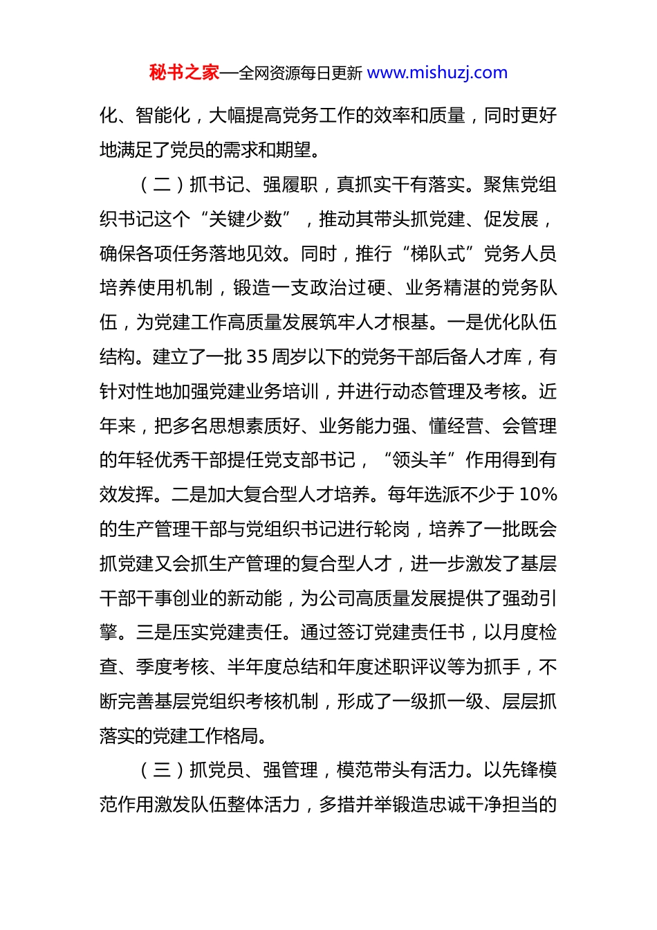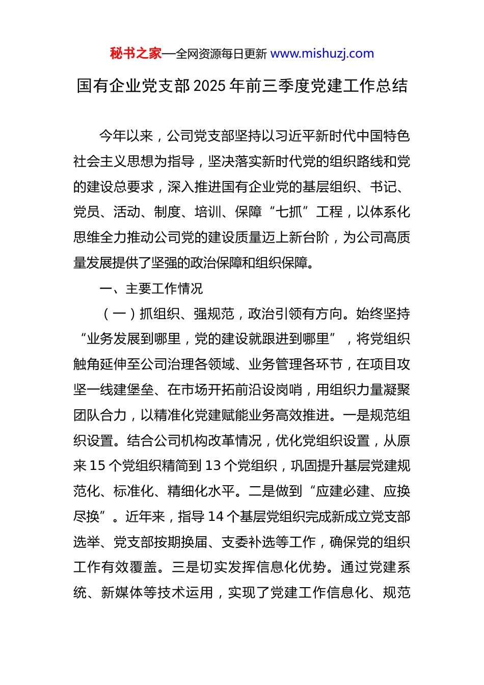 秘书之家—全网资源每日更新 www.mishuzj.com国有企业党支部 2025 年前三季度党建工作总结 今年以来,公司党支部坚持以习近平新时代中国特色社会主义思想为指导,坚决落实新时代党的组织路线和党的建设总要求,深入推进国有企业党的基层组织、书记、党员、活动、制度、培训、保障“七抓”工程,以体系化思维全力推动公司党的建设质量迈上新台阶,为公司高质量发展提供了坚强的政治保障和组织保障。一、主要工作情况(一)抓组织、强规范,政治引领有方向。始终坚持“业务发展到哪里,党的建设就跟进到哪里”,将党组织触角延伸至公司治理各领域、业务管理各环节,在项目攻坚一线建堡垒、在市场开拓前沿设岗哨,用组织力量凝聚团队合力,以精准化党建赋能业务高效推进。一是规范组织设置。结合公司机构改革情况,优化党组织设置,从原来 15 个党组织精简到 13 个党组织,巩固提升基层党建规范化、标准化、精细化水平。二是做到“应建必建、应换尽换”。近年来,指导 14 个基层党组织完成新成立党支部选举、党支部按期换届、支委补选等工作,确保党的组织工作有效覆盖。三是切实发挥信息化优势。通过党建系统、新媒体等技术运用,实现了党建工作信息化、规范秘书之家—全网资源每日更新 www.mishuzj.com化、智能化,大幅提高党务工作的效率和质量,同时更好地满足了党员的需求和期望。(二)抓书记、强履职,真抓实干有落实。聚焦党组织书记这个“关键少数”,推动其带头抓党建、促发展,确保各项任务落地见效。同时,推行“梯队式”党务人员培养使用机制,锻造一支政治过硬、业务精湛的党务队伍,为党建工作高质量发展筑牢人才根基。一是优化队伍结构。建立了一批 35 周岁以下的党务干部后备人才库,有针对性地加强党建业务培训,并进行动态管理及考核。近年来,把多名思想素质好、业务能力强、懂经营、会管理的年轻优秀干部提任党支部书记,“领头羊”作用得到有效发挥。二是加大复合型人才培养。每年选派不少于 10%的生产管理干部与党组织书记进行轮岗,培养了一批既会抓党建又会抓生产管理的复合型人才,进一步激发了基层干部干事创业的新动能,为公司高质量发展提供了强劲引擎。三是压实党建责任。通过签订党建责任书,以月度检查、季度考核、半年度总结和年度述职评议等为抓手,不断完善基层党组织考核机制,形成了一级抓一级、层层抓落实的党建工作格局。(三)抓党员、强管理,模范带头有活力。以先锋模范作用激发队伍整体活力,多措并举锻造忠诚干净担当的秘书之家—全网资源每日更新 www.mishuzj.com党员队伍,让每一名党员都成为攻坚克难的先锋、服务群众的标杆,凝聚起干事创业的强大合力。一是严把入口关。坚持把政治标准放在首位,注重发展优秀青年、业务骨干入党,近年来新发展党员中优秀青年占比 50%、业务骨干占比 50%,发展党员质量不断提升。二是加强管理监督。严肃“三会一课”制度,通过“主题党日”、党员“双提升”等党性提升活动,强化制度约束,常抓源头管理,打造忠诚干净担当的党员队伍。三是激发党员先锋“新活力”。积极开展“岗区队”创建、“两优一先”评选表彰等活动,引导广大党员在干事创业、服务群众等工作中当先锋做表率。(四)抓活动、强载体,双向融合有成效。紧紧围绕公司党委“6+6”大党建工作主线,大力推进党建工作与业务工作深度融合、全面融合,更好推动公司在服务大局中展现新担当、在提质增效中实现新突破。一是做优“两带两创”。公司党委坚持“围绕中心抓党建、抓好党建促发展”的工作思路,聚焦主责主业,通过严把“立项关”、狠抓“过程关”、突出“实效关”,扎实推进“两带两创”工作,创效项目实现新高,创新项目达到预期效果。二是加速打造党建特色矩阵。公司党委聚焦“1236”党建特色创建,紧盯提升产品质量、人才队伍建设、精准精细秘书之家—全网资源每日更新 www.mishuzj.com化管理等,深入推进“一支部一特色”“党建+”活动,不断增强基层党组织的创造力、凝聚力和战斗力,形成了党建和生产经营同频共振、同向聚合的工作格局。三是深化对标提升。采取“内外、上下、横向”等多种形式开展“结对子、...