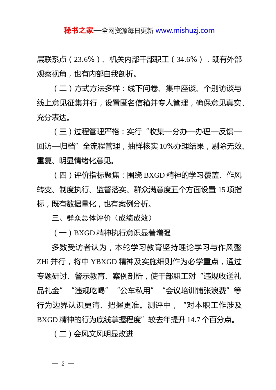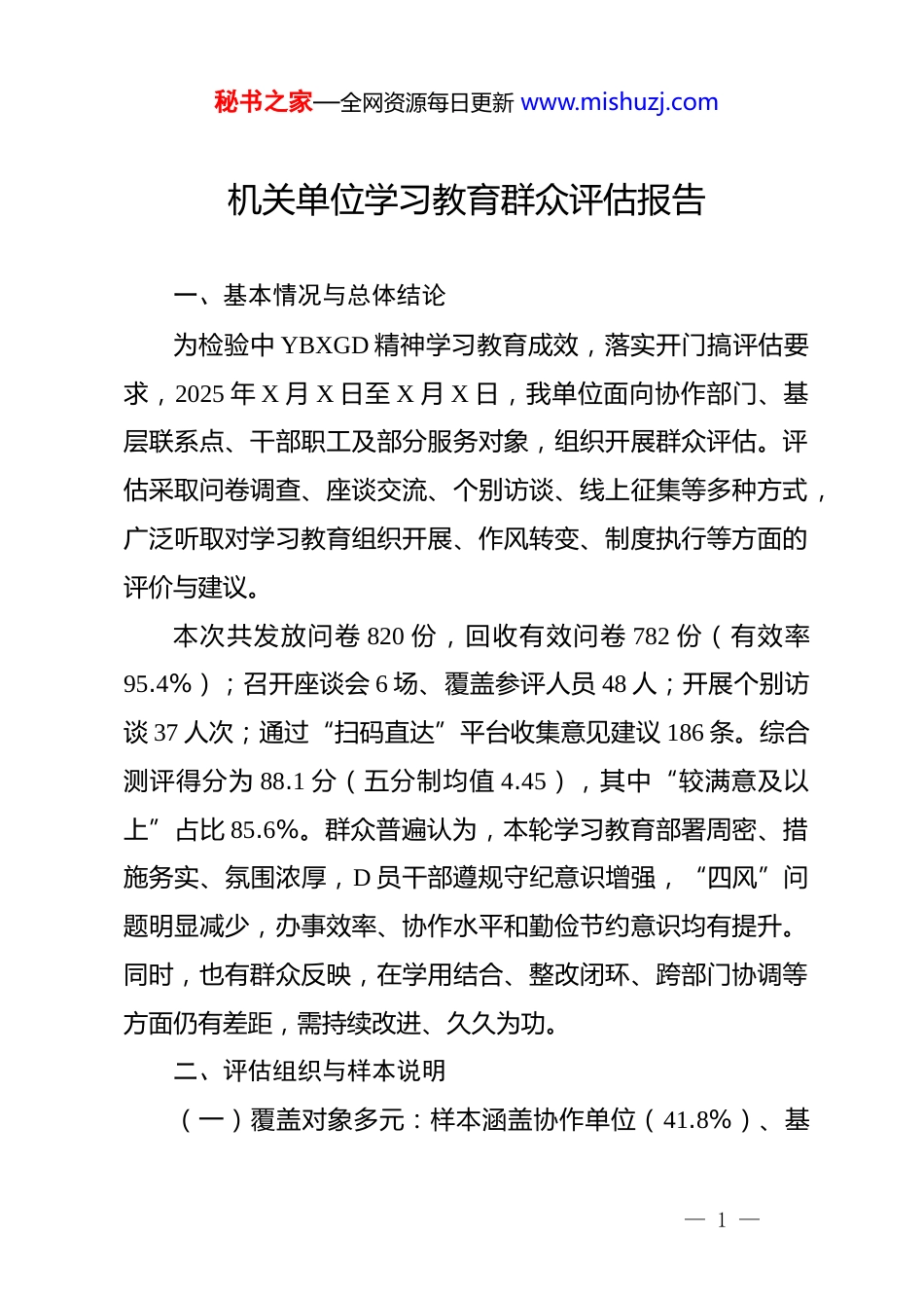 秘书之家—全网资源每日更新 www.mishuzj.com机关单位学习教育群众评估报告 一、基本情况与总体结论为检验中 YBXGD 精神学习教育成效,落实开门搞评估要求,2025 年 X 月 X 日至 X 月 X 日,我单位面向协作部门、基层联系点、干部职工及部分服务对象,组织开展群众评估。评估采取问卷调查、座谈交流、个别访谈、线上征集等多种方式,广泛听取对学习教育组织开展、作风转变、制度执行等方面的评价与建议。本次共发放问卷 820 份,回收有效问卷 782 份(有效率95.4%);召开座谈会 6 场、覆盖参评人员 48 人;开展个别访谈 37 人次;通过“扫码直达”平台收集意见建议 186 条。综合测评得分为 88.1 分(五分制均值 4.45),其中“较满意及以上”占比 85.6%。群众普遍认为,本轮学习教育部署周密、措施务实、氛围浓厚,D 员干部遵规守纪意识增强,“四风”问题明显减少,办事效率、协作水平和勤俭节约意识均有提升。同时,也有群众反映,在学用结合、整改闭环、跨部门协调等方面仍有差距,需持续改进、久久为功。二、评估组织与样本说明(一)覆盖对象多元:样本涵盖协作单位(41.8%)、基— 1 —秘书之家—全网资源每日更新 www.mishuzj.com层联系点(23.6%)、机关内部干部职工(34.6%),既有外部观察视角,也有内部自我剖析。(二)方式方法多样:线下问卷、集中座谈、个别访谈与线上意见征集并行,设置匿名信箱并专人管理,确保意见真实、充分表达。(三)过程管理严格:实行“收集—分办—办理—反馈—回访—归档”全流程管理,抽样核实 10%办理结果,剔除无效、重复、明显情绪化意见。(四)评价指标聚焦:围绕 BXGD 精神的学习覆盖、作风转变、制度执行、监督落实、群众满意度五个方面设置 15 项指标,既有数据量化,也有案例分析。三、群众总体评价(成绩成效)(一)BXGD 精神执行意识显著增强多数受访者认为,本轮学习教育坚持理论学习与作风整ZHi 并行,将中 YBXGD 精神及实施细则作为必学重点,通过专题研讨、警示教育、案例剖析,使干部职工对“违规收送礼品礼金”“违规吃喝”“公车私用”“会议培训铺张浪费”等行为边界认识更清、把握更准。测评中,“对本职工作涉及BXGD 精神的行为底线掌握程度”较去年提升 14.7 个百分点。(二)会风文风明显改进— 2 —秘书之家—全网资源每日更新 www.mishuzj.com会议压减率达到 22%,文件精简率 21%,无关紧要的会议减少,文件篇幅更简洁、内容更聚焦;协作部门反馈,跨部门工作协调效率提升,避免了多头部署、重复发文。(三)勤俭节约深入人心公 务 接 待 、 公 务 差 旅 、 办 公 用 品 等 支 出 同 比 下 降13.6%;“能线上不开会、能合并不分办”成为共识;公务用车管理更规范,油耗同比下降 8.2%。(四)制度执行更加规范修订完善公务接待、公务用车、差旅报销、培训管理等制度 9 项,建立重要节点“提醒+抽查”机制,对节假日值班、公务活动安排等高风险时段提前发出作风纪律提示。【案例】针对调研活动中存在的“走过场”苗头,机关制定调研活动计划报备和成果反馈制度,明确调研须有问题清单、有成果转化,杜绝形式主义调研。四、存在的主要问题与具体表现(一)学用结合不够精准部分学习教育内容停留在文件传达、案例宣讲,缺少与具体岗位相结合的操作指引,如如何在业务招待、同城差旅、会议安排等日常环节精准落实 BXGD 精神。(二)整改闭环不够严密— 3 —秘书之家—全网资源每日更新 www.mishuzj.com群众反映,有些问题虽已整改,但进展和成效缺少及时公开,跨部门问题反馈周期偏长。问卷显示,整改事项按期办结率为 78%,其中公开反馈率为 65%。(三)跨部门协作仍有短板少数跨部门任务存在信息传递不畅、责任不够明确的问题导致落实周期延长。(四)制度执行存在弹性个别环节存在“先口头同意、事后补手续”的现象;节前节后监督提醒虽有,但仍有干部对“隐形变异”问题警觉性不足。五、群众意见建议归纳(一)对本单位的建议(1)精准制定岗位化落实指引建议尽快结合本单位职能和岗位职责,编制涵盖机关各业务领域的《BXG...
