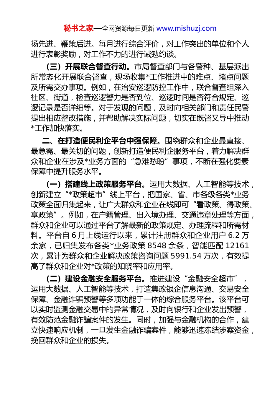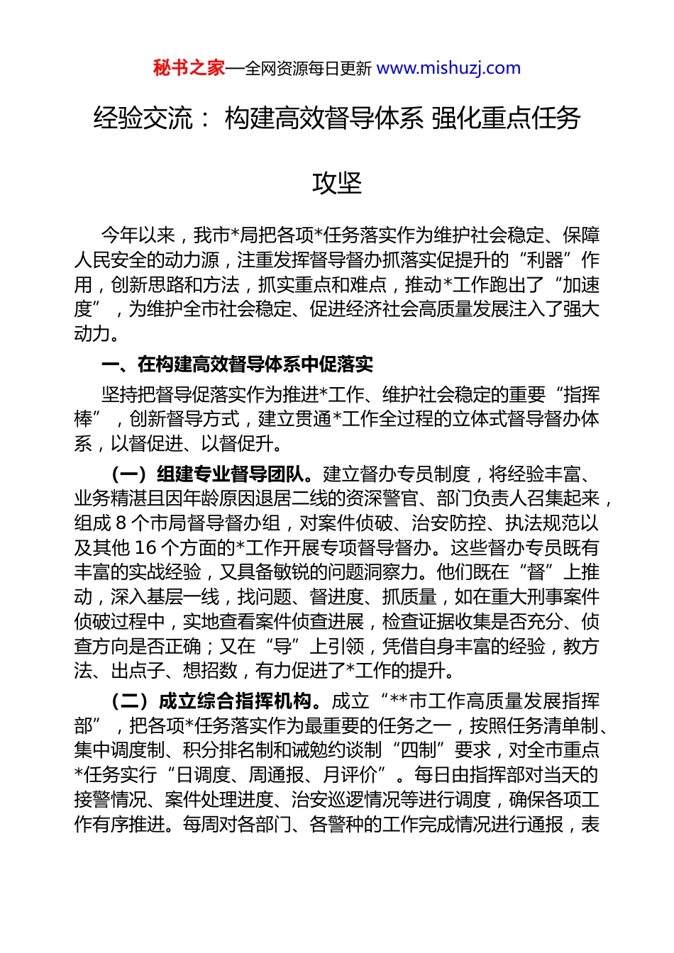 秘书之家—全网资源每日更新 www.mishuzj.com经验交流: 构建高效督导体系 强化重点任务攻坚今年以来,我市*局把各项*任务落实作为维护社会稳定、保障人民安全的动力源,注重发挥督导督办抓落实促提升的“利器”作用,创新思路和方法,抓实重点和难点,推动*工作跑出了“加速度”,为维护全市社会稳定、促进经济社会高质量发展注入了强大动力。一、在构建高效督导体系中促落实坚持把督导促落实作为推进*工作、维护社会稳定的重要“指挥棒”,创新督导方式,建立贯通*工作全过程的立体式督导督办体系,以督促进、以督促升。(一)组建专业督导团队。建立督办专员制度,将经验丰富、业务精湛且因年龄原因退居二线的资深警官、部门负责人召集起来,组成 8 个市局督导督办组,对案件侦破、治安防控、执法规范以及其他 16 个方面的*工作开展专项督导督办。这些督办专员既有丰富的实战经验,又具备敏锐的问题洞察力。他们既在“督”上推动,深入基层一线,找问题、督进度、抓质量,如在重大刑事案件侦破过程中,实地查看案件侦查进展,检查证据收集是否充分、侦查方向是否正确;又在“导”上引领,凭借自身丰富的经验,教方法、出点子、想招数,有力促进了*工作的提升。(二)成立综合指挥机构。成立“**市工作高质量发展指挥部”,把各项*任务落实作为最重要的任务之一,按照任务清单制、集中调度制、积分排名制和诫勉约谈制“四制”要求,对全市重点*任务实行“日调度、周通报、月评价”。每日由指挥部对当天的接警情况、案件处理进度、治安巡逻情况等进行调度,确保各项工作有序推进。每周对各部门、各警种的工作完成情况进行通报,表秘书之家—全网资源每日更新 www.mishuzj.com扬先进、鞭策后进。每月进行综合评价,对工作突出的单位和个人进行表彰奖励,对工作不力的进行诫勉约谈。(三)开展联合督查行动。市局督查部门与各警种、基层派出所常态化开展联合督查,现场收集*工作推进中的难点、堵点问题及所需交办事项。例如,在治安巡逻防控工作中,联合督查组深入社区、街道,检查巡逻警力是否到位、巡逻时间是否符合规定、巡逻记录是否详细等。对于发现的问题,及时向相关部门和责任民警提出相应整改措施,并帮助解决实际问题,切实在既督又导中推动*工作加快落实。二、在打造便民利企平台中强保障。围绕群众和企业最直接、最急需、最关切的问题,创新打造便民利企服务平台,着力解决群众和企业在涉及*业务方面的“急难愁盼”事项,不断在强化要素保障中提升服务水平。(一)搭建线上政策服务平台。运用大数据、人工智能等技术,创新建立“*政策超市”线上平台,把国家、省、市各级各类*业务政策全面归集起来,让广大群众和企业在线即可“看政策、得政策、享政策”。例如,在户籍管理、出入境办理、交通违章处理等方面,群众和企业可以通过平台了解最新的政策规定、办理流程和所需材料。平台自 6 月上线运行以来,累计注册群众和企业用户 6.2 万余家,已归集发布各类*业务政策 8548 余条,智能匹配 12161次,累计为群众和企业解决政策咨询问题 5991.54 万次,有效提高了群众和企业对*政策的知晓率和应用率。(二)建设金融安全服务平台。推进建设“金融安全超市”,运用大数据、人工智能等技术,打造集政银企信息沟通、交易安全保障、金融诈骗预警等多项功能于一体的综合服务平台。该平台可以实时监测金融交易中的异常情况,及时向银行和企业发出预警,有效防范金融诈骗案件的发生。同时,加强与金融机构的合作,建立快速响应机制,一旦发生金融诈骗案件,能够迅速冻结涉案资金,挽回群众和企业的损失。秘书之家—全网资源每日更新 www.mishuzj.com(三)畅通群众诉求反馈渠道。建立“热线直接、信息直报、上门直访、沟通直面、诉求直办、服务直达、问责直处”七条直通渠道,配套上线“*营商码”,重点受理群众和企业在涉及*业务方面遇到的“急难愁盼”,如治安环境问题、执法服务态度问题等,以及*部门推诿扯皮、敷衍塞责、设卡刁难,以及民警不作为、乱作为、受贿腐败等损害营商环境的问题。对于群众和企业的诉求,实行限时办结制度,确保每一个问题都能得到...