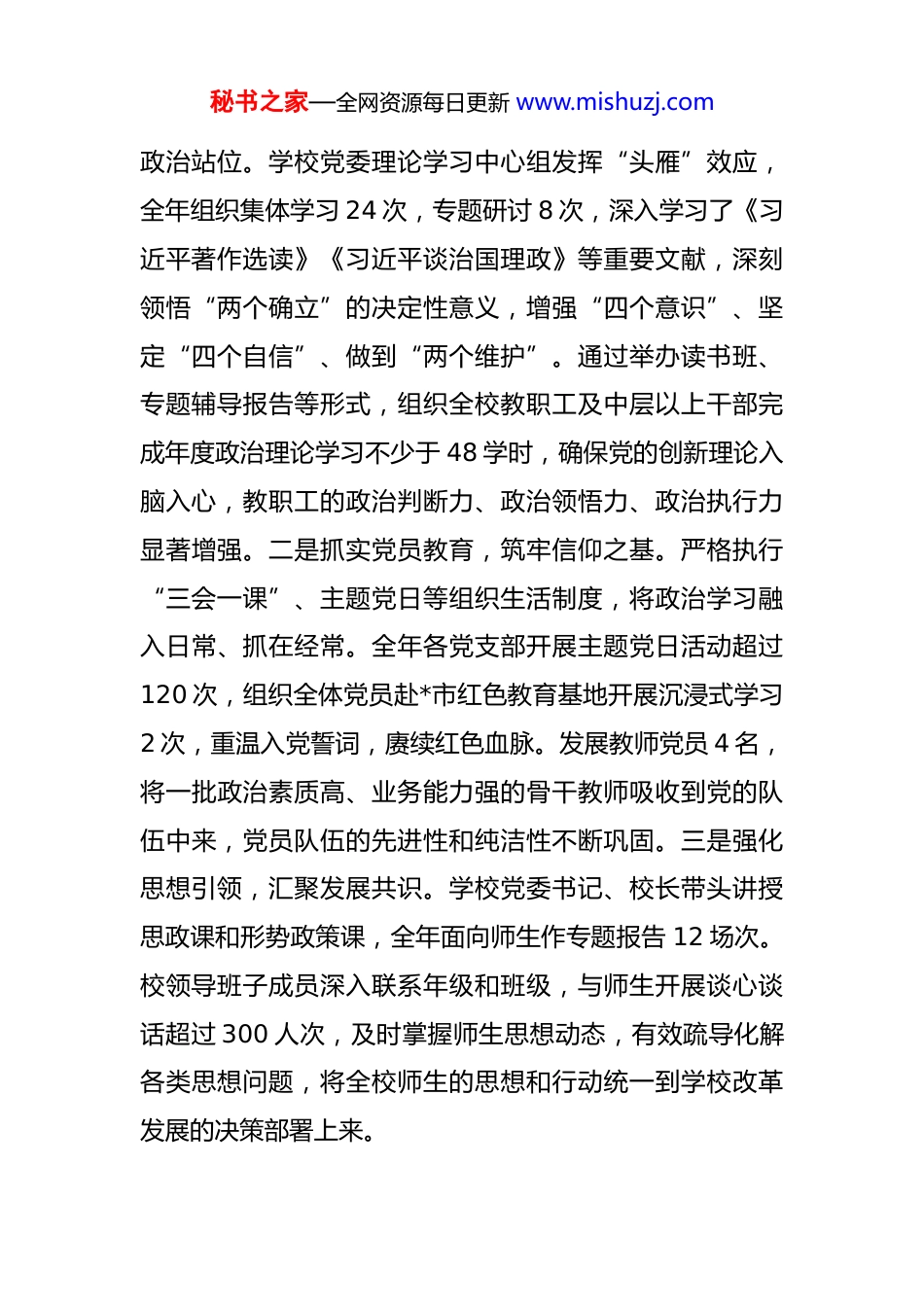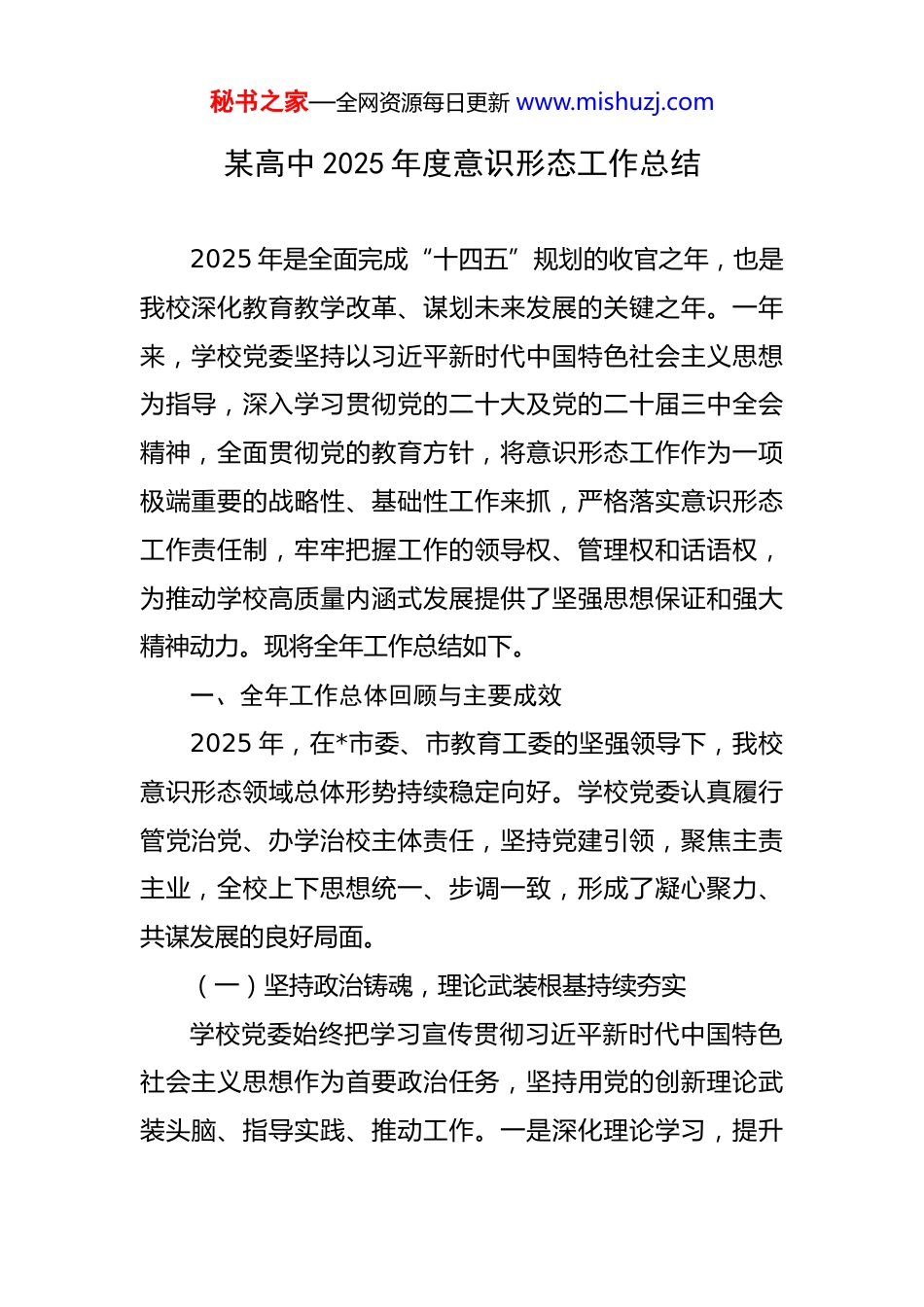 秘书之家—全网资源每日更新 www.mishuzj.com某高中 2025 年度意识形态工作总结 2025 年是全面完成“十四五”规划的收官之年,也是我校深化教育教学改革、谋划未来发展的关键之年。一年来,学校党委坚持以习近平新时代中国特色社会主义思想为指导,深入学习贯彻党的二十大及党的二十届三中全会精神,全面贯彻党的教育方针,将意识形态工作作为一项极端重要的战略性、基础性工作来抓,严格落实意识形态工作责任制,牢牢把握工作的领导权、管理权和话语权,为推动学校高质量内涵式发展提供了坚强思想保证和强大精神动力。现将全年工作总结如下。一、全年工作总体回顾与主要成效2025 年,在*市委、市教育工委的坚强领导下,我校意识形态领域总体形势持续稳定向好。学校党委认真履行管党治党、办学治校主体责任,坚持党建引领,聚焦主责主业,全校上下思想统一、步调一致,形成了凝心聚力、共谋发展的良好局面。(一)坚持政治铸魂,理论武装根基持续夯实学校党委始终把学习宣传贯彻习近平新时代中国特色社会主义思想作为首要政治任务,坚持用党的创新理论武装头脑、指导实践、推动工作。一是深化理论学习,提升秘书之家—全网资源每日更新 www.mishuzj.com政治站位。学校党委理论学习中心组发挥“头雁”效应,全年组织集体学习 24 次,专题研讨 8 次,深入学习了《习近平著作选读》《习近平谈治国理政》等重要文献,深刻领悟“两个确立”的决定性意义,增强“四个意识”、坚定“四个自信”、做到“两个维护”。通过举办读书班、专题辅导报告等形式,组织全校教职工及中层以上干部完成年度政治理论学习不少于 48 学时,确保党的创新理论入脑入心,教职工的政治判断力、政治领悟力、政治执行力显著增强。二是抓实党员教育,筑牢信仰之基。严格执行“三会一课”、主题党日等组织生活制度,将政治学习融入日常、抓在经常。全年各党支部开展主题党日活动超过120 次,组织全体党员赴*市红色教育基地开展沉浸式学习2 次,重温入党誓词,赓续红色血脉。发展教师党员 4 名,将一批政治素质高、业务能力强的骨干教师吸收到党的队伍中来,党员队伍的先进性和纯洁性不断巩固。三是强化思想引领,汇聚发展共识。学校党委书记、校长带头讲授思政课和形势政策课,全年面向师生作专题报告 12 场次。校领导班子成员深入联系年级和班级,与师生开展谈心谈话超过 300 人次,及时掌握师生思想动态,有效疏导化解各类思想问题,将全校师生的思想和行动统一到学校改革发展的决策部署上来。秘书之家—全网资源每日更新 www.mishuzj.com(二)深化立德树人,“大思政”育人格局日臻完善学校坚持为党育人、为国育才的初心使命,将立德树人根本任务贯穿于教育教学全过程,构建了全员、全过程、全方位的“大思政”工作格局。一是建强思政课程主渠道。严格按照国家要求开齐开足思想政治理论课,使用国家统编教材,确保课程的政治性和思想性。成立了由校党委书记任组长的思政课建设领导小组,定期开展思政课集体备课与教学研讨活动 30 余次。2025 年,我校思政教师团队在*市教学基本功大赛中荣获一等奖 1 项、二等奖 2项,教学水平和育人能力得到业界认可。二是推动课程思政协同育人。深入挖掘各学科蕴含的思政元素和育人功能,制定了《*高级中学课程思政建设实施方案》,打造了语文、历史、地理等一批课程思政示范课。通过项目化运作,成功培育了 15 门校级“课程思政”精品课程,形成了“知识传授”与“价值引领”同频共振的良好局面。三是打造校园文化育人品牌。持续深化“六元文化”建设,精心打造了“赤色传承”红色文化品牌项目。通过举办“五四”青年节合唱比赛、“七一”党史知识竞赛、“十一”爱国主义诗歌朗诵会等系列活动,参与师生近 8000 人次,有效激发了学生的爱国情、强国志、报国行。学校在*省“辉映红飘带·传承长征魂”红色文创设计大赛中表现优秘书之家—全网资源每日更新 www.mishuzj.com异,斩获一等奖 2 项,并荣获优秀组织奖。四是强化心理健康与劳动教育。建立了规范的心理健康咨询与服务体系,全年开展学生心理普查 2 次,建立学生心理档案覆盖率 ...