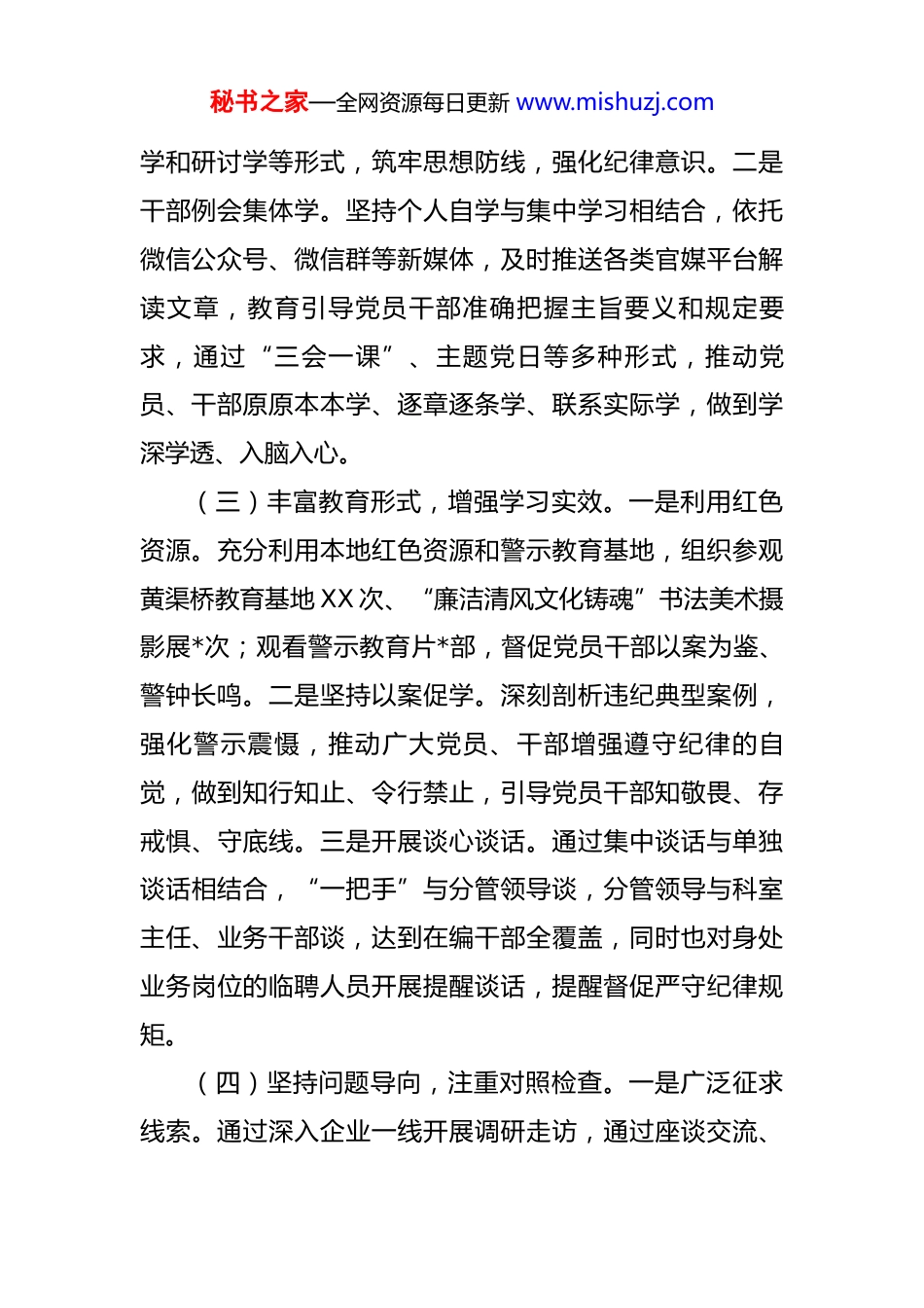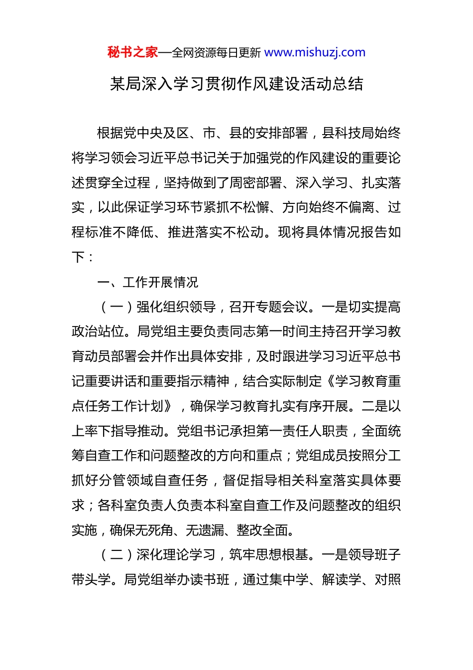 秘书之家—全网资源每日更新 www.mishuzj.com某局深入学习贯彻作风建设活动总结 根据党中央及区、市、县的安排部署,县科技局始终将学习领会习近平总书记关于加强党的作风建设的重要论述贯穿全过程,坚持做到了周密部署、深入学习、扎实落实,以此保证学习环节紧抓不松懈、方向始终不偏离、过程标准不降低、推进落实不松动。现将具体情况报告如下:一、工作开展情况(一)强化组织领导,召开专题会议。一是切实提高政治站位。局党组主要负责同志第一时间主持召开学习教育动员部署会并作出具体安排,及时跟进学习习近平总书记重要讲话和重要指示精神,结合实际制定《学习教育重点任务工作计划》,确保学习教育扎实有序开展。二是以上率下指导推动。党组书记承担第一责任人职责,全面统筹自查工作和问题整改的方向和重点;党组成员按照分工抓好分管领域自查任务,督促指导相关科室落实具体要求;各科室负责人负责本科室自查工作及问题整改的组织实施,确保无死角、无遗漏、整改全面。(二)深化理论学习,筑牢思想根基。一是领导班子带头学。局党组举办读书班,通过集中学、解读学、对照秘书之家—全网资源每日更新 www.mishuzj.com学和研讨学等形式,筑牢思想防线,强化纪律意识。二是干部例会集体学。坚持个人自学与集中学习相结合,依托微信公众号、微信群等新媒体,及时推送各类官媒平台解读文章,教育引导党员干部准确把握主旨要义和规定要求,通过“三会一课”、主题党日等多种形式,推动党员、干部原原本本学、逐章逐条学、联系实际学,做到学深学透、入脑入心。(三)丰富教育形式,增强学习实效。一是利用红色资源。充分利用本地红色资源和警示教育基地,组织参观黄渠桥教育基地 XX 次、“廉洁清风文化铸魂”书法美术摄影展*次;观看警示教育片*部,督促党员干部以案为鉴、警钟长鸣。二是坚持以案促学。深刻剖析违纪典型案例,强化警示震慑,推动广大党员、干部增强遵守纪律的自觉,做到知行知止、令行禁止,引导党员干部知敬畏、存戒惧、守底线。三是开展谈心谈话。通过集中谈话与单独谈话相结合,“一把手”与分管领导谈,分管领导与科室主任、业务干部谈,达到在编干部全覆盖,同时也对身处业务岗位的临聘人员开展提醒谈话,提醒督促严守纪律规矩。(四)坚持问题导向,注重对照检查。一是广泛征求线索。通过深入企业一线开展调研走访,通过座谈交流、秘书之家—全网资源每日更新 www.mishuzj.com发放调查问卷等方式,广泛征集企业在发展过程中遇到的实际困难及对我局工作的意见建议,共征集到个性问题*个,目前均已整改解决,切实为企业纾困解难。二是组织自查自纠。严格对照配套制度,结合上级部门反馈的问题清单和本局工作实际,先后组织*次专题会议研究查摆问题,深入剖析在贯彻落实作风建设等方面存在的不足,共查摆梳理出问题*个。同时,党组成员带头自我检视、主动查摆,共查摆个人问题*个。二、存在的问题科技局党组切实压实工作责任,制定工作计划,组织集中学习,开展交流研讨,但仍存在一些问题和不足。一是对学习深度有待加强。在不断加深对习近平总书记关于加强党的作风建设的重要论述的理解和把握,没有真正从思想上正本清源、筑牢根基上发力不足。及时跟进学、联系实际学、融会贯通学方面还存在浅尝辄止,深学细悟夯实思想根基还不够牢固。二是查摆问题存在“不深不准不实”现象。开展查摆问题“回头看”深入不够,对照“全、深、准、实”的标准还有差距,在找准问题、找实问题、找具体问题有盲目性,问题描述笼统抽象,缺乏具体事例和数据支撑,导致靶心不清。此问题直接影响整改措施的针对性和实效性,亟需提升问题识别的穿透力和精秘书之家—全网资源每日更新 www.mishuzj.com准度。三是制定务实管用的措施还不够突出,动态更新问题清单,切实做到见人见事见思想。动真碰硬,真查实改,校准行为坐标还需长效常态化巩固,可复制可推广的科技方面整治经验还不多,宣传发动效果还不明显。三、下一步工作计划(一)在“扎实”“有效”上下功夫。我们深刻认识到作风建设永远在路上,始终作为一项严肃的政治任务和党员干部的长期必修课、终身课题来抓...