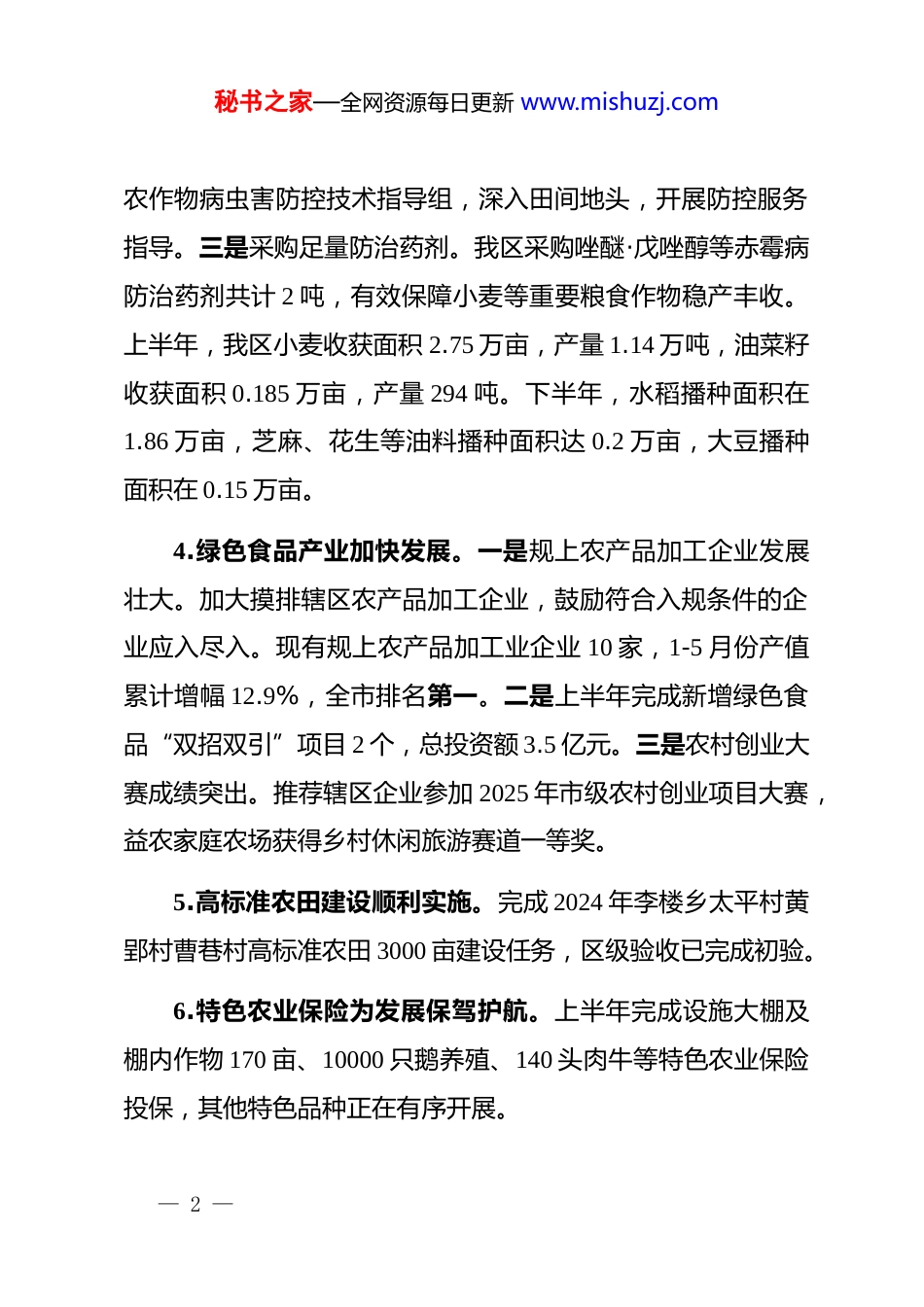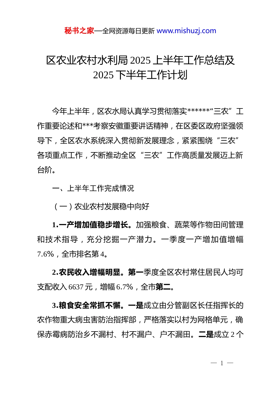 秘书之家—全网资源每日更新 www.mishuzj.com区农业农村水利局 2025 上半年工作总结及2025 下半年工作计划今年上半年,区农水局认真学习贯彻落实******“三农”工作重要论述和***考察安徽重要讲话精神,在区委区政府坚强领导下,全区农水系统深入贯彻新发展理念,紧紧围绕“三农”各项重点工作,不断推动全区“三农”工作高质量发展迈上新台阶。一、上半年工作完成情况(一)农业农村发展稳中向好1.一产增加值稳步增长。加强粮食、蔬菜等作物田间管理和技术指导,充分挖掘一产潜力。一季度一产增加值增幅7.6%,全市排名第 4。2.农民收入增幅明显。第一季度全区农村常住居民人均可支配收入 6637 元,增幅 6.7%,全市第二。3.粮食安全常抓不懈。一是成立由分管副区长任指挥长的农作物重大病虫害防治指挥部,严格落实以村为网格单元,确保赤霉病防治乡不漏村、村不漏户、户不漏田。二是成立 2 个— 1 —秘书之家—全网资源每日更新 www.mishuzj.com农作物病虫害防控技术指导组,深入田间地头,开展防控服务指导。三是采购足量防治药剂。我区采购唑醚·戊唑醇等赤霉病防治药剂共计 2 吨,有效保障小麦等重要粮食作物稳产丰收。上半年,我区小麦收获面积 2.75 万亩,产量 1.14 万吨,油菜籽收获面积 0.185 万亩,产量 294 吨。下半年,水稻播种面积在1.86 万亩,芝麻、花生等油料播种面积达 0.2 万亩,大豆播种面积在 0.15 万亩。4.绿色食品产业加快发展。一是规上农产品加工企业发展壮大。加大摸排辖区农产品加工企业,鼓励符合入规条件的企业应入尽入。现有规上农产品加工业企业 10 家,1-5 月份产值累计增幅 12.9%,全市排名第一。二是上半年完成新增绿色食品“双招双引”项目 2 个,总投资额 3.5 亿元。三是农村创业大赛成绩突出。推荐辖区企业参加 2025 年市级农村创业项目大赛,益农家庭农场获得乡村休闲旅游赛道一等奖。5.高标准农田建设顺利实施。完成 2024 年李楼乡太平村黄郢村曹巷村高标准农田 3000 亩建设任务,区级验收已完成初验。6.特色农业保险为发展保驾护航。上半年完成设施大棚及棚内作物 170 亩、10000 只鹅养殖、140 头肉牛等特色农业保险投保,其他特色品种正在有序开展。— 2 —秘书之家—全网资源每日更新 www.mishuzj.com7.农机工作扎实开展。1.年审联合收割机 17;2.注册登记联合收割机 5 台,拖拉机 4 台;3.驾驶员换证 3 个;4.办理农机购置补贴 36 份,发放补贴金额 15.6 万元;5.发放跨区作业证 17个。8.集体“三资”管理突出问题有效整治。一是加强组织领导,压实工作责任。今年以来区领导主持农村集体“三资”专项整治部署会 2 次,部署 2025 年专项整治重点工作。二是加强资产清查,规范资产管理。年初,我局聘请第三方协助村集体开展集体资产精准清查工作,重点清查核实权属不清的资产、财政扶持资金形成的资产等,做到账实相符、账证相符、账账相符、账表相符。三是开展专项审计,提升整治质效。今年我区确定李楼乡 8 个村开展“三资”管理专项审计。今年以来我局自查发现农村集体“三资”监管问题 33 个,完成了问题整改33 个。市级反馈我区问题 19 个,已完成整改 2 个,剩余问题正在积极推动整改。9.二轮延包工作有序推进。截至目前,全区 133 个村民小组李楼乡 15 个村,133 个村民组,约 5234 户,已全部完成摸底核实并制定了延包方案,延包 5177 户,延包率达 99%。10.多措并举推动村级集体经济发展。一是落实包保村级集— 3 —秘书之家—全网资源每日更新 www.mishuzj.com体经济提质提档制度。二是外出观摩学习先进经验。今年以来,组织村干部先后到固镇县石湖乡康湖村、刘集镇九湾村濠城镇丁楼村、怀远县荆山镇涡南村参观学习农村电商、红糖平菇、赤松茸等产业探索特色产业发展新途径。三是委托第三方对全区集体经济组织的集体资产进行清查。四是扎实推进八里岗村百万羽鹅苗标准化育雏项目,项目计划建设育雏车间 2 栋,并配套建设水、电、道路基础设施等。五是印发《xx 区村干部集体经济经营管理绩效奖励办法》(龙农工办〔2024〕27 号),目...