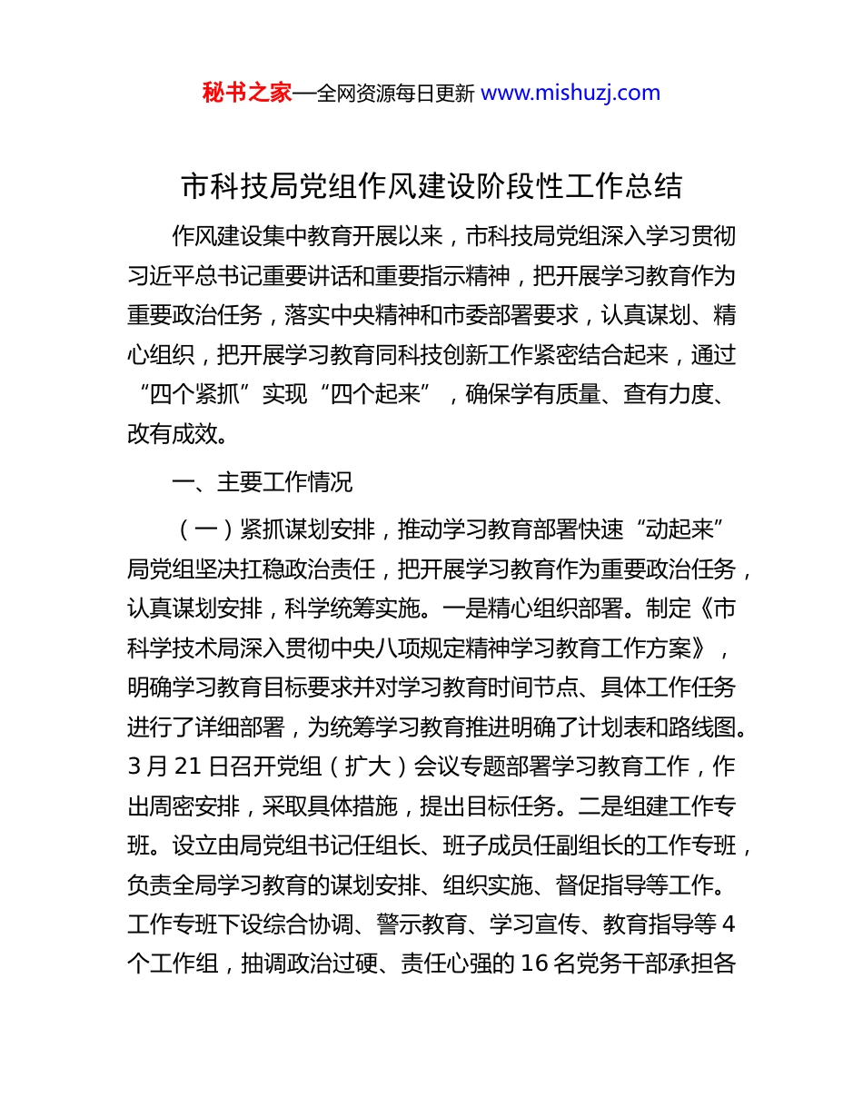 秘书之家—全网资源每日更新 www.mishuzj.com市科技局党组作风建设阶段性工作总结作风建设集中教育开展以来,市科技局党组深入学习贯彻习近平总书记重要讲话和重要指示精神,把开展学习教育作为重要政治任务,落实中央精神和市委部署要求,认真谋划、精心组织,把开展学习教育同科技创新工作紧密结合起来,通过“四个紧抓”实现“四个起来”,确保学有质量、查有力度、改有成效。一、主要工作情况(一)紧抓谋划安排,推动学习教育部署快速“动起来”局党组坚决扛稳政治责任,把开展学习教育作为重要政治任务,认真谋划安排,科学统筹实施。一是精心组织部署。制定《市科学技术局深入贯彻中央八项规定精神学习教育工作方案》,明确学习教育目标要求并对学习教育时间节点、具体工作任务进行了详细部署,为统筹学习教育推进明确了计划表和路线图。3 月 21 日召开党组(扩大)会议专题部署学习教育工作,作出周密安排,采取具体措施,提出目标任务。二是组建工作专班。设立由局党组书记任组长、班子成员任副组长的工作专班,负责全局学习教育的谋划安排、组织实施、督促指导等工作。工作专班下设综合协调、警示教育、学习宣传、教育指导等 4个工作组,抽调政治过硬、责任心强的 16 名党务干部承担各秘书之家—全网资源每日更新 www.mishuzj.com项具体工作。三是加强督促落实。围绕学习教育目标要求和工作方案具体工作,梳理形成工作清单,召开工作专班会议 2次,听取专班汇报,快速形成“领导小组牵头抓总、机关党委统筹联动、各工作组扎实推进、各基层党组织积极参与”的工作格局,高标准严要求推进学习教育各项工作。(二)紧抓理论学习,推动学习教育研学快速“实起来”局党组坚持把认真学习领会习近平总书记关于加强党的作风建设的重要论述作为学习教育的重大政治任务,深入学习领会中央八项规定及其实施细则精神,深入贯彻习近平总书记关于工作的重要论述,紧密结合思想和工作实际,强化理论学习。一是局党组带头示范学。始终把学习贯彻习近平总书记关于加强党的作风建设的重要论述和习近平总书记关于党的建设的重要思想作为局党组“第一议题”、理论中心组学习重要内容、“三会一课”必修课,认真学习贯彻习近平总书记关于深入贯彻中央八项规定精神学习教育的重要讲话和重要指示精神。3月 26 日至 27 日,举办学习教育读书班,深入学习习近平总书记关于加强党的作风建设的重要论述和中央八项规定及其实施细则精神。读书班期间,组织召开了 2025 年局系统全面从严治党暨党风廉政建设工作会,就坚定不移推进全面从严治党,持续开展群众身边不正之风和腐败问题集中整治进行专题部署,邀请专家就提升能力作风建设做了专题辅导报告,4 位班子成员结合实际作交流发言,谈认识感悟和收获体会。二是基层支秘书之家—全网资源每日更新 www.mishuzj.com部全面学。各基层党支部在学习教育启动的同时完成学习计划制定,以“起步即是冲刺”的状态抓好理论学习,围绕习近平总书记关于加强党的作风建设的重要论述,依托“三会一课”组织党员持续开展集中交流学习。推动支部书记先学一步、深学一层,有效提高了机关党员干部整体的理论素养。三是创新载体深入学。局党组书记、局长张锐在局系统全面从严治党暨党风廉政建设工作会上作专题讲话,要求全局基层党组织和广大党员干部要紧扣目标任务,学习贯彻中央八项规定精神,切实把思想和行动统一到党中央和市委工作要求上来,深入开展学习教育。充分运用干部网络学院等线上平台,组织局系统广大党员开展线上学习,抓好个人自学。青工委组织青年党员干部开展集中学习 1 次,青年干部积极参与,踊跃发言,在全局营造了浓厚学习氛围。(三)紧抓开门教育,推动学习教育内容快速“深起来”局党组坚持在开门教育上做细功,领导班子成员以身作则,深化落实“四下基层”制度,推动学习教育走深走实。一是坚持一线调研。领导班子成员带头扑下身子、沉到一线,着力做好调查研究的“深、实、细、准、效”,增加深度调研、驻点调研频次,通过“四不两直”,深入基层、掌握实情、服务群众,在充分摸准实情的基础上努力深挖对策,从矛盾点抓...