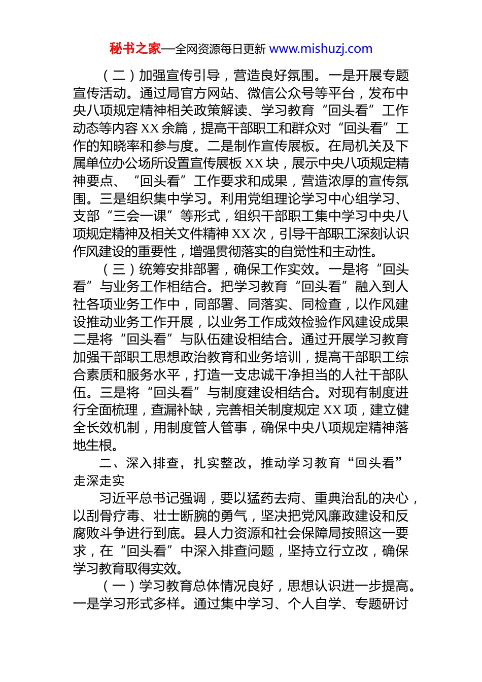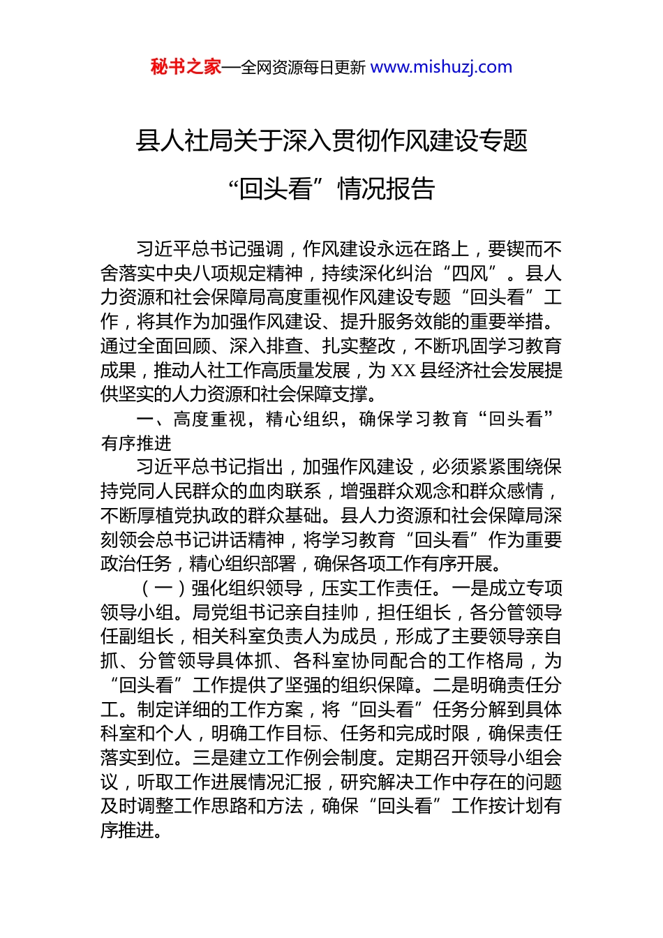 秘书之家—全网资源每日更新 www.mishuzj.com县人社局关于深入贯彻作风建设专题“回头看”情况报告习近平总书记强调,作风建设永远在路上,要锲而不舍落实中央八项规定精神,持续深化纠治“四风”。县人力资源和社会保障局高度重视作风建设专题“回头看”工作,将其作为加强作风建设、提升服务效能的重要举措。通过全面回顾、深入排查、扎实整改,不断巩固学习教育成果,推动人社工作高质量发展,为 XX 县经济社会发展提供坚实的人力资源和社会保障支撑。一、高度重视,精心组织,确保学习教育“回头看”有序推进习近平总书记指出,加强作风建设,必须紧紧围绕保持党同人民群众的血肉联系,增强群众观念和群众感情,不断厚植党执政的群众基础。县人力资源和社会保障局深刻领会总书记讲话精神,将学习教育“回头看”作为重要政治任务,精心组织部署,确保各项工作有序开展。(一)强化组织领导,压实工作责任。一是成立专项领导小组。局党组书记亲自挂帅,担任组长,各分管领导任副组长,相关科室负责人为成员,形成了主要领导亲自抓、分管领导具体抓、各科室协同配合的工作格局,为“回头看”工作提供了坚强的组织保障。二是明确责任分工。制定详细的工作方案,将“回头看”任务分解到具体科室和个人,明确工作目标、任务和完成时限,确保责任落实到位。三是建立工作例会制度。定期召开领导小组会议,听取工作进展情况汇报,研究解决工作中存在的问题及时调整工作思路和方法,确保“回头看”工作按计划有序推进。秘书之家—全网资源每日更新 www.mishuzj.com(二)加强宣传引导,营造良好氛围。一是开展专题宣传活动。通过局官方网站、微信公众号等平台,发布中央八项规定精神相关政策解读、学习教育“回头看”工作动态等内容 XX 余篇,提高干部职工和群众对“回头看”工作的知晓率和参与度。二是制作宣传展板。在局机关及下属单位办公场所设置宣传展板 XX 块,展示中央八项规定精神要点、“回头看”工作要求和成果,营造浓厚的宣传氛围。三是组织集中学习。利用党组理论学习中心组学习、支部“三会一课”等形式,组织干部职工集中学习中央八项规定精神及相关文件精神 XX 次,引导干部职工深刻认识作风建设的重要性,增强贯彻落实的自觉性和主动性。(三)统筹安排部署,确保工作实效。一是将“回头看”与业务工作相结合。把学习教育“回头看”融入到人社各项业务工作中,同部署、同落实、同检查,以作风建设推动业务工作开展,以业务工作成效检验作风建设成果二是将“回头看”与队伍建设相结合。通过开展学习教育加强干部职工思想政治教育和业务培训,提高干部职工综合素质和服务水平,打造一支忠诚干净担当的人社干部队伍。三是将“回头看”与制度建设相结合。对现有制度进行全面梳理,查漏补缺,完善相关制度规定 XX 项,建立健全长效机制,用制度管人管事,确保中央八项规定精神落地生根。二、深入排查,扎实整改,推动学习教育“回头看”走深走实习近平总书记强调,要以猛药去疴、重典治乱的决心,以刮骨疗毒、壮士断腕的勇气,坚决把党风廉政建设和反腐败斗争进行到底。县人力资源和社会保障局按照这一要求,在“回头看”中深入排查问题,坚持立行立改,确保学习教育取得实效。(一)学习教育总体情况良好,思想认识进一步提高。一是学习形式多样。通过集中学习、个人自学、专题研讨秘书之家—全网资源每日更新 www.mishuzj.com线上培训等多种方式,组织干部职工深入学习中央八项规定精神及其实施细则,在“回头看”期间,新开展学习研讨 XX 场次,干部职工参与率达 XX%,实现了学习教育全覆盖。二是学习效果显著。通过学习,干部职工对中央八项规定精神的理解更加深刻,思想认识进一步提高,纪律意识和规矩意识明显增强,形成了自觉遵守规定、抵制“四风”的良好氛围。三是理论联系实际。干部职工能够将学习成果转化为工作动力和实际行动,在工作中主动改进作风,提高服务质量,为群众办实事、解难题的能力进一步提升。(二)工作开展特点突出,创新举措成效显著。一是坚持问题导向。以问题为突破口,对照中央八项规定精神和相关要求,全面排查人社工作中...