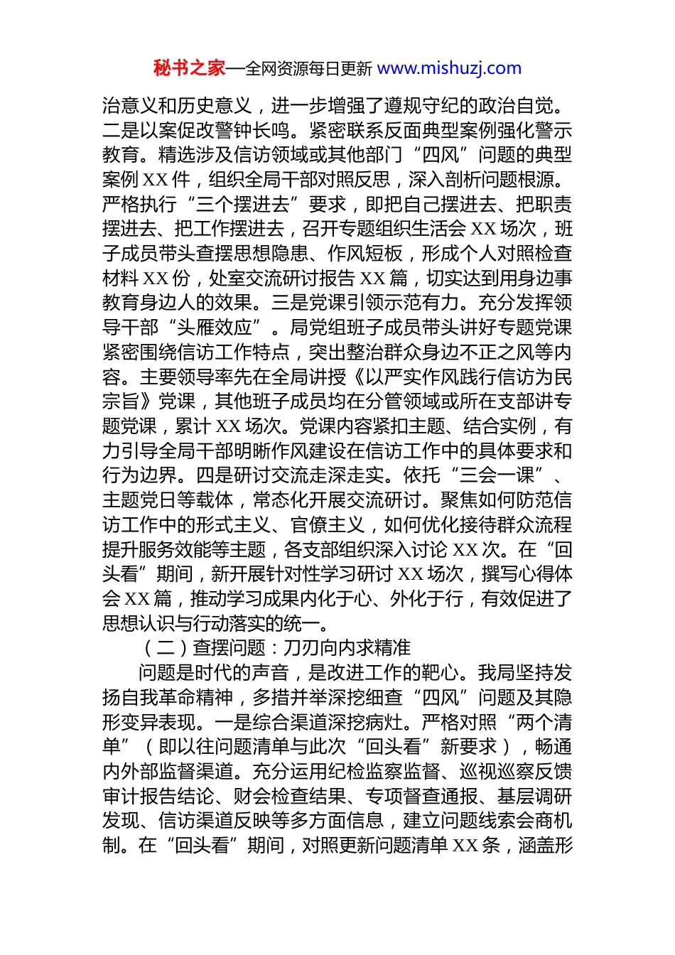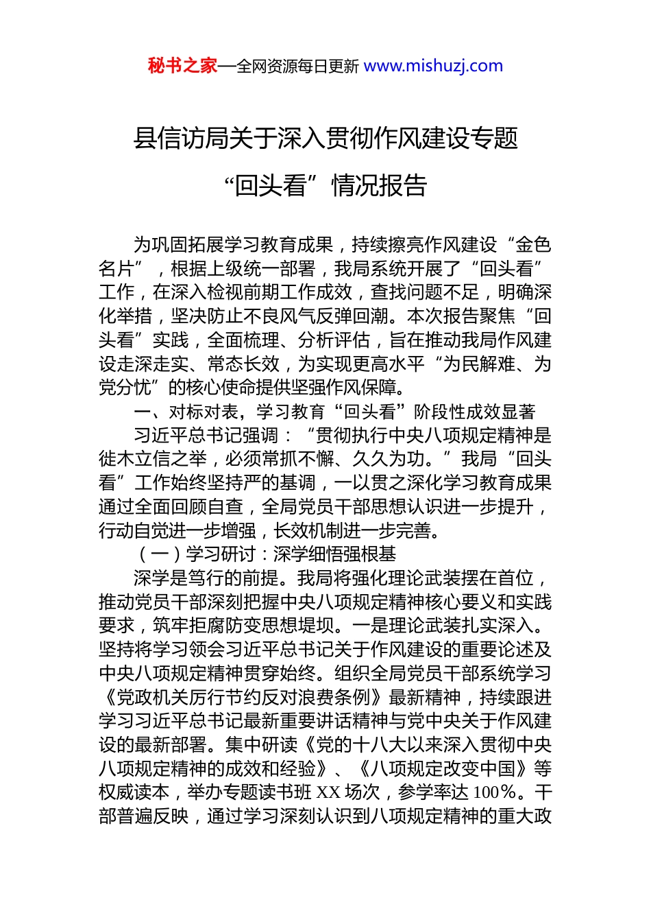 秘书之家—全网资源每日更新 www.mishuzj.com县信访局关于深入贯彻作风建设专题“回头看”情况报告为巩固拓展学习教育成果,持续擦亮作风建设“金色名片”,根据上级统一部署,我局系统开展了“回头看”工作,在深入检视前期工作成效,查找问题不足,明确深化举措,坚决防止不良风气反弹回潮。本次报告聚焦“回头看”实践,全面梳理、分析评估,旨在推动我局作风建设走深走实、常态长效,为实现更高水平“为民解难、为党分忧”的核心使命提供坚强作风保障。一、对标对表,学习教育“回头看”阶段性成效显著习近平总书记强调:“贯彻执行中央八项规定精神是徙木立信之举,必须常抓不懈、久久为功。”我局“回头看”工作始终坚持严的基调,一以贯之深化学习教育成果通过全面回顾自查,全局党员干部思想认识进一步提升,行动自觉进一步增强,长效机制进一步完善。(一)学习研讨:深学细悟强根基深学是笃行的前提。我局将强化理论武装摆在首位,推动党员干部深刻把握中央八项规定精神核心要义和实践要求,筑牢拒腐防变思想堤坝。一是理论武装扎实深入。坚持将学习领会习近平总书记关于作风建设的重要论述及中央八项规定精神贯穿始终。组织全局党员干部系统学习《党政机关厉行节约反对浪费条例》最新精神,持续跟进学习习近平总书记最新重要讲话精神与党中央关于作风建设的最新部署。集中研读《党的十八大以来深入贯彻中央八项规定精神的成效和经验》、《八项规定改变中国》等权威读本,举办专题读书班 XX 场次,参学率达 100%。干部普遍反映,通过学习深刻认识到八项规定精神的重大政秘书之家—全网资源每日更新 www.mishuzj.com治意义和历史意义,进一步增强了遵规守纪的政治自觉。二是以案促改警钟长鸣。紧密联系反面典型案例强化警示教育。精选涉及信访领域或其他部门“四风”问题的典型案例 XX 件,组织全局干部对照反思,深入剖析问题根源。严格执行“三个摆进去”要求,即把自己摆进去、把职责摆进去、把工作摆进去,召开专题组织生活会 XX 场次,班子成员带头查摆思想隐患、作风短板,形成个人对照检查材料 XX 份,处室交流研讨报告 XX 篇,切实达到用身边事教育身边人的效果。三是党课引领示范有力。充分发挥领导干部“头雁效应”。局党组班子成员带头讲好专题党课紧密围绕信访工作特点,突出整治群众身边不正之风等内容。主要领导率先在全局讲授《以严实作风践行信访为民宗旨》党课,其他班子成员均在分管领域或所在支部讲专题党课,累计 XX 场次。党课内容紧扣主题、结合实例,有力引导全局干部明晰作风建设在信访工作中的具体要求和行为边界。四是研讨交流走深走实。依托“三会一课”、主题党日等载体,常态化开展交流研讨。聚焦如何防范信访工作中的形式主义、官僚主义,如何优化接待群众流程提升服务效能等主题,各支部组织深入讨论 XX 次。在“回头看”期间,新开展针对性学习研讨 XX 场次,撰写心得体会 XX 篇,推动学习成果内化于心、外化于行,有效促进了思想认识与行动落实的统一。(二)查摆问题:刀刃向内求精准问题是时代的声音,是改进工作的靶心。我局坚持发扬自我革命精神,多措并举深挖细查“四风”问题及其隐形变异表现。一是综合渠道深挖病灶。严格对照“两个清单”(即以往问题清单与此次“回头看”新要求),畅通内外部监督渠道。充分运用纪检监察监督、巡视巡察反馈审计报告结论、财会检查结果、专项督查通报、基层调研发现、信访渠道反映等多方面信息,建立问题线索会商机制。在“回头看”期间,对照更新问题清单 XX 条,涵盖形秘书之家—全网资源每日更新 www.mishuzj.com式主义、官僚主义、享乐主义、奢靡之风等方面突出问题这些问题的查摆,依托坚实的数据支持和事实依据,确保了问题查找的客观性。二是层层审核把关定向。坚持分级负责、严格把关。局学习教育工作专班对全局各部门(含县区级信访部门)上报的问题清单进行集中会审,重点审核问题查摆是否全面、深入、精准、实在。累计审核清单XX 份,提出修改补充意见 XX 条,退回要求重报 XX 份,确保问题不回避、不遮掩、不虚化。对查摆不深不实的单位进行通报提醒...