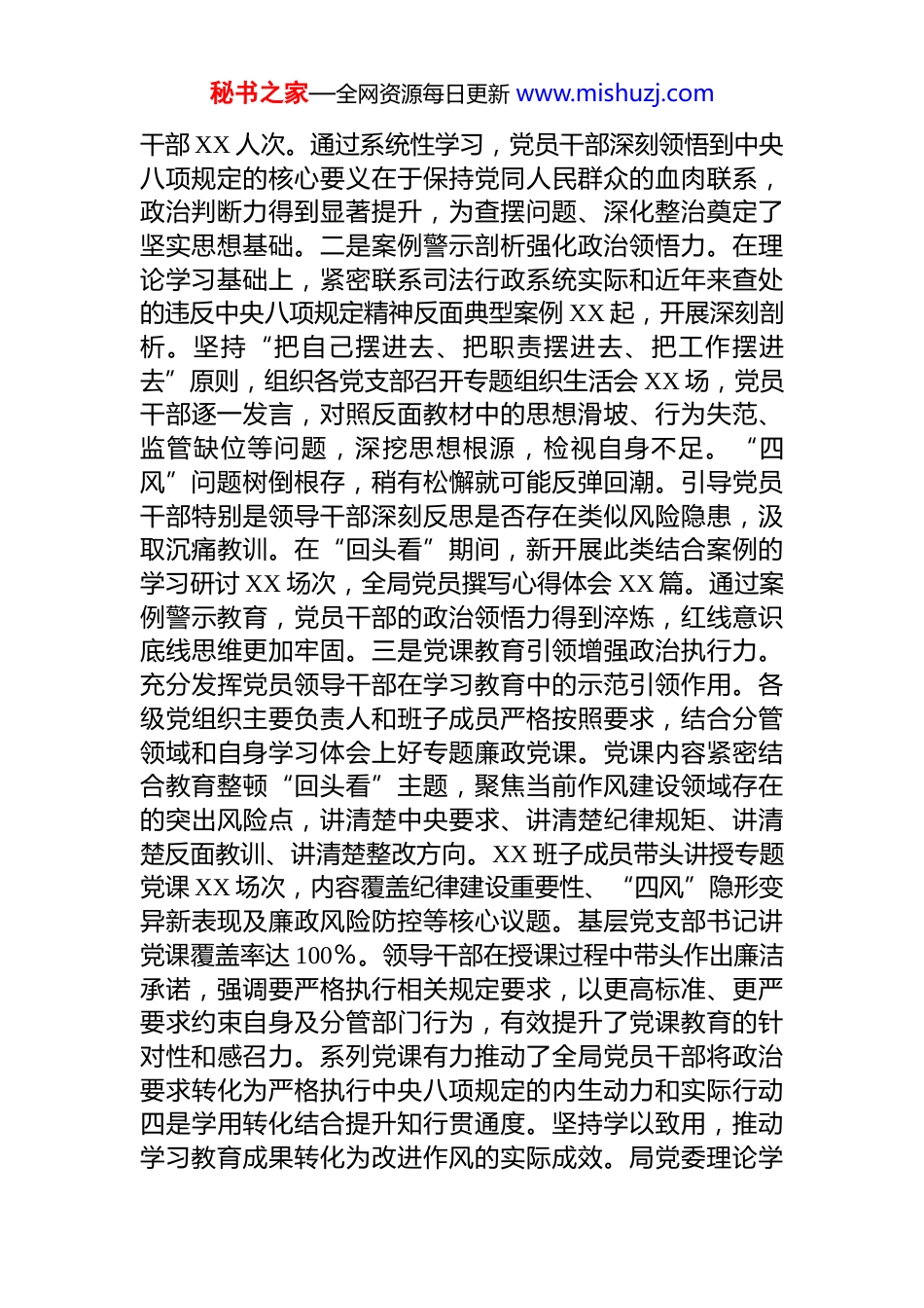 秘书之家—全网资源每日更新 www.mishuzj.com巩固成效启新程,常态长效强作风——关于深入贯彻作风建设专题“回头看”情况报告根据党中央统一部署和省市委工作要求,我局紧密结合司法行政系统职能特点,于 XXXX 年 X 月至 X 月在全局范围内组织开展了作风建设专题“回头看”工作,旨在通过系统性“复检”、靶向性“补短”、机制性“固本”,进一步巩固拓展落实中央八项规定精神成果,推动作风建设向纵深发展。我们坚决对标对表习近平总书记“作风建设永远在路上”的重要指示,着力在深化学习教育、精准查摆问题、狠抓整改整治、强化组织领导等方面下实功、求实效,力求为开创 XX 市司法行政工作新局面提供坚强有力的纪律作风保障。现将有关工作总结报告如下。一、学习教育实践成效与经验总结(一)学习研讨:理论武装铸根基,筑牢拒腐防变思想堤坝。一是理论学习系统深化提升政治判断力。坚持把学习贯彻习近平总书记关于加强党的作风建设的重要论述置于首位,原原本本、逐字逐句学习中央八项规定及其实施细则精神。紧跟中央步伐,及时组织学习习近平总书记最新重要讲话精神 XX 场次,将党的最新理论和要求融入学习研讨全过程。针对性地组织专题学习新修订的《党政机关厉行节约反对浪费条例》及相关辅导读本 XX 场次,深刻领会厉行节约、反对浪费的政治内涵与实践要求。同时,深入研学《党的十八大以来深入贯彻中央八项规定精神的成效和经验》《八项规定改变中国》等权威读本,回顾辉煌成就,汲取历史经验,组织专题读书会 XX 次,覆盖党员秘书之家—全网资源每日更新 www.mishuzj.com干部 XX 人次。通过系统性学习,党员干部深刻领悟到中央八项规定的核心要义在于保持党同人民群众的血肉联系,政治判断力得到显著提升,为查摆问题、深化整治奠定了坚实思想基础。二是案例警示剖析强化政治领悟力。在理论学习基础上,紧密联系司法行政系统实际和近年来查处的违反中央八项规定精神反面典型案例 XX 起,开展深刻剖析。坚持“把自己摆进去、把职责摆进去、把工作摆进去”原则,组织各党支部召开专题组织生活会 XX 场,党员干部逐一发言,对照反面教材中的思想滑坡、行为失范、监管缺位等问题,深挖思想根源,检视自身不足。“四风”问题树倒根存,稍有松懈就可能反弹回潮。引导党员干部特别是领导干部深刻反思是否存在类似风险隐患,汲取沉痛教训。在“回头看”期间,新开展此类结合案例的学习研讨 XX 场次,全局党员撰写心得体会 XX 篇。通过案例警示教育,党员干部的政治领悟力得到淬炼,红线意识底线思维更加牢固。三是党课教育引领增强政治执行力。充分发挥党员领导干部在学习教育中的示范引领作用。各级党组织主要负责人和班子成员严格按照要求,结合分管领域和自身学习体会上好专题廉政党课。党课内容紧密结合教育整顿“回头看”主题,聚焦当前作风建设领域存在的突出风险点,讲清楚中央要求、讲清楚纪律规矩、讲清楚反面教训、讲清楚整改方向。XX 班子成员带头讲授专题党课 XX 场次,内容覆盖纪律建设重要性、“四风”隐形变异新表现及廉政风险防控等核心议题。基层党支部书记讲党课覆盖率达 100%。领导干部在授课过程中带头作出廉洁承诺,强调要严格执行相关规定要求,以更高标准、更严要求约束自身及分管部门行为,有效提升了党课教育的针对性和感召力。系列党课有力推动了全局党员干部将政治要求转化为严格执行中央八项规定的内生动力和实际行动四是学用转化结合提升知行贯通度。坚持学以致用,推动学习教育成果转化为改进作风的实际成效。局党委理论学秘书之家—全网资源每日更新 www.mishuzj.com习中心组带头开展专题研讨 XX 次,班子成员结合学习体会和分管工作,深入交流在行政审批、执法监督、服务窗口等关键环节如何防范廉政风险、优化服务流程。各业务处室和下属单位围绕“学习新思想,作风怎么转”主题开展专题研讨 XX 次,结合公共法律服务、社区矫正、法律援助等具体业务,提出改进工作作风、提升服务效能的务实举措 XX 条。将理论学习与警示教育融入日常业务培训和岗位练兵 XX 场次,切实引导党员干部在提升专业能力的同...