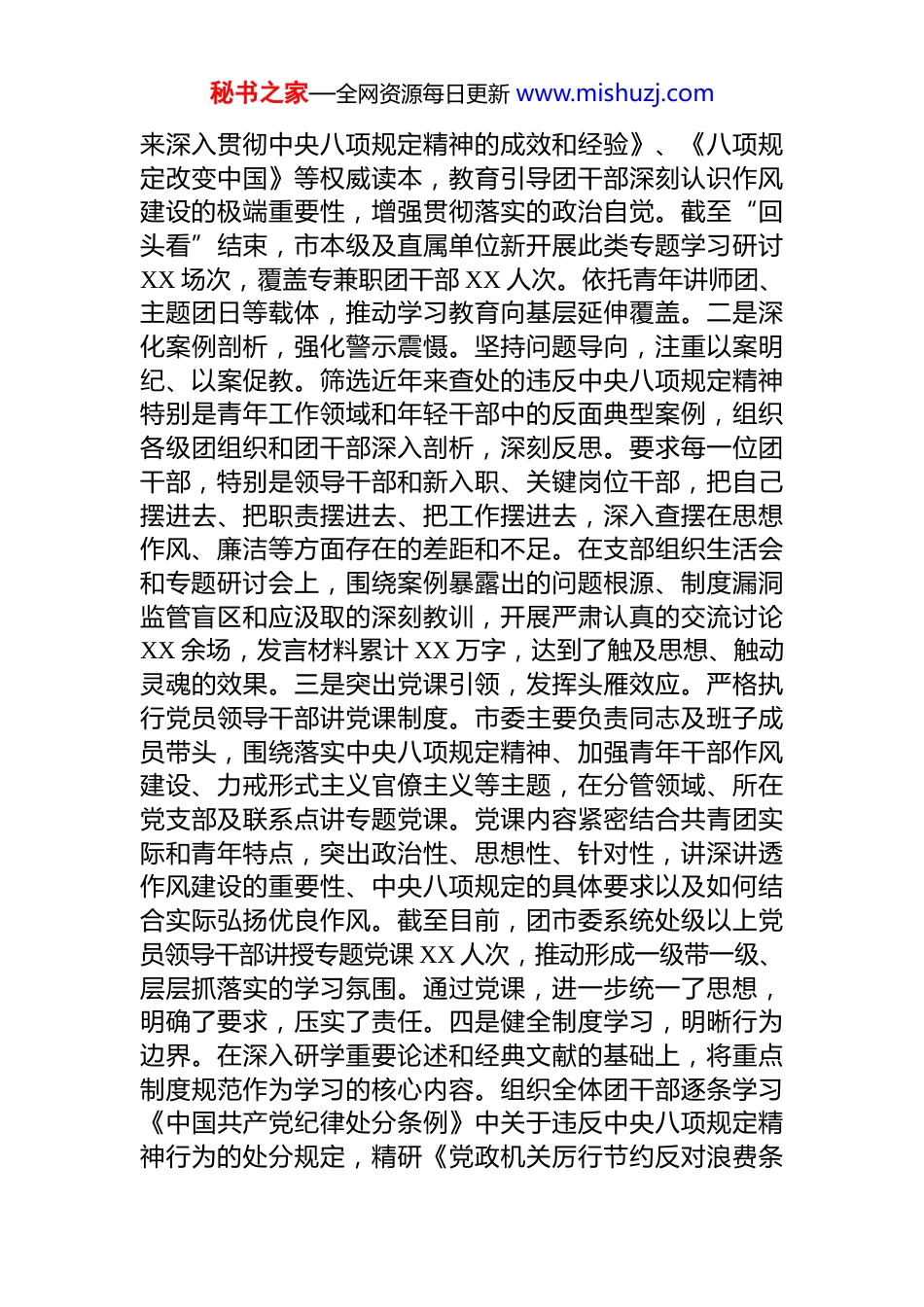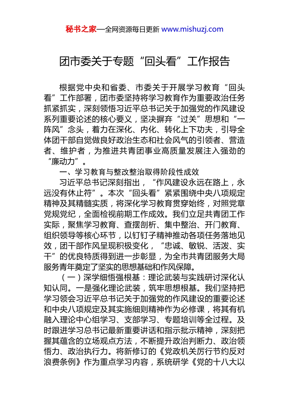 秘书之家—全网资源每日更新 www.mishuzj.com团市委关于专题“回头看”工作报告根据党中央和省委、市委关于开展学习教育“回头看”工作部署,团市委坚持将学习教育作为重要政治任务抓紧抓实,深刻领悟习近平总书记关于加强党的作风建设系列重要论述的核心要义,坚决摒弃“过关”思想和“一阵风”念头,着力在深化、内化、转化上下功夫,引导全体团干部自觉做良好政治生态和社会风气的引领者、营造者、维护者,为推进共青团事业高质量发展注入强劲的“廉动力”。一、学习教育与整改整治取得阶段性成效习近平总书记深刻指出,“作风建设永远在路上,永远没有休止符”。本次“回头看”紧紧围绕中央八项规定精神及其精髓实质,将深化学习教育贯穿始终,对照党章党规党纪,全面检视前期工作成效。我们立足共青团工作实际,聚焦学习教育、查摆剖析、集中整治、开门教育、组织领导等核心环节,以钉钉子精神推动各项任务落地见效,团干部作风呈现积极变化,“忠诚、敏锐、活泼、实干”的优良特质得到进一步彰显,为全市共青团服务大局服务青年奠定了坚实的思想基础和作风保障。(一)深学细悟强根基:理论武装与实践研讨深化认知认同。一是强化理论武装,筑牢思想根基。我们坚持把学习领会习近平总书记关于加强党的作风建设的重要论述和中央八项规定及其实施细则精神作为必修课,将其有机融入理论中心组学习、支部学习、专题培训等全过程。及时跟进学习总书记最新重要讲话和指示批示精神,深刻把握其蕴含的立场观点方法,不断提升政治判断力、政治领悟力、政治执行力。将新修订的《党政机关厉行节约反对浪费条例》作为重点学习内容,系统研学《党的十八大以秘书之家—全网资源每日更新 www.mishuzj.com来深入贯彻中央八项规定精神的成效和经验》、《八项规定改变中国》等权威读本,教育引导团干部深刻认识作风建设的极端重要性,增强贯彻落实的政治自觉。截至“回头看”结束,市本级及直属单位新开展此类专题学习研讨XX 场次,覆盖专兼职团干部 XX 人次。依托青年讲师团、主题团日等载体,推动学习教育向基层延伸覆盖。二是深化案例剖析,强化警示震慑。坚持问题导向,注重以案明纪、以案促教。筛选近年来查处的违反中央八项规定精神特别是青年工作领域和年轻干部中的反面典型案例,组织各级团组织和团干部深入剖析,深刻反思。要求每一位团干部,特别是领导干部和新入职、关键岗位干部,把自己摆进去、把职责摆进去、把工作摆进去,深入查摆在思想作风、廉洁等方面存在的差距和不足。在支部组织生活会和专题研讨会上,围绕案例暴露出的问题根源、制度漏洞监管盲区和应汲取的深刻教训,开展严肃认真的交流讨论XX 余场,发言材料累计 XX 万字,达到了触及思想、触动灵魂的效果。三是突出党课引领,发挥头雁效应。严格执行党员领导干部讲党课制度。市委主要负责同志及班子成员带头,围绕落实中央八项规定精神、加强青年干部作风建设、力戒形式主义官僚主义等主题,在分管领域、所在党支部及联系点讲专题党课。党课内容紧密结合共青团实际和青年特点,突出政治性、思想性、针对性,讲深讲透作风建设的重要性、中央八项规定的具体要求以及如何结合实际弘扬优良作风。截至目前,团市委系统处级以上党员领导干部讲授专题党课 XX 人次,推动形成一级带一级、层层抓落实的学习氛围。通过党课,进一步统一了思想,明确了要求,压实了责任。四是健全制度学习,明晰行为边界。在深入研学重要论述和经典文献的基础上,将重点制度规范作为学习的核心内容。组织全体团干部逐条学习《中国共产党纪律处分条例》中关于违反中央八项规定精神行为的处分规定,精研《党政机关厉行节约反对浪费条秘书之家—全网资源每日更新 www.mishuzj.com例》、《共青团中央关于提高政治站位改进工作作风的六条规定》等具体制度文件。通过集中解读、知识测试、案例对照等方式,使干部们准确理解制度条文的内涵外延,清晰知晓行为红线和底线,确保各项要求入脑入心,转化为日常习惯和行为自觉。组织制度知识应知应会测试 XX 场次,参考人员覆盖率 100%。(二)刀刃向内查病灶:多维聚焦精准画像深挖问题根源。一...