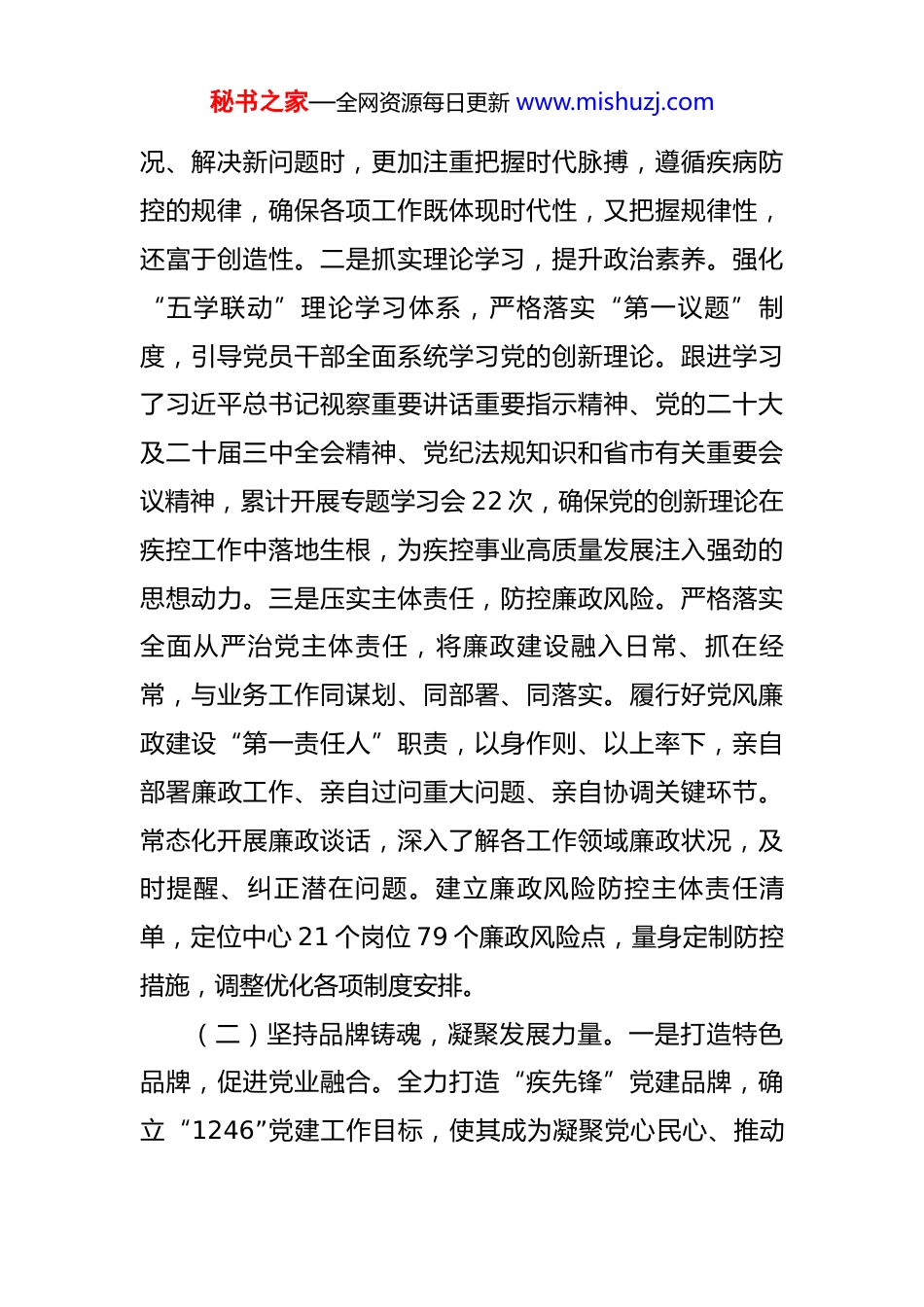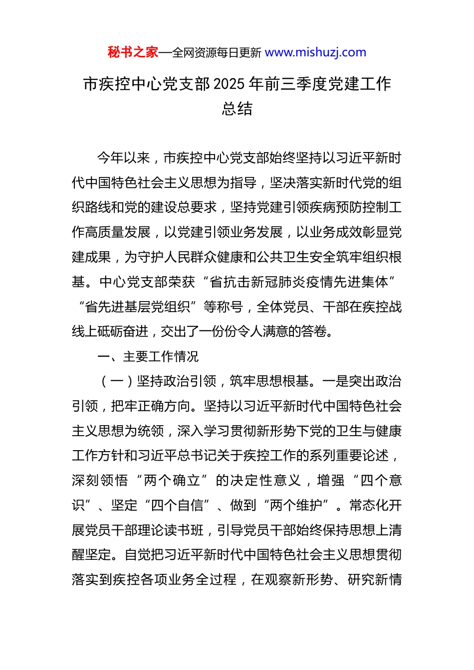 秘书之家—全网资源每日更新 www.mishuzj.com市疾控中心党支部 2025 年前三季度党建工作总结 今年以来,市疾控中心党支部始终坚持以习近平新时代中国特色社会主义思想为指导,坚决落实新时代党的组织路线和党的建设总要求,坚持党建引领疾病预防控制工作高质量发展,以党建引领业务发展,以业务成效彰显党建成果,为守护人民群众健康和公共卫生安全筑牢组织根基。中心党支部荣获“省抗击新冠肺炎疫情先进集体”“省先进基层党组织”等称号,全体党员、干部在疾控战线上砥砺奋进,交出了一份份令人满意的答卷。一、主要工作情况(一)坚持政治引领,筑牢思想根基。一是突出政治引领,把牢正确方向。坚持以习近平新时代中国特色社会主义思想为统领,深入学习贯彻新形势下党的卫生与健康工作方针和习近平总书记关于疾控工作的系列重要论述,深刻领悟“两个确立”的决定性意义,增强“四个意识”、坚定“四个自信”、做到“两个维护”。常态化开展党员干部理论读书班,引导党员干部始终保持思想上清醒坚定。自觉把习近平新时代中国特色社会主义思想贯彻落实到疾控各项业务全过程,在观察新形势、研究新情秘书之家—全网资源每日更新 www.mishuzj.com况、解决新问题时,更加注重把握时代脉搏,遵循疾病防控的规律,确保各项工作既体现时代性,又把握规律性,还富于创造性。二是抓实理论学习,提升政治素养。强化“五学联动”理论学习体系,严格落实“第一议题”制度,引导党员干部全面系统学习党的创新理论。跟进学习了习近平总书记视察重要讲话重要指示精神、党的二十大及二十届三中全会精神、党纪法规知识和省市有关重要会议精神,累计开展专题学习会 22 次,确保党的创新理论在疾控工作中落地生根,为疾控事业高质量发展注入强劲的思想动力。三是压实主体责任,防控廉政风险。严格落实全面从严治党主体责任,将廉政建设融入日常、抓在经常,与业务工作同谋划、同部署、同落实。履行好党风廉政建设“第一责任人”职责,以身作则、以上率下,亲自部署廉政工作、亲自过问重大问题、亲自协调关键环节。常态化开展廉政谈话,深入了解各工作领域廉政状况,及时提醒、纠正潜在问题。建立廉政风险防控主体责任清单,定位中心 21 个岗位 79 个廉政风险点,量身定制防控措施,调整优化各项制度安排。(二)坚持品牌铸魂,凝聚发展力量。一是打造特色品牌,促进党业融合。全力打造“疾先锋”党建品牌,确立“1246”党建工作目标,使其成为凝聚党心民心、推动秘书之家—全网资源每日更新 www.mishuzj.com疾控事业发展的强大引擎。品牌紧密围绕中心工作,全方位提升了中心党建工作的引领力,推动党建与疾控业务协同高质量发展,不断增强党组织的凝聚力和向心力,发挥好党支部的战斗堡垒作用和党员的先锋模范作用,让党旗在疾病防控、预防接种、卫生监督等工作中高高飘扬。二是创新活动载体,彰显品牌活力。一方面,组织形式多样的主题党日活动,如开展书记讲党课、主题演讲、支部共建、结对关爱等系列活动,使党员干部更加深刻地领悟党的初心和使命;参观红色教育基地,让党员干部在红色文化中汲取精神力量,传承革命精神。另一方面,积极探索学习交流平台,兰州大学、中医药大学公共卫生与预防医学教学实践基地相继落户中心,与省疾控中心艾防所党支部开展联学联建,拓宽党建工作的视野和路径,全方位提升党建品牌的影响力。三是聚力技能提升,推进业务质效。依托党建品牌,积极开展各类业务技能竞赛和培训活动,以赛促学、以学促用,不断提升疾控队伍的业务水平和服务能力。在党建品牌引领下,艾滋病确证、病原核酸检测、基因测序等能力不断提升,中心已认证卫生检测项目 233 项,能够开展劳动卫生职业病、食品相关产品及添加剂、环境卫生等 462 项检测服务,为精准监测预警防控传染病筑牢技术支撑。另外,持续推动党建活动与业务工秘书之家—全网资源每日更新 www.mishuzj.com作双融双促,每年开展“岗位练兵、技能比武”“疾控大学习”等活动。比如,举办全市免疫规划、传染病应急、执法大讲堂、职业健康、慢病管理、病媒生物监测技术等技能竞赛与培训班,广泛开展党员先锋模...