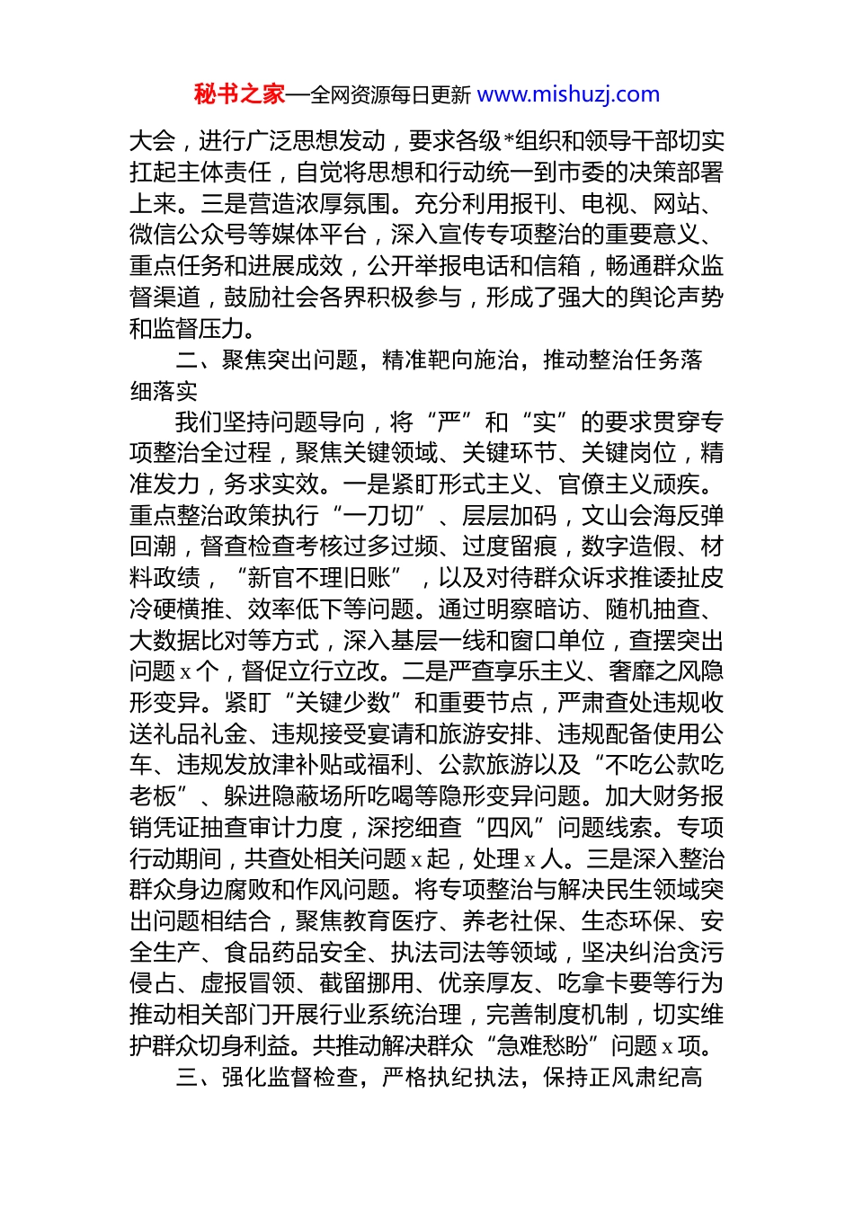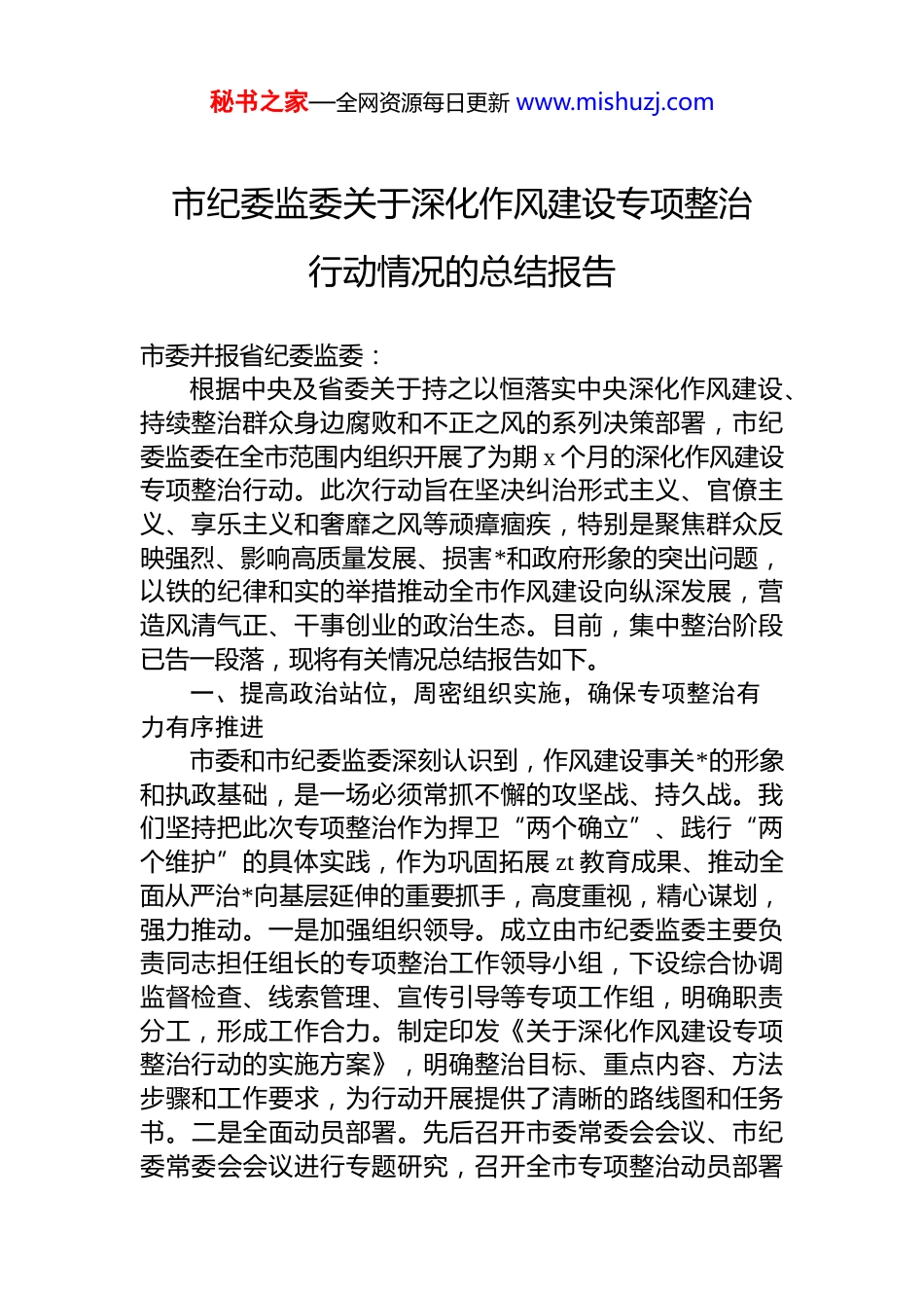 秘书之家—全网资源每日更新 www.mishuzj.com市纪委监委关于深化作风建设专项整治行动情况的总结报告市委并报省纪委监委:根据中央及省委关于持之以恒落实中央深化作风建设、持续整治群众身边腐败和不正之风的系列决策部署,市纪委监委在全市范围内组织开展了为期 x 个月的深化作风建设专项整治行动。此次行动旨在坚决纠治形式主义、官僚主义、享乐主义和奢靡之风等顽瘴痼疾,特别是聚焦群众反映强烈、影响高质量发展、损害*和政府形象的突出问题,以铁的纪律和实的举措推动全市作风建设向纵深发展,营造风清气正、干事创业的政治生态。目前,集中整治阶段已告一段落,现将有关情况总结报告如下。一、提高政治站位,周密组织实施,确保专项整治有力有序推进市委和市纪委监委深刻认识到,作风建设事关*的形象和执政基础,是一场必须常抓不懈的攻坚战、持久战。我们坚持把此次专项整治作为捍卫“两个确立”、践行“两个维护”的具体实践,作为巩固拓展 zt 教育成果、推动全面从严治*向基层延伸的重要抓手,高度重视,精心谋划,强力推动。一是加强组织领导。成立由市纪委监委主要负责同志担任组长的专项整治工作领导小组,下设综合协调监督检查、线索管理、宣传引导等专项工作组,明确职责分工,形成工作合力。制定印发《关于深化作风建设专项整治行动的实施方案》,明确整治目标、重点内容、方法步骤和工作要求,为行动开展提供了清晰的路线图和任务书。二是全面动员部署。先后召开市委常委会会议、市纪委常委会会议进行专题研究,召开全市专项整治动员部署秘书之家—全网资源每日更新 www.mishuzj.com大会,进行广泛思想发动,要求各级*组织和领导干部切实扛起主体责任,自觉将思想和行动统一到市委的决策部署上来。三是营造浓厚氛围。充分利用报刊、电视、网站、微信公众号等媒体平台,深入宣传专项整治的重要意义、重点任务和进展成效,公开举报电话和信箱,畅通群众监督渠道,鼓励社会各界积极参与,形成了强大的舆论声势和监督压力。二、聚焦突出问题,精准靶向施治,推动整治任务落细落实我们坚持问题导向,将“严”和“实”的要求贯穿专项整治全过程,聚焦关键领域、关键环节、关键岗位,精准发力,务求实效。一是紧盯形式主义、官僚主义顽疾。重点整治政策执行“一刀切”、层层加码,文山会海反弹回潮,督查检查考核过多过频、过度留痕,数字造假、材料政绩,“新官不理旧账”,以及对待群众诉求推诿扯皮冷硬横推、效率低下等问题。通过明察暗访、随机抽查、大数据比对等方式,深入基层一线和窗口单位,查摆突出问题 x 个,督促立行立改。二是严查享乐主义、奢靡之风隐形变异。紧盯“关键少数”和重要节点,严肃查处违规收送礼品礼金、违规接受宴请和旅游安排、违规配备使用公车、违规发放津补贴或福利、公款旅游以及“不吃公款吃老板”、躲进隐蔽场所吃喝等隐形变异问题。加大财务报销凭证抽查审计力度,深挖细查“四风”问题线索。专项行动期间,共查处相关问题 x 起,处理 x 人。三是深入整治群众身边腐败和作风问题。将专项整治与解决民生领域突出问题相结合,聚焦教育医疗、养老社保、生态环保、安全生产、食品药品安全、执法司法等领域,坚决纠治贪污侵占、虚报冒领、截留挪用、优亲厚友、吃拿卡要等行为推动相关部门开展行业系统治理,完善制度机制,切实维护群众切身利益。共推动解决群众“急难愁盼”问题 x 项。三、强化监督检查,严格执纪执法,保持正风肃纪高秘书之家—全网资源每日更新 www.mishuzj.com压态势我们综合运用多种监督方式,攥指成拳,形成震慑,确保专项整治不走过场、不打折扣。一是畅通线索渠道。充分发挥信访主渠道作用,建立专项整治问题线索专门台账,实行优先处置、动态管理、限期办结。加强与巡察机构、审计机关、财政、信访等部门的信息互通和线索移交拓宽问题线索来源。二是深化监督检查。整合市县两级监督力量,采取“四不两直”、交叉互查、提级办理等方式开展多轮次、滚动式监督检查。对发现的问题,现场反馈限期整改,对重要线索深挖彻查。三是精准执纪问责。坚持实事求是,精准把握政策界限,综合运用监督执纪“四种...