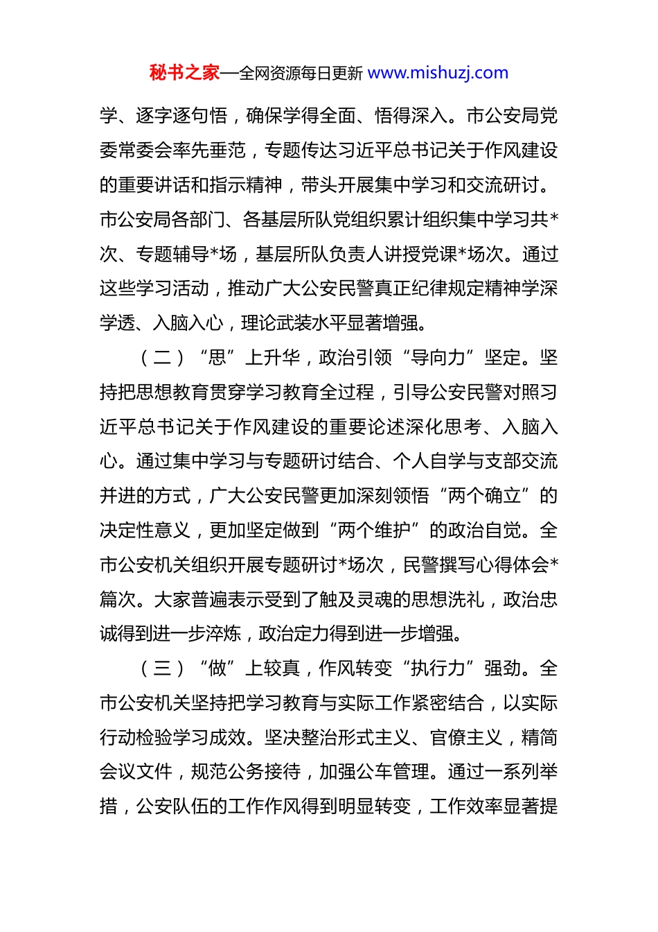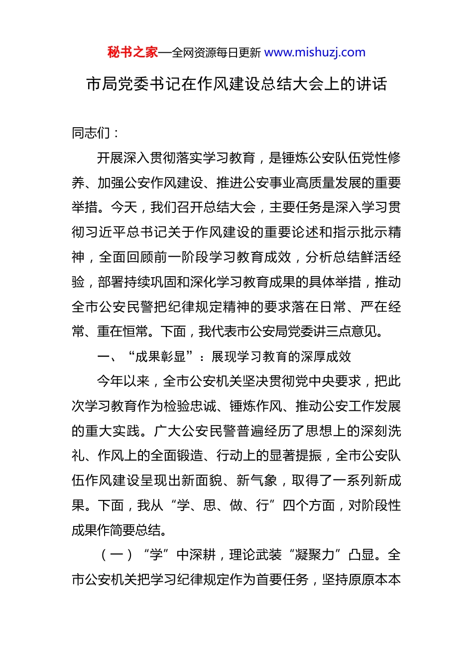 秘书之家—全网资源每日更新 www.mishuzj.com市局党委书记在作风建设总结大会上的讲话 同志们:开展深入贯彻落实学习教育,是锤炼公安队伍党性修养、加强公安作风建设、推进公安事业高质量发展的重要举措。今天,我们召开总结大会,主要任务是深入学习贯彻习近平总书记关于作风建设的重要论述和指示批示精神,全面回顾前一阶段学习教育成效,分析总结鲜活经验,部署持续巩固和深化学习教育成果的具体举措,推动全市公安民警把纪律规定精神的要求落在日常、严在经常、重在恒常。下面,我代表市公安局党委讲三点意见。一、“成果彰显”:展现学习教育的深厚成效今年以来,全市公安机关坚决贯彻党中央要求,把此次学习教育作为检验忠诚、锤炼作风、推动公安工作发展的重大实践。广大公安民警普遍经历了思想上的深刻洗礼、作风上的全面锻造、行动上的显著提振,全市公安队伍作风建设呈现出新面貌、新气象,取得了一系列新成果。下面,我从“学、思、做、行”四个方面,对阶段性成果作简要总结。(一)“学”中深耕,理论武装“凝聚力”凸显。全市公安机关把学习纪律规定作为首要任务,坚持原原本本秘书之家—全网资源每日更新 www.mishuzj.com学、逐字逐句悟,确保学得全面、悟得深入。市公安局党委常委会率先垂范,专题传达习近平总书记关于作风建设的重要讲话和指示精神,带头开展集中学习和交流研讨。市公安局各部门、各基层所队党组织累计组织集中学习共*次、专题辅导*场,基层所队负责人讲授党课*场次。通过这些学习活动,推动广大公安民警真正纪律规定精神学深学透、入脑入心,理论武装水平显著增强。(二)“思”上升华,政治引领“导向力”坚定。坚持把思想教育贯穿学习教育全过程,引导公安民警对照习近平总书记关于作风建设的重要论述深化思考、入脑入心。通过集中学习与专题研讨结合、个人自学与支部交流并进的方式,广大公安民警更加深刻领悟“两个确立”的决定性意义,更加坚定做到“两个维护”的政治自觉。全市公安机关组织开展专题研讨*场次,民警撰写心得体会*篇次。大家普遍表示受到了触及灵魂的思想洗礼,政治忠诚得到进一步淬炼,政治定力得到进一步增强。(三)“做”上较真,作风转变“执行力”强劲。全市公安机关坚持把学习教育与实际工作紧密结合,以实际行动检验学习成效。坚决整治形式主义、官僚主义,精简会议文件,规范公务接待,加强公车管理。通过一系列举措,公安队伍的工作作风得到明显转变,工作效率显著提秘书之家—全网资源每日更新 www.mishuzj.com高。全市公安机关会议数量同比减少*%,文件印发数量同比下降*%,公务接待费用大幅降低。同时,广大公安民警深入基层、深入群众,积极为群众办实事、解难题,受到了群众的广泛好评。(四)“行”上见效,公安工作“推动力”充沛。通过学习教育,全市公安机关将纪律规定精神转化为推动公安工作发展的强大动力。在维护社会稳定、打击违法犯罪、服务人民群众等方面取得了显著成效。全市刑事案件发案数同比下降*%,破案率同比提高*%,群众安全感和满意度进一步提升。广大公安民警以更加饱满的热情、更加昂扬的斗志投入到各项公安工作中,为维护全市社会大局稳定、保障人民群众生命财产安全作出了重要贡献。二、“举措得力”:彰显作风锤炼的坚定力度为确保学习教育取得实效,全市公安机关聚焦关键环节,采取了一系列有力举措,彰显了作风锤炼的坚定力度。(一)聚焦“责任落实”,拧紧责任传导链条。市公安局党委高度重视学习教育工作,成立了以党委书记为组长的学习教育领导小组,明确了各级党组织的主体责任和党组织负责人的第一责任人责任。通过层层签订责任状,将学习教育任务分解到每个部门、每个岗位、每个民警,秘书之家—全网资源每日更新 www.mishuzj.com形成了一级抓一级、层层抓落实的责任体系。同时,加强对责任落实情况的监督检查,对工作不力的单位和个人进行严肃问责,确保责任传导不脱节、不弱化。(二)聚焦“方式创新”,丰富学习载体手段。全市公安机关积极创新学习方式方法,丰富学习载体手段。除了传统的集中学习、专题辅导、党课教育外,还充分利用互联网、新媒体等平台,开展...