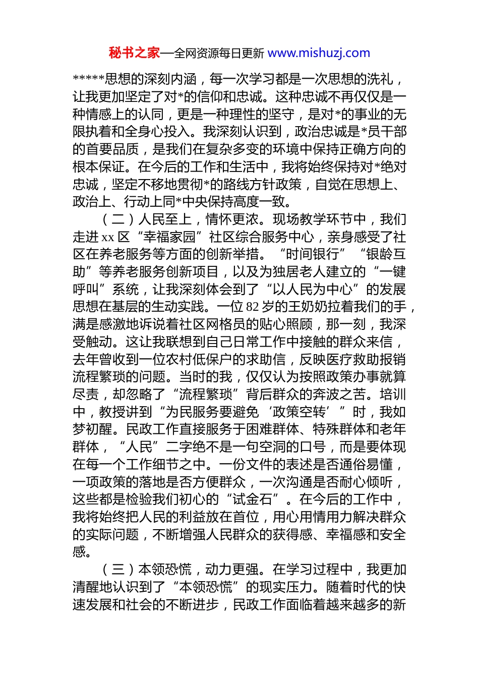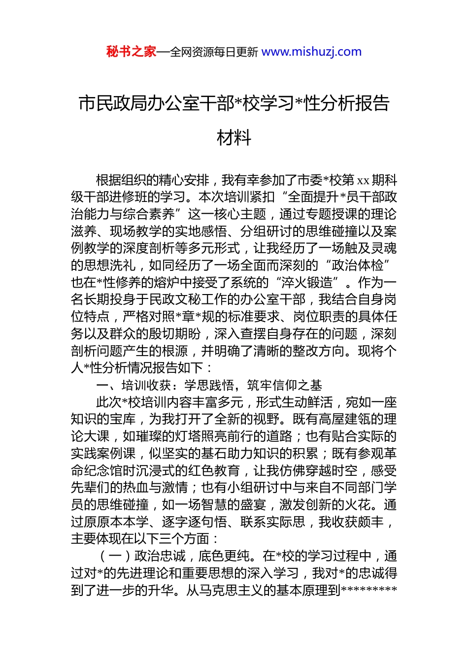 秘书之家—全网资源每日更新 www.mishuzj.com市民政局办公室干部*校学习*性分析报告材料根据组织的精心安排,我有幸参加了市委*校第 xx 期科级干部进修班的学习。本次培训紧扣“全面提升*员干部政治能力与综合素养”这一核心主题,通过专题授课的理论滋养、现场教学的实地感悟、分组研讨的思维碰撞以及案例教学的深度剖析等多元形式,让我经历了一场触及灵魂的思想洗礼,如同经历了一场全面而深刻的“政治体检”也在*性修养的熔炉中接受了系统的“淬火锻造”。作为一名长期投身于民政文秘工作的办公室干部,我结合自身岗位特点,严格对照*章*规的标准要求、岗位职责的具体任务以及群众的殷切期盼,深入查摆自身存在的问题,深刻剖析问题产生的根源,并明确了清晰的整改方向。现将个人*性分析情况报告如下:一、培训收获:学思践悟,筑牢信仰之基此次*校培训内容丰富多元,形式生动鲜活,宛如一座知识的宝库,为我打开了全新的视野。既有高屋建瓴的理论大课,如璀璨的灯塔照亮前行的道路;也有贴合实际的实践案例课,似坚实的基石助力知识的积累;既有参观革命纪念馆时沉浸式的红色教育,让我仿佛穿越时空,感受先辈们的热血与激情;也有小组研讨中与来自不同部门学员的思维碰撞,如一场智慧的盛宴,激发创新的火花。通过原原本本学、逐字逐句悟、联系实际思,我收获颇丰,主要体现在以下三个方面:(一)政治忠诚,底色更纯。在*校的学习过程中,通过对*的先进理论和重要思想的深入学习,我对*的忠诚得到了进一步的升华。从马克思主义的基本原理到*********秘书之家—全网资源每日更新 www.mishuzj.com*****思想的深刻内涵,每一次学习都是一次思想的洗礼,让我更加坚定了对*的信仰和忠诚。这种忠诚不再仅仅是一种情感上的认同,更是一种理性的坚守,是对*的事业的无限执着和全身心投入。我深刻认识到,政治忠诚是*员干部的首要品质,是我们在复杂多变的环境中保持正确方向的根本保证。在今后的工作和生活中,我将始终保持对*绝对忠诚,坚定不移地贯彻*的路线方针政策,自觉在思想上、政治上、行动上同*中央保持高度一致。(二)人民至上,情怀更浓。现场教学环节中,我们走进 xx 区“幸福家园”社区综合服务中心,亲身感受了社区在养老服务等方面的创新举措。“时间银行”“银龄互助”等养老服务创新项目,以及为独居老人建立的“一键呼叫”系统,让我深刻体会到了“以人民为中心”的发展思想在基层的生动实践。一位 82 岁的王奶奶拉着我们的手,满是感激地诉说着社区网格员的贴心照顾,那一刻,我深受触动。这让我联想到自己日常工作中接触的群众来信,去年曾收到一位农村低保户的求助信,反映医疗救助报销流程繁琐的问题。当时的我,仅仅认为按照政策办事就算尽责,却忽略了“流程繁琐”背后群众的奔波之苦。培训中,教授讲到“为民服务要避免‘政策空转’”时,我如梦初醒。民政工作直接服务于困难群体、特殊群体和老年群体,“人民”二字绝不是一句空洞的口号,而是要体现在每一个工作细节之中。一份文件的表述是否通俗易懂,一项政策的落地是否方便群众,一次沟通是否耐心倾听,这些都是检验我们初心的“试金石”。在今后的工作中,我将始终把人民的利益放在首位,用心用情用力解决群众的实际问题,不断增强人民群众的获得感、幸福感和安全感。(三)本领恐慌,动力更强。在学习过程中,我更加清醒地认识到了“本领恐慌”的现实压力。随着时代的快速发展和社会的不断进步,民政工作面临着越来越多的新秘书之家—全网资源每日更新 www.mishuzj.com挑战和新问题。作为一名民政文秘干部,我深刻意识到自己在知识储备、专业技能和创新能力等方面还存在着诸多不足。这种“本领恐慌”感让我产生了强烈的学习动力和紧迫感。我深知,只有不断学习、不断提升自己的能力,才能更好地适应新时代民政工作的要求。在今后的工作中我将加强学习,努力拓宽自己的知识面,提高自己的业务水平和综合素质,不断增强解决实际问题的能力,以更加饱满的热情和更加昂扬的斗志投入到工作中去。二、问题查摆:对标对表,找准差距所在(一)理论学习:学用脱节,政治能力根基不深。在理论学习...