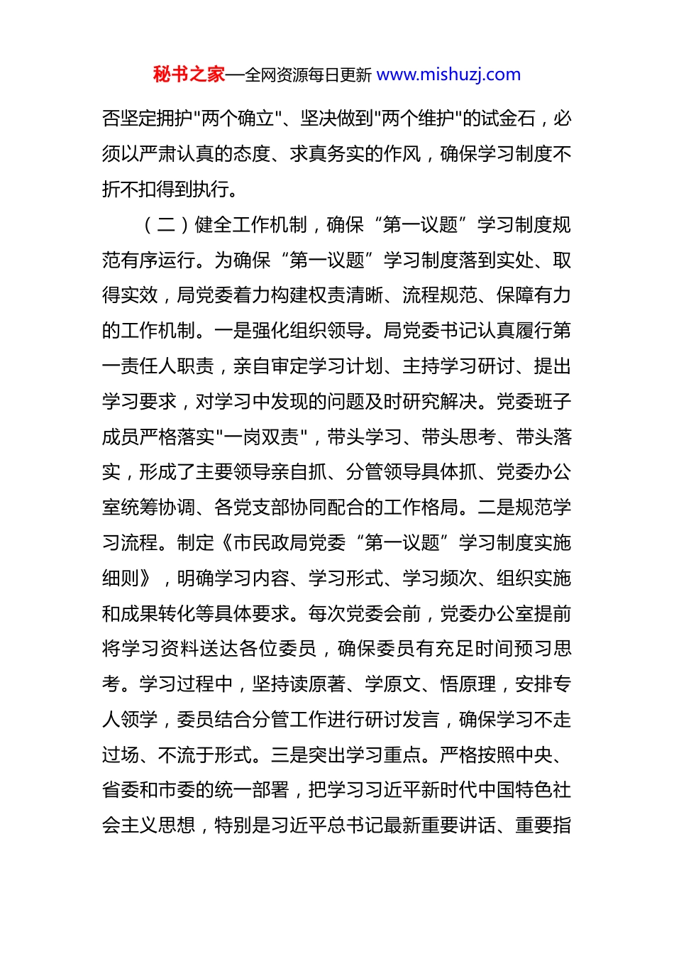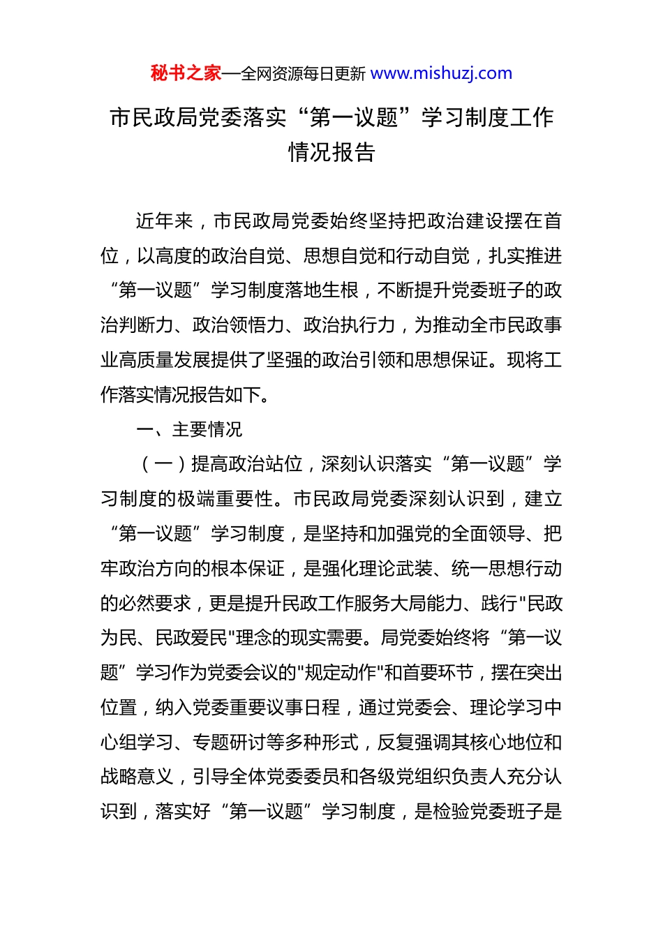 秘书之家—全网资源每日更新 www.mishuzj.com市民政局党委落实“第一议题”学习制度工作情况报告 近年来,市民政局党委始终坚持把政治建设摆在首位,以高度的政治自觉、思想自觉和行动自觉,扎实推进“第一议题”学习制度落地生根,不断提升党委班子的政治判断力、政治领悟力、政治执行力,为推动全市民政事业高质量发展提供了坚强的政治引领和思想保证。现将工作落实情况报告如下。一、主要情况(一)提高政治站位,深刻认识落实“第一议题”学习制度的极端重要性。市民政局党委深刻认识到,建立“第一议题”学习制度,是坚持和加强党的全面领导、把牢政治方向的根本保证,是强化理论武装、统一思想行动的必然要求,更是提升民政工作服务大局能力、践行"民政为民、民政爱民"理念的现实需要。局党委始终将“第一议题”学习作为党委会议的"规定动作"和首要环节,摆在突出位置,纳入党委重要议事日程,通过党委会、理论学习中心组学习、专题研讨等多种形式,反复强调其核心地位和战略意义,引导全体党委委员和各级党组织负责人充分认识到,落实好“第一议题”学习制度,是检验党委班子是秘书之家—全网资源每日更新 www.mishuzj.com否坚定拥护"两个确立"、坚决做到"两个维护"的试金石,必须以严肃认真的态度、求真务实的作风,确保学习制度不折不扣得到执行。(二)健全工作机制,确保“第一议题”学习制度规范有序运行。为确保“第一议题”学习制度落到实处、取得实效,局党委着力构建权责清晰、流程规范、保障有力的工作机制。一是强化组织领导。局党委书记认真履行第一责任人职责,亲自审定学习计划、主持学习研讨、提出学习要求,对学习中发现的问题及时研究解决。党委班子成员严格落实"一岗双责",带头学习、带头思考、带头落实,形成了主要领导亲自抓、分管领导具体抓、党委办公室统筹协调、各党支部协同配合的工作格局。二是规范学习流程。制定《市民政局党委“第一议题”学习制度实施细则》,明确学习内容、学习形式、学习频次、组织实施和成果转化等具体要求。每次党委会前,党委办公室提前将学习资料送达各位委员,确保委员有充足时间预习思考。学习过程中,坚持读原著、学原文、悟原理,安排专人领学,委员结合分管工作进行研讨发言,确保学习不走过场、不流于形式。三是突出学习重点。严格按照中央、省委和市委的统一部署,把学习习近平新时代中国特色社会主义思想,特别是习近平总书记最新重要讲话、重要指秘书之家—全网资源每日更新 www.mishuzj.com示批示精神和党中央重大决策部署作为“第一议题”的核心内容。重点聚焦习近平总书记关于民政工作、民生保障、社会治理等重要论述和指示批示精神,做到学习内容与民政事业发展紧密结合,确保学习的针对性和指导性。四是完善保障机制。党委办公室负责“第一议题”学习的日常组织、资料准备、记录存档等工作,确保学习资料的权威性和及时性。将“第一议题”学习情况纳入党委班子民主生活会对照检查和年度党建工作考核的重要内容,定期对下级党组织落实情况进行督导检查,对学习不认真、落实不到位的及时通报批评,督促整改。(三)聚焦学习重点,着力提升“第一议题”学习的政治性和针对性。局党委始终坚持把学习贯彻习近平新时代中国特色社会主义思想作为“第一议题”的永恒主题和核心内容,紧密结合民政工作实际和时代发展要求,精准把握学习重点。一是突出政治引领。持续深入学习习近平总书记在党的二十大和二十届历次全会上的重要讲话精神,深刻理解其核心要义、精神实质、丰富内涵和实践要求。及时跟进学习习近平总书记最新发表的重要讲话、作出的重要指示批示,特别是关于本地区本领域工作的重要指示批示精神,深刻领会其中蕴含的政治立场、政治智慧和政治要求,确保在思想上政治上行动上同以习近平同志秘书之家—全网资源每日更新 www.mishuzj.com为核心的党中央保持高度一致。二是紧扣民政主业。重点学习习近平总书记关于保障和改善民生、加强基层治理体系和治理能力现代化建设、发展养老事业和养老产业、健全社会保障体系、推进慈善事业发展、做好残疾人福利保障、加强儿童福利和权益保护等与民政工作息息相...