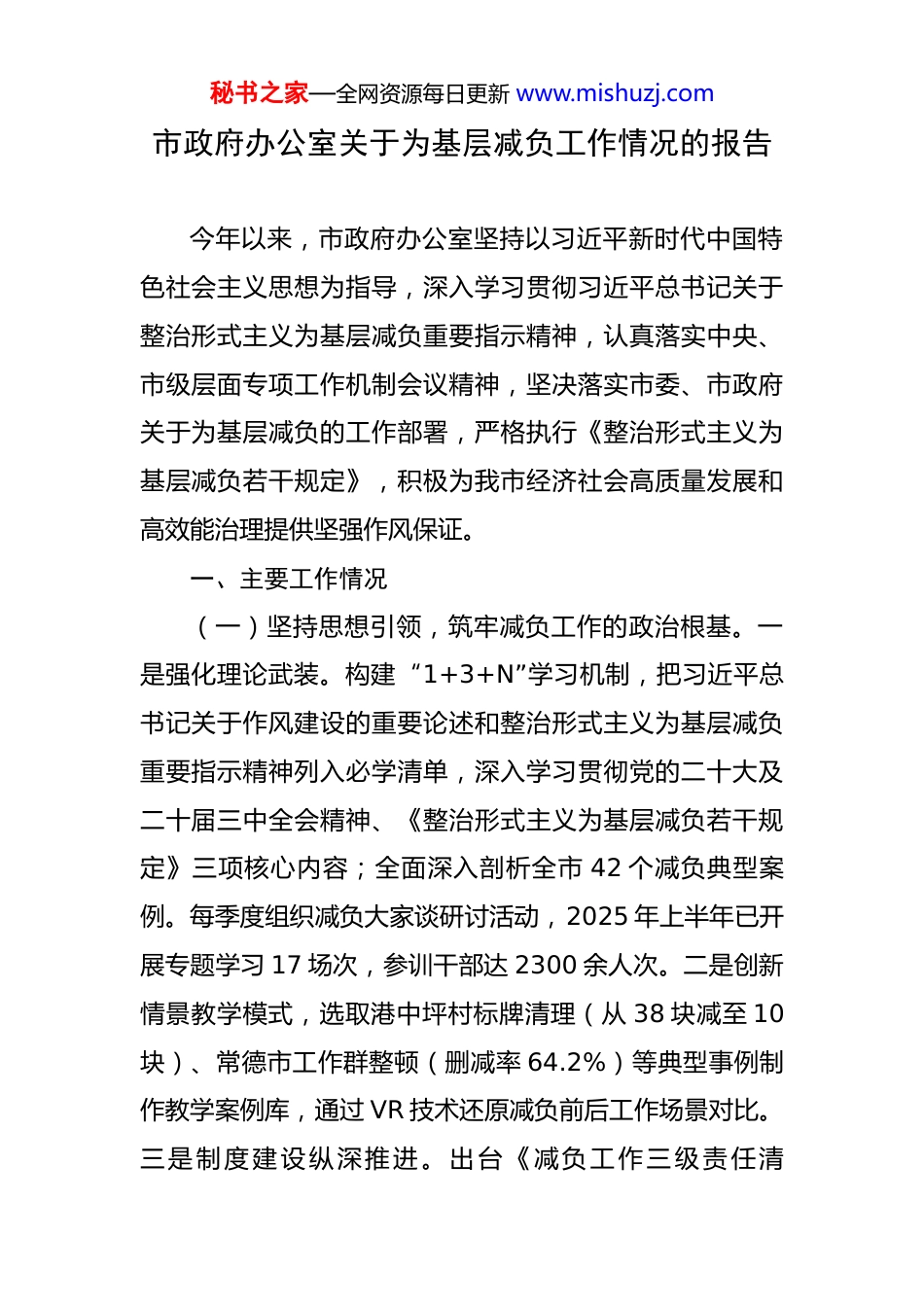 秘书之家—全网资源每日更新 www.mishuzj.com市政府办公室关于为基层减负工作情况的报告 今年以来,市政府办公室坚持以习近平新时代中国特色社会主义思想为指导,深入学习贯彻习近平总书记关于整治形式主义为基层减负重要指示精神,认真落实中央、市级层面专项工作机制会议精神,坚决落实市委、市政府关于为基层减负的工作部署,严格执行《整治形式主义为基层减负若干规定》,积极为我市经济社会高质量发展和高效能治理提供坚强作风保证。一、主要工作情况(一)坚持思想引领,筑牢减负工作的政治根基。一是强化理论武装。构建“1+3+N”学习机制,把习近平总书记关于作风建设的重要论述和整治形式主义为基层减负重要指示精神列入必学清单,深入学习贯彻党的二十大及二十届三中全会精神、《整治形式主义为基层减负若干规定》三项核心内容;全面深入剖析全市 42 个减负典型案例。每季度组织减负大家谈研讨活动,2025 年上半年已开展专题学习 17 场次,参训干部达 2300 余人次。二是创新情景教学模式,选取港中坪村标牌清理(从 38 块减至 10块)、常德市工作群整顿(删减率 64.2%)等典型事例制作教学案例库,通过 VR 技术还原减负前后工作场景对比。三是制度建设纵深推进。出台《减负工作三级责任清秘书之家—全网资源每日更新 www.mishuzj.com单》,明确市、区县、乡镇街道 68 项权责边界,建立基层点单-部门接单-纪委督单的诉求响应机制。配套制定《减负事项负面清单》,严禁 11 类变相摊派行为,如不得要求社区出具奇葩证明、不得强制关注政务公众号等。推行双随机一公开检查制度,对文件会议实行季度抽查+年度普查,2025 年二季度抽查文件合规率达 92%,较去年同期提升 15 个百分点。(二)严格对表对标,构建精文减会长效机制。一是推进文件管理全流程再造。开发智能审核系统,嵌入五不发自动识别模块(即法律法规已明确的不发、照搬照抄上级文件的不发、能合并发文的不发、电话网络可解决的不发、无实质内容的不发),系统运行半年来拦截不合规发文申请 47 件。建立白黄红三色预警,白牌(月度发文量≤控制值)、黄牌(超控制值 10%)、红牌(超控制值20%)。2025 年 1-6 月市政府系统发文总量同比下降38.6%,红牌预警单位同比减少 82%。二是推进会议提质增效工程。实施三并三转改革,并同类会议(如将安全生产、防汛抗旱等 5 个专题会合并为应急管理季度会)、转现场会议为视频会议、转长篇汇报为数据看板。典型案例显示,某区通过改革使季度会议时长压缩 53%。创新会议效能评估机制,设置议程精准度、决策转化率等 6 项KPI,2025 年上半年市政府常务会议决策事项落实率提升秘书之家—全网资源每日更新 www.mishuzj.com至 89.3%。(三)着力统筹规范,打造督查检查新范式。一是强化督查计划动态管理。构建“3+X”年度督查体系,3 为重大政策落实、民生实事、安全稳定三类必督事项;X 为经专项审批的临时督查,2025 年备案督查事项较 2024 年减少41 项,降幅达 27%。推广“无人机+物联网”督查,在生态环境、城市管理等领域应用智能巡检,某河道整治项目通过无人机航拍对比,减少现场检查频次 80%。二是推进考核评价体系重构。建立三考合一机制,整合目标考核、绩效评估、专项督查,设计 25 个共性指标和 17 个差异化指标。某街道反映台账资料从年均 156 份减至 43 份。试点无感考核模式,通过政务大数据平台自动抓取工作成效,对社区服务满意度等指标实行静默采集,已覆盖全市62 个试点社区。(四)精准服务决策,强化调研成果转化。一是推进调研工作标准化建设。制定《调研工作十不准》,包括不准要求基层准备书面汇报(改为现场问答)、不准临时增加调研点、不准超范围陪同等。执行以来基层接待工作量下降 61%。开发调研需求对接平台,基层可在线提交需市级协调的痛点问题,2025 年累计收集问题 487 个,解决率达 93.6%,典型如某工业园区反映的 26 项重复填报数据问题得到根治。二是强化成果转化闭环管理。建立三库秘书之家—全网资源每日更新 www.mishuzj.com一单机制,问题库(收集基层难题)、对策库...