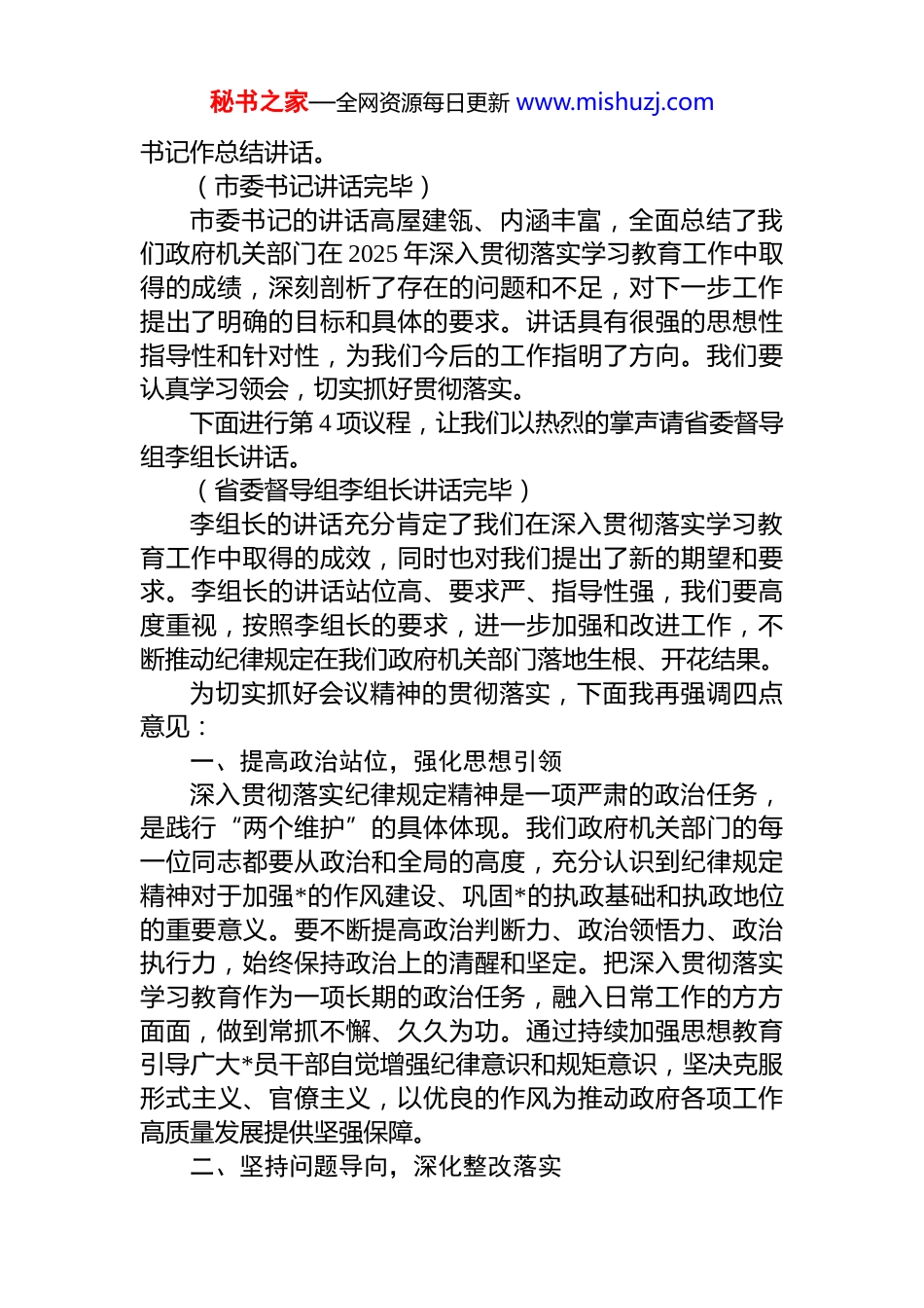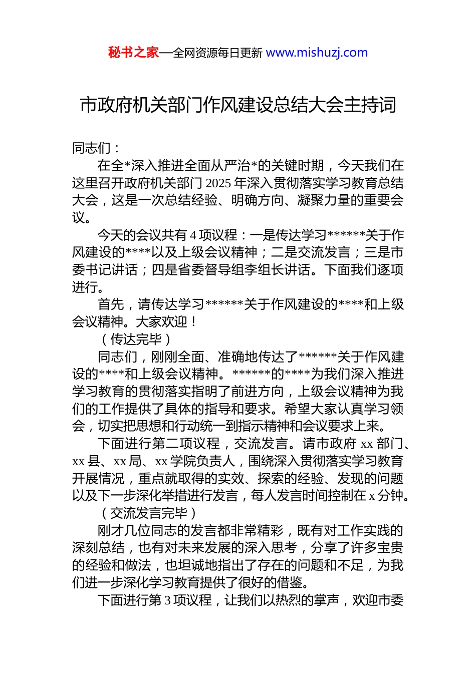 秘书之家—全网资源每日更新 www.mishuzj.com市政府机关部门作风建设总结大会主持词同志们:在全*深入推进全面从严治*的关键时期,今天我们在这里召开政府机关部门 2025 年深入贯彻落实学习教育总结大会,这是一次总结经验、明确方向、凝聚力量的重要会议。今天的会议共有 4 项议程:一是传达学习******关于作风建设的****以及上级会议精神;二是交流发言;三是市委书记讲话;四是省委督导组李组长讲话。下面我们逐项进行。首先,请传达学习******关于作风建设的****和上级会议精神。大家欢迎!(传达完毕)同志们,刚刚全面、准确地传达了******关于作风建设的****和上级会议精神。******的****为我们深入推进学习教育的贯彻落实指明了前进方向,上级会议精神为我们的工作提供了具体的指导和要求。希望大家认真学习领会,切实把思想和行动统一到指示精神和会议要求上来。下面进行第二项议程,交流发言。请市政府 xx 部门、xx 县、xx 局、xx 学院负责人,围绕深入贯彻落实学习教育开展情况,重点就取得的实效、探索的经验、发现的问题以及下一步深化举措进行发言,每人发言时间控制在 x 分钟。(交流发言完毕)刚才几位同志的发言都非常精彩,既有对工作实践的深刻总结,也有对未来发展的深入思考,分享了许多宝贵的经验和做法,也坦诚地指出了存在的问题和不足,为我们进一步深化学习教育提供了很好的借鉴。下面进行第 3 项议程,让我们以热烈的掌声,欢迎市委秘书之家—全网资源每日更新 www.mishuzj.com书记作总结讲话。(市委书记讲话完毕)市委书记的讲话高屋建瓴、内涵丰富,全面总结了我们政府机关部门在 2025 年深入贯彻落实学习教育工作中取得的成绩,深刻剖析了存在的问题和不足,对下一步工作提出了明确的目标和具体的要求。讲话具有很强的思想性指导性和针对性,为我们今后的工作指明了方向。我们要认真学习领会,切实抓好贯彻落实。下面进行第 4 项议程,让我们以热烈的掌声请省委督导组李组长讲话。(省委督导组李组长讲话完毕)李组长的讲话充分肯定了我们在深入贯彻落实学习教育工作中取得的成效,同时也对我们提出了新的期望和要求。李组长的讲话站位高、要求严、指导性强,我们要高度重视,按照李组长的要求,进一步加强和改进工作,不断推动纪律规定在我们政府机关部门落地生根、开花结果。为切实抓好会议精神的贯彻落实,下面我再强调四点意见:一、提高政治站位,强化思想引领深入贯彻落实纪律规定精神是一项严肃的政治任务,是践行“两个维护”的具体体现。我们政府机关部门的每一位同志都要从政治和全局的高度,充分认识到纪律规定精神对于加强*的作风建设、巩固*的执政基础和执政地位的重要意义。要不断提高政治判断力、政治领悟力、政治执行力,始终保持政治上的清醒和坚定。把深入贯彻落实学习教育作为一项长期的政治任务,融入日常工作的方方面面,做到常抓不懈、久久为功。通过持续加强思想教育引导广大*员干部自觉增强纪律意识和规矩意识,坚决克服形式主义、官僚主义,以优良的作风为推动政府各项工作高质量发展提供坚强保障。二、坚持问题导向,深化整改落实秘书之家—全网资源每日更新 www.mishuzj.com问题是工作的导向,整改是解决问题的关键。在深入贯彻落实学习教育过程中,我们要以刀刃向内的勇气和自我革命的精神,认真查找存在的问题和不足。对于交流发言和领导讲话中指出的问题,各部门要建立问题台账,明确整改责任人、整改措施和整改时限,实行销号管理。要坚持立行立改、即知即改,对于能够立即解决的问题,要迅速采取行动,确保在最短时间内整改到位;对于需要长期整改的问题,要制定详细的整改计划,持之以恒地加以推进。同时,要加强对整改情况的监督检查,定期进行“回头看”,防止问题反弹回潮。通过不断解决问题,推动我们的工作不断迈上新台阶。三、注重标本兼治,构建长效机制贯彻落实纪律规定精神既要治标,更要治本。我们要在解决当前突出问题的同时,深入分析问题产生的根源,从制度层面、机制层面堵塞漏洞,建立健全长效机制。要进一步完善各项规章制度,加强对权力运行的制约和监督规范公务接待、公务...