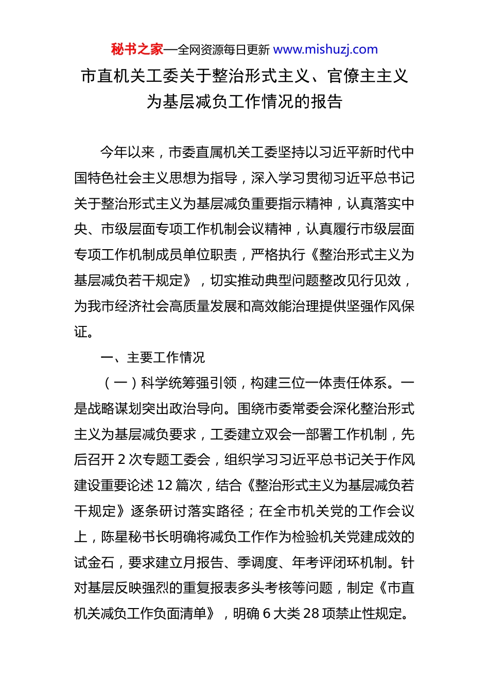 秘书之家—全网资源每日更新 www.mishuzj.com市直机关工委关于整治形式主义、官僚主主义为基层减负工作情况的报告 今年以来,市委直属机关工委坚持以习近平新时代中国特色社会主义思想为指导,深入学习贯彻习近平总书记关于整治形式主义为基层减负重要指示精神,认真落实中央、市级层面专项工作机制会议精神,认真履行市级层面专项工作机制成员单位职责,严格执行《整治形式主义为基层减负若干规定》,切实推动典型问题整改见行见效,为我市经济社会高质量发展和高效能治理提供坚强作风保证。一、主要工作情况(一)科学统筹强引领,构建三位一体责任体系。一是战略谋划突出政治导向。围绕市委常委会深化整治形式主义为基层减负要求,工委建立双会一部署工作机制,先后召开 2 次专题工委会,组织学习习近平总书记关于作风建设重要论述 12 篇次,结合《整治形式主义为基层减负若干规定》逐条研讨落实路径;在全市机关党的工作会议上,陈星秘书长明确将减负工作作为检验机关党建成效的试金石,要求建立月报告、季调度、年考评闭环机制。针对基层反映强烈的重复报表多头考核等问题,制定《市直机关减负工作负面清单》,明确 6 大类 28 项禁止性规定。秘书之家—全网资源每日更新 www.mishuzj.com二是分类督导压实主体责任。创新实施三类三级管理模式,将 83 家市直单位划分为专项机制成员单位( 12家)、重点责任单位(29 家)、一般关联单位(42 家),差异化制定督导方案。对 29 家与基层联系紧密单位实行五个一标准(1 名工委领导包联、1 个专班跟进、1 份问题清单、1 套整改台账、1 次成效评估),累计开展专项督查47 次,约谈整改滞后单位负责人 9 人次。建立新任党组(党委)书记任职谈话制度,将减负工作作为必谈内容,2025 年以来已对 21 名新任书记开展履职谈话。三是学查改贯通促进质效提升。开展三对照三查找专项行动,对照党章党规查找政治站位偏差,对照典型案例查找作风顽疾,对照基层诉求查找服务短板。发现并纠正 27 家单位存在的问题清单泛化整改措施虚化等现象,责令重新查摆问题 183 项。推行双审双签制度,单位自查报告须经机关纪委初审、分管市领导复审,党组织书记和纪委书记联签确认,确保真查实改。(二)多措并举强保障,打造协同联动新格局。一是构建大监督协同机制。联合市纪委监委、市委组织部建立三查三促工作体系,查文风会风促提质增效,查督查考核促规范精简,查履职用权促担当作为。在党纪学习教育回头看中,组织 85 家单位机关纪委开展机关病自查,梳理典型问题 316 个,编发《形式主义变异表现警示录》1200秘书之家—全网资源每日更新 www.mishuzj.com册。建立线索移送机制,2025 年上半年移交作风问题线索23 条,立案查处 4 起。二是创新考核评价体系。将减负成效纳入机关党建考核一票否决指标,实施双降双升改革,定性指标占比从 40%降至 25%,考评频次从半年 1 次减为年度 1 次;同时提升群众满意度权重(占 30%)、增加暗访抽查分值(占 20%)。开发基层减负智慧监测平台,实时采集会议文件、督查检查等数据,生成基层负担指数季度预警报告。三是深化教育培训实效。开设作风建设大讲堂系列课程,构建 3+X 培训体系,3 门必修课(《若干规定》解读、基层减负案例剖析、机关效能提升方法)加 X门选修课(按单位职能定制)。分批次对 192 名党员干部开展实训,组织假如我是基层干部角色互换体验活动 36场。编印《政策实务百问百答》,建立工委委员+业务骨干双导师答疑机制,累计解答政策咨询 427 件次。(三)聚焦难点强纠治,实施靶向攻坚行动。一是工委机关率先破题。开展向自身开刀专项行动,9 个处室查摆文山会海过度留痕等 20 项具体问题,制定 21 条整改措施。大幅精简考核指标,取消工作台账厚度活动照片数量等评价标准,会议纪要篇幅压缩 45%。建立基层观测点 12个,聘请社区工作者、企业办事员等 36 人担任作风监督员。二是重点领域专项治理。针对 21 家涉农、民生部门开展清淤点通堵点行动,市场监管局将 76 项检查事项整合为秘书之家—全网资源每日更新 ww...