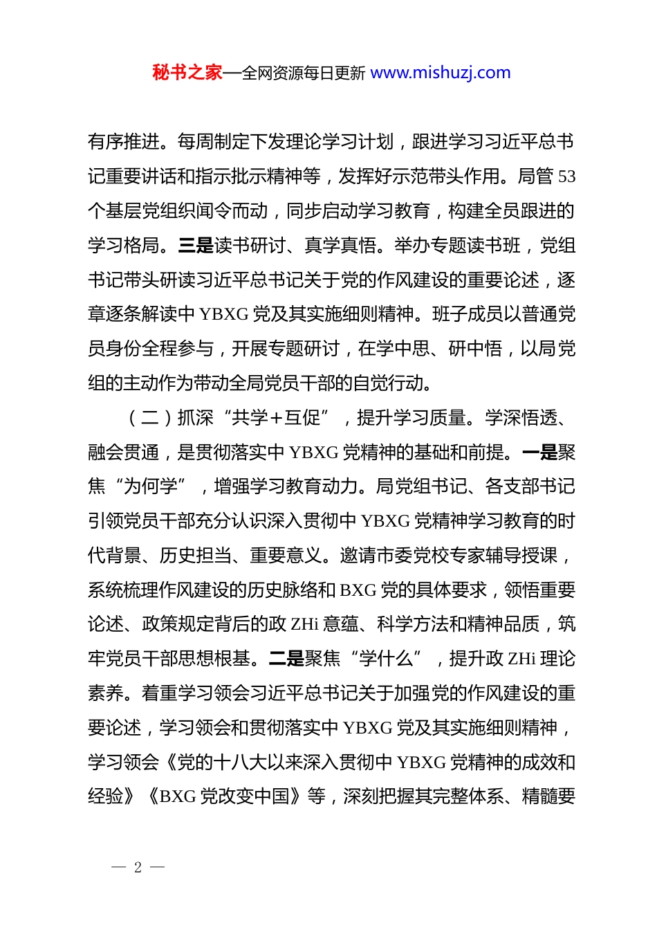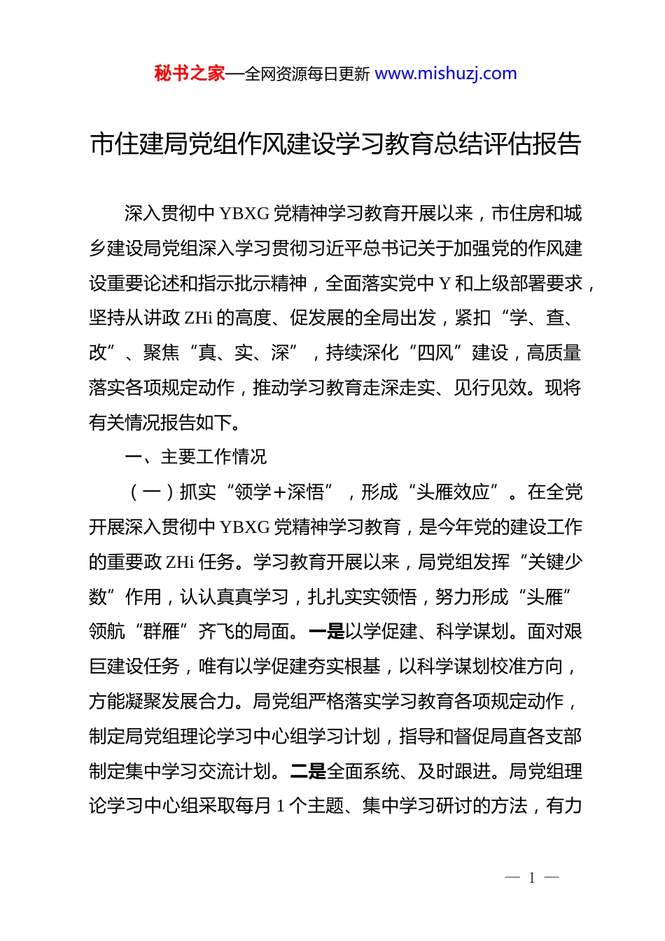 秘书之家—全网资源每日更新 www.mishuzj.com市住建局党组作风建设学习教育总结评估报告深入贯彻中 YBXG 党精神学习教育开展以来,市住房和城乡建设局党组深入学习贯彻习近平总书记关于加强党的作风建设重要论述和指示批示精神,全面落实党中 Y 和上级部署要求,坚持从讲政 ZHi 的高度、促发展的全局出发,紧扣“学、查、改”、聚焦“真、实、深”,持续深化“四风”建设,高质量落实各项规定动作,推动学习教育走深走实、见行见效。现将有关情况报告如下。一、主要工作情况(一)抓实“领学+深悟”,形成“头雁效应”。在全党开展深入贯彻中 YBXG 党精神学习教育,是今年党的建设工作的重要政 ZHi 任务。学习教育开展以来,局党组发挥“关键少数”作用,认认真真学习,扎扎实实领悟,努力形成“头雁”领航“群雁”齐飞的局面。一是以学促建、科学谋划。面对艰巨建设任务,唯有以学促建夯实根基,以科学谋划校准方向,方能凝聚发展合力。局党组严格落实学习教育各项规定动作,制定局党组理论学习中心组学习计划,指导和督促局直各支部制定集中学习交流计划。二是全面系统、及时跟进。局党组理论学习中心组采取每月 1 个主题、集中学习研讨的方法,有力— 1 —秘书之家—全网资源每日更新 www.mishuzj.com有序推进。每周制定下发理论学习计划,跟进学习习近平总书记重要讲话和指示批示精神等,发挥好示范带头作用。局管 53个基层党组织闻令而动,同步启动学习教育,构建全员跟进的学习格局。三是读书研讨、真学真悟。举办专题读书班,党组书记带头研读习近平总书记关于党的作风建设的重要论述,逐章逐条解读中 YBXG 党及其实施细则精神。班子成员以普通党员身份全程参与,开展专题研讨,在学中思、研中悟,以局党组的主动作为带动全局党员干部的自觉行动。(二)抓深“共学+互促”,提升学习质量。学深悟透、融会贯通,是贯彻落实中 YBXG 党精神的基础和前提。一是聚焦“为何学”,增强学习教育动力。局党组书记、各支部书记引领党员干部充分认识深入贯彻中 YBXG 党精神学习教育的时代背景、历史担当、重要意义。邀请市委党校专家辅导授课,系统梳理作风建设的历史脉络和 BXG 党的具体要求,领悟重要论述、政策规定背后的政 ZHi 意蕴、科学方法和精神品质,筑牢党员干部思想根基。二是聚焦“学什么”,提升政 ZHi 理论素养。着重学习领会习近平总书记关于加强党的作风建设的重要论述,学习领会和贯彻落实中 YBXG 党及其实施细则精神,学习领会《党的十八大以来深入贯彻中 YBXG 党精神的成效和经验》《BXG 党改变中国》等,深刻把握其完整体系、精髓要— 2 —秘书之家—全网资源每日更新 www.mishuzj.com义,提高党员干部理论水平。三是聚焦“如何学”,保证学习教育效果。通过支部书记领学、读书班研学、“三会一课”常学、研讨交流互学等方式,开展“学 BXG 党精神、强作风能力建设”大讨论。针对流动党员、离退休党员等群体,采取“送学上门”“云端课堂”等形式组织学习,促进互学共升。局学习教育工作专班定期对局直单位、企业、协会党支部学习教育开展情况进行督导检查,推动学教落到实处。(三)抓严“查改+笃行”,推动长效长 ZHi。全面查摆、集中整 ZHi,推进长效常 ZHi,实现正本清源,是深入贯彻中YBXG 党精神学习教育的关键和目的。一是全面系统查,找准问题症结。全局党员干部采取自己查、组织点、同事提、上级帮等方法,对照 2 个问题清单逐项查摆问题,列出问题清单,全面检视自身存在的与中 YBXG 党精神相违背的腐败苗头和潜藏风险,深入查摆隐形变异的“四风”问题和发生在群众身边的“微腐败”现象。二是靶向发力改,化解风险隐患。坚持问题导向,围绕漠视群众诉求、检查“过度留痕”、作风纪律松散等突出问题,开展清查整 ZHi,健全完善配套制度,推动标本兼 ZHi。紧盯关键少数,梳理廉政风险防控主要事项清单,督促指导代建中心研究制定三批 30 余项制度、市住房保障和房地产业发展中心制定完善 16 项制度、印发 5 项规范性文件、市— 3 —秘书之家—全网资源每日更新 www.mishuzj.com建设科技和人才...