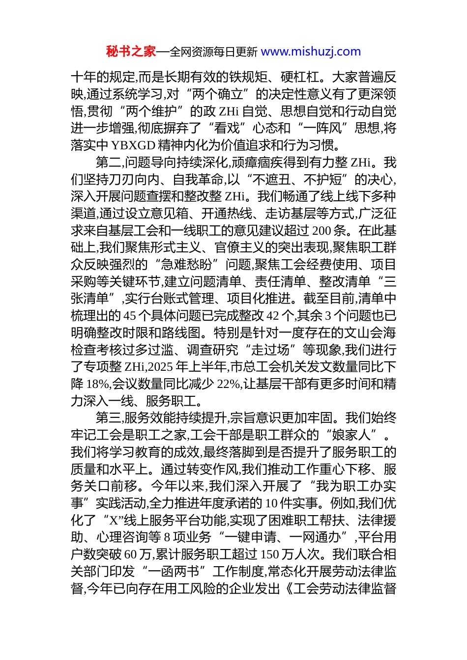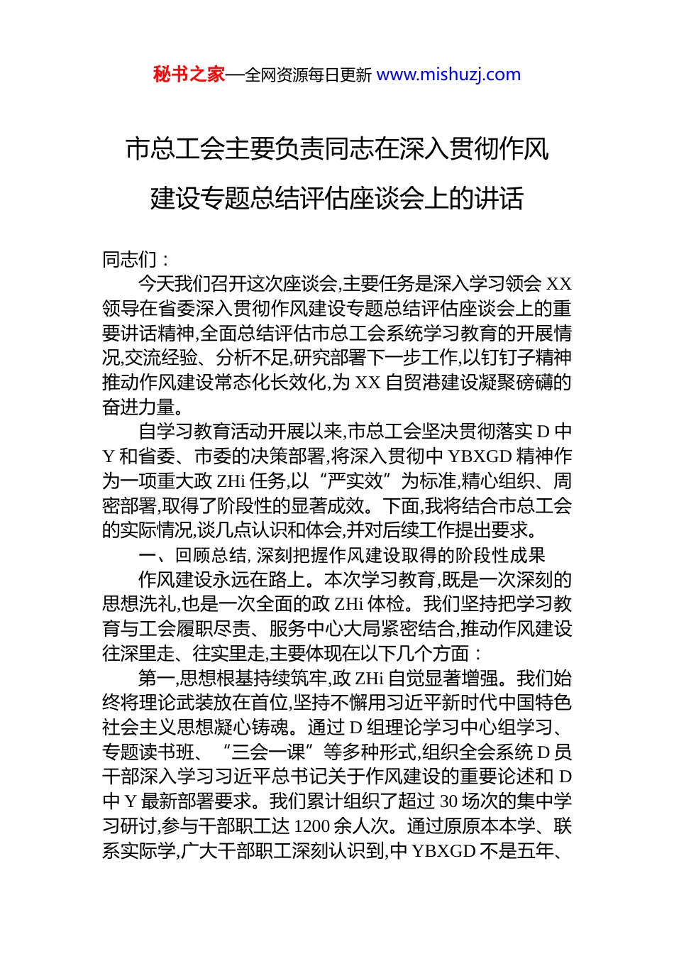 秘书之家—全网资源每日更新 www.mishuzj.com市总工会主要负责同志在深入贯彻作风建设专题总结评估座谈会上的讲话同志们:今天我们召开这次座谈会,主要任务是深入学习领会 XX领导在省委深入贯彻作风建设专题总结评估座谈会上的重要讲话精神,全面总结评估市总工会系统学习教育的开展情况,交流经验、分析不足,研究部署下一步工作,以钉钉子精神推动作风建设常态化长效化,为 XX 自贸港建设凝聚磅礴的奋进力量。自学习教育活动开展以来,市总工会坚决贯彻落实 D 中Y 和省委、市委的决策部署,将深入贯彻中 YBXGD 精神作为一项重大政 ZHi 任务,以“严实效”为标准,精心组织、周密部署,取得了阶段性的显著成效。下面,我将结合市总工会的实际情况,谈几点认识和体会,并对后续工作提出要求。一、回顾总结,深刻把握作风建设取得的阶段性成果作风建设永远在路上。本次学习教育,既是一次深刻的思想洗礼,也是一次全面的政 ZHi 体检。我们坚持把学习教育与工会履职尽责、服务中心大局紧密结合,推动作风建设往深里走、往实里走,主要体现在以下几个方面:第一,思想根基持续筑牢,政 ZHi 自觉显著增强。我们始终将理论武装放在首位,坚持不懈用习近平新时代中国特色社会主义思想凝心铸魂。通过 D 组理论学习中心组学习、专题读书班、“三会一课”等多种形式,组织全会系统 D 员干部深入学习习近平总书记关于作风建设的重要论述和 D中 Y 最新部署要求。我们累计组织了超过 30 场次的集中学习研讨,参与干部职工达 1200 余人次。通过原原本本学、联系实际学,广大干部职工深刻认识到,中 YBXGD 不是五年、秘书之家—全网资源每日更新 www.mishuzj.com十年的规定,而是长期有效的铁规矩、硬杠杠。大家普遍反映,通过系统学习,对“两个确立”的决定性意义有了更深领悟,贯彻“两个维护”的政 ZHi 自觉、思想自觉和行动自觉进一步增强,彻底摒弃了“看戏”心态和“一阵风”思想,将落实中 YBXGD 精神内化为价值追求和行为习惯。第二,问题导向持续深化,顽瘴痼疾得到有力整 ZHi。我们坚持刀刃向内、自我革命,以“不遮丑、不护短”的决心,深入开展问题查摆和整改整 ZHi。我们畅通了线上线下多种渠道,通过设立意见箱、开通热线、走访基层等方式,广泛征求来自基层工会和一线职工的意见建议超过 200 条。在此基础上,我们聚焦形式主义、官僚主义的突出表现,聚焦职工群众反映强烈的“急难愁盼”问题,聚焦工会经费使用、项目采购等关键环节,建立问题清单、责任清单、整改清单“三张清单”,实行台账式管理、项目化推进。截至目前,清单中梳理出的 45 个具体问题已完成整改 42 个,其余 3 个问题也已明确整改时限和路线图。特别是针对一度存在的文山会海检查考核过多过滥、调查研究“走过场”等现象,我们进行了专项整 ZHi,2025 年上半年,市总工会机关发文数量同比下降 18%,会议数量同比减少 22%,让基层干部有更多时间和精力深入一线、服务职工。第三,服务效能持续提升,宗旨意识更加牢固。我们始终牢记工会是职工之家,工会干部是职工群众的“娘家人”。我们将学习教育的成效,最终落脚到是否提升了服务职工的质量和水平上。通过转变作风,我们推动工作重心下移、服务关口前移。今年以来,我们深入开展了“我为职工办实事”实践活动,全力推进年度承诺的 10 件实事。例如,我们优化了“X”线上服务平台功能,实现了困难职工帮扶、法律援助、心理咨询等 8 项业务“一键申请、一网通办”,平台用户数突破 60 万,累计服务职工超过 150 万人次。我们联合相关部门印发“一函两书”工作制度,常态化开展劳动法律监督,今年已向存在用工风险的企业发出《工会劳动法律监督秘书之家—全网资源每日更新 www.mishuzj.com提示函》15 份,成功调解劳动争议案件 58 起,涉及金额超过300 万元,切实维护了职工合法权益。这些看得见、摸得着的举措,让广大职工切身感受到了作风转变带来的新变化、新气象,D 同人民群众的血肉联系在工会这个桥梁上得到了进一步巩固。第四,制度笼子持续扎紧,长效机制初步构建。我们深刻认识到,作风问题具有顽固性和反复性,必须依靠制度管长远。我们坚持“当下改”与“长久...