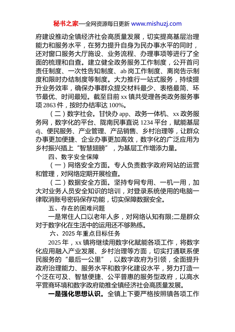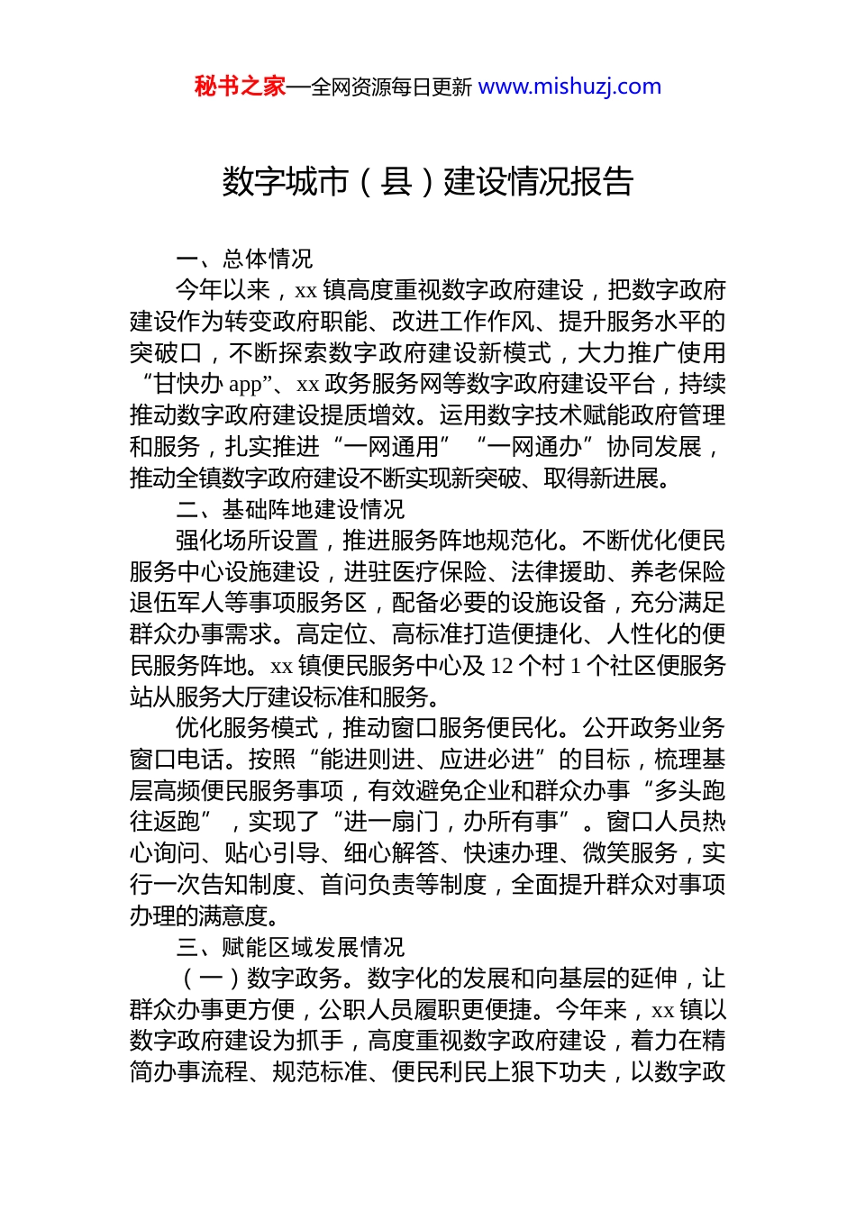 秘书之家—全网资源每日更新 www.mishuzj.com数字城市(县)建设情况报告一、总体情况今年以来,xx 镇高度重视数字政府建设,把数字政府建设作为转变政府职能、改进工作作风、提升服务水平的突破口,不断探索数字政府建设新模式,大力推广使用“甘快办 app”、xx 政务服务网等数字政府建设平台,持续推动数字政府建设提质增效。运用数字技术赋能政府管理和服务,扎实推进“一网通用”“一网通办”协同发展,推动全镇数字政府建设不断实现新突破、取得新进展。二、基础阵地建设情况强化场所设置,推进服务阵地规范化。不断优化便民服务中心设施建设,进驻医疗保险、法律援助、养老保险退伍军人等事项服务区,配备必要的设施设备,充分满足群众办事需求。高定位、高标准打造便捷化、人性化的便民服务阵地。xx 镇便民服务中心及 12 个村 1 个社区便服务站从服务大厅建设标准和服务。优化服务模式,推动窗口服务便民化。公开政务业务窗口电话。按照“能进则进、应进必进”的目标,梳理基层高频便民服务事项,有效避免企业和群众办事“多头跑往返跑”,实现了“进一扇门,办所有事”。窗口人员热心询问、贴心引导、细心解答、快速办理、微笑服务,实行一次告知制度、首问负责等制度,全面提升群众对事项办理的满意度。三、赋能区域发展情况(一)数字政务。数字化的发展和向基层的延伸,让群众办事更方便,公职人员履职更便捷。今年来,xx 镇以数字政府建设为抓手,高度重视数字政府建设,着力在精简办事流程、规范标准、便民利民上狠下功夫,以数字政秘书之家—全网资源每日更新 www.mishuzj.com府建设推动全镇经济社会高质量发展,切实提高基层治理能力和服务水平,在努力提升自身为民办事水平的同时,还对窗口服务大厅施设、业务流程、办理事项等进行了全面的梳理和自查。建立健全政务服务工作制度,公开首问责任制度、一次性告知制度、ab 岗工作制度、离岗告示制度和限时办结制度等制度。大力推行一站式服务,持续提升业务效率,确保办事群众提交材料最少、表格最简、环节最优、时间最短。截至目前 xx 镇共受理各类政务服务事项 2863 件,按时办结率达 100%。(二)数字社会。甘快办 app、政务一体机、xx 政务服务网,数字化的平台、陇南民事直说 1234 平台,赋能基层dj、便民服务、产业管理、产品销售、乡村治理等,让群众办事更加便捷、企业办事更加高效,数字化的广泛应用为乡村振兴插上“智慧翅膀”,为基层工作增添力量。四、数字安全保障(一)网络安全方面。专人负责数字政府网站的运营和管理,对网络定期开展检查。(二)数据安全方面。坚持专网专用、一机一用,加大对业务人员安全知识的培训,对登录系统使用的电脑一律取消账号密码保存功能,切实保障数据安全。五、存在的困难问题一是常住人口以老年人多,对网络认知有限;二是群众对于数字化在生活中的运用还不够熟练。 六、2025 年重点目标任务2025 年,xx 镇将继续用数字化赋能各项工作,将数字化应用融入产业发展、乡村治理等方面,切实打通联系便民服务的“最后一公里”,以数字政府为引领,全面提升政府治理能力、服务水平和数字化建设水平,努力打造一个泛在可及、智慧便捷、公平普惠的服务型政府,以高水平营商环境和数字政府助推全镇经济社会高质量发展。一是强化思想认识。全镇上下要严格按照镇各项工作秘书之家—全网资源每日更新 www.mishuzj.com部署要求,认真抓好“高效办成一件事”和数字政府政务服务能力提升,在便民服务上再加力,在数字政府各项指标上细化工作举措、强化责任落实,全力抓好数字政府服务能力各项指标提升。二是聚焦工作重点。要结合实际优化办事流程,明确事项清单、办理流程等,要继续推广自助服务终端一体机和“甘快办”app 的推广,通过线上线下多种宣传方式,引导办事群众熟悉、使用自助服务终端一体机和“甘快办”app,推行事项网上办、掌上办,提高自助服务终端一体机和“甘快办”app 的使用率,同时继续加强业务人员培训指导,优化业务水平和服务水平,增强群众办事体验感。三是强化责任落实。切实转变工作作风,确保每一项工作都有人抓、有人管、有...