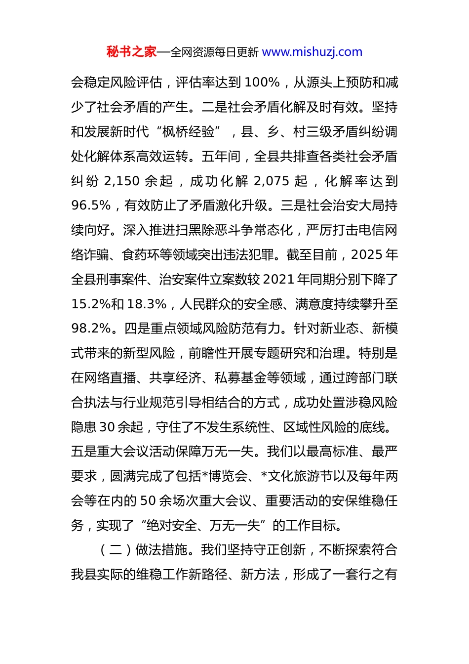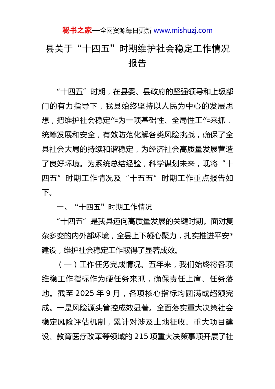 秘书之家—全网资源每日更新 www.mishuzj.com县关于“十四五”时期维护社会稳定工作情况报告 “十四五”时期,在县委、县政府的坚强领导和上级部门的有力指导下,我县始终坚持以人民为中心的发展思想,把维护社会稳定作为一项基础性、全局性工作来抓,统筹发展和安全,有效防范化解各类风险挑战,确保了全县社会大局的持续和谐稳定,为经济社会高质量发展营造了良好环境。为系统总结经验,科学谋划未来,现将“十四五”时期工作情况及“十五五”时期工作重点报告如下。一、“十四五”时期工作情况“十四五”是我县迈向高质量发展的关键时期。面对复杂多变的内外部环境,全县上下凝心聚力,扎实推进平安*建设,维护社会稳定工作取得了显著成效。(一)工作任务完成情况。五年来,我们始终将各项维稳工作指标作为硬任务来抓,确保责任上肩、任务落地。截至 2025 年 9 月,各项核心指标均圆满或超额完成。一是风险源头管控成效显著。全面落实重大决策社会稳定风险评估机制,累计对涉及土地征收、重大项目建设、教育医疗改革等领域的 215 项重大决策事项开展了社秘书之家—全网资源每日更新 www.mishuzj.com会稳定风险评估,评估率达到 100%,从源头上预防和减少了社会矛盾的产生。二是社会矛盾化解及时有效。坚持和发展新时代“枫桥经验”,县、乡、村三级矛盾纠纷调处化解体系高效运转。五年间,全县共排查各类社会矛盾纠 纷 2,150 余 起 , 成 功 化 解 2,075 起 , 化 解 率 达 到96.5%,有效防止了矛盾激化升级。三是社会治安大局持续向好。深入推进扫黑除恶斗争常态化,严厉打击电信网络诈骗、食药环等领域突出违法犯罪。截至目前,2025 年全县刑事案件、治安案件立案数较 2021 年同期分别下降了15.2%和 18.3%,人民群众的安全感、满意度持续攀升至98.2%。四是重点领域风险防范有力。针对新业态、新模式带来的新型风险,前瞻性开展专题研究和治理。特别是在网络直播、共享经济、私募基金等领域,通过跨部门联合执法与行业规范引导相结合的方式,成功处置涉稳风险隐患 30 余起,守住了不发生系统性、区域性风险的底线。五是重大会议活动保障万无一失。我们以最高标准、最严要求,圆满完成了包括*博览会、*文化旅游节以及每年两会等在内的 50 余场次重大会议、重要活动的安保维稳任务,实现了“绝对安全、万无一失”的工作目标。(二)做法措施。我们坚持守正创新,不断探索符合我县实际的维稳工作新路径、新方法,形成了一套行之有秘书之家—全网资源每日更新 www.mishuzj.com效的组合拳。一是坚持源头防范,筑牢稳定第一道防线。我们深刻认识到“抓前端、治未病”是维稳工作的治本之策。在严格执行重大决策社会稳定风险评估制度的基础上,我们还将评估关口进一步前移,要求项目规划阶段即引入评估机制,并将评估结果作为项目审批的前置条件。同时,密切政法机关与发改、自然资源、住建等行业部门的协作,建立风险信息共享和会商研判机制,推动风险防范从被动应对向主动塑造转变。二是聚焦系统治理,构建协同联动新格局。为破解“九龙治水”难题,自 2024 年县委社会工作部组建以来,我们迅速构建了党建引领下的“纵向贯通、横向融合”社会治理体系。纵向打通县、乡(镇)、村(社区)三级指挥链条,确保指令畅通、力量下沉。横向成立放权赋能、减负增效、物业治理、民生服务、警地融合、智慧治理、新兴领域党建七个专项工作组,矩阵式管理、项目化推进,有效整合了全县的治理资源,形成了强大工作合力。三是紧盯新兴领域,前瞻应对新型风险。新产业、新业态在激发经济活力的同时,也带来了新的稳定风险。我们联合市场监管、金融、人社等部门,建立了新兴领域风险监测预警机制,对网络借贷、虚拟货币、直播带货等领域开展常态化风险排查。同时,通过“新兴领域党建组”的工作,对全县 1869 个非公有制企秘书之家—全网资源每日更新 www.mishuzj.com业和社会组织进行全面摸排,以党建引领行业自律和规范发展,从组织层面增强了抵御风险的能力。四是强化机制建设,提升监测预警实战能力。我们坚持实战化要求,大力推进社会稳定风险监测预...