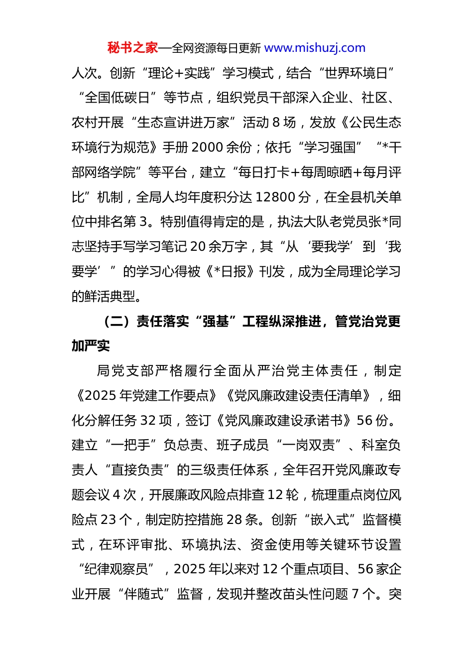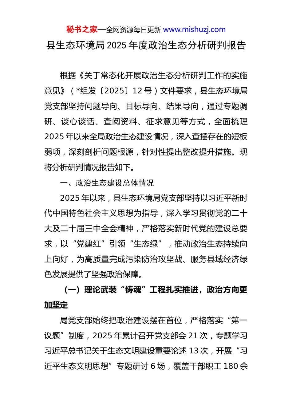 秘书之家—全网资源每日更新 www.mishuzj.com县生态环境局 2025 年度政治生态分析研判报告 根据《关于常态化开展政治生态分析研判工作的实施意见》(*组发〔2025〕12 号)文件要求,县生态环境局党支部坚持问题导向、目标导向、结果导向,通过专题调研、谈心谈话、查阅资料、征求意见等方式,全面梳理2025 年以来全局政治生态建设情况,深入查摆存在的短板弱项,深刻剖析问题根源,针对性提出整改提升措施。现将分析研判情况报告如下。一、政治生态建设总体情况2025 年以来,县生态环境局党支部坚持以习近平新时代中国特色社会主义思想为指导,深入学习贯彻党的二十大及二十届三中全会精神,严格落实新时代党的建设总要求,以“党建红”引领“生态绿”,推动政治生态持续向上向好,为高质量完成污染防治攻坚战、服务县域经济绿色发展提供了坚强政治保障。(一)理论武装“铸魂”工程扎实推进,政治方向更加坚定局党支部始终把政治建设摆在首位,严格落实“第一议题”制度,2025 年累计召开党支部会 21 次,专题学习习近平总书记关于生态文明建设重要论述 13 次,开展“习近平生态文明思想”专题研讨 6 场,覆盖干部职工 180 余秘书之家—全网资源每日更新 www.mishuzj.com人次。创新“理论+实践”学习模式,结合“世界环境日”“全国低碳日”等节点,组织党员干部深入企业、社区、农村开展“生态宣讲进万家”活动 8 场,发放《公民生态环境行为规范》手册 2000 余份;依托“学习强国”“*干部网络学院”等平台,建立“每日打卡+每周晾晒+每月评比”机制,全局人均年度积分达 12800 分,在全县机关单位中排名第 3。特别值得肯定的是,执法大队老党员张*同志坚持手写学习笔记 20 余万字,其“从‘要我学’到‘我要学’”的学习心得被《*日报》刊发,成为全局理论学习的鲜活典型。(二)责任落实“强基”工程纵深推进,管党治党更加严实局党支部严格 履行全面从严治党主体责任,制定《2025 年党建工作要点》《党风廉政建设责任清单》,细化分解任务 32 项,签订《党风廉政建设承诺书》56 份。建立“一把手”负总责、班子成员“一岗双责”、科室负责人“直接负责”的三级责任体系,全年召开党风廉政专题会议 4 次,开展廉政风险点排查 12 轮,梳理重点岗位风险点 23 个,制定防控措施 28 条。创新“嵌入式”监督模式,在环评审批、环境执法、资金使用等关键环节设置“纪律观察员”,2025 年以来对 12 个重点项目、56 家企业开展“伴随式”监督,发现并整改苗头性问题 7 个。突秘书之家—全网资源每日更新 www.mishuzj.com出“以案促改”,组织观看《围猎·行贿者说》《生态环保领域违纪违法警示录》等专题片 4 场,开展“以案说纪”微课堂 6 次,干部职工纪律意识、规矩意识显著增强。(三)队伍建设“提质”工程成效凸显,担当作为更加彰显坚持“选育管用”全链条培养干部,2025 年通过“岗位大练兵”“技能大比武”活动选拔业务骨干 12 名,其中3 人入选市生态环境系统“青年尖兵库”;选派 5 名年轻干部到省厅跟班学习、3 名干部到乡镇环保所锻炼,干部队伍“梯队结构”进一步优化。聚焦“急难险重”任务,在夏季臭氧污染防治、秋冬季秸秆禁烧、中央生态环保督察反馈问题整改等工作中,成立“党员突击队”7 支,设立“党员先锋岗”15 个,党员干部连续奋战 60 余天,推动解决群众反映强烈的异味扰民、黑臭水体等问题 28 个,相关事迹被《中国环境报》报道 2 次。2025 年全局共有 12 人次获县级以上表彰,其中执法大队被评为“全省生态环境保护先进集体”,1 名干部获“*县最美公务员”称号。(四)作风建设“清朗”工程持续深化,政治文化更加清明严格执行中央八项规定及其实施细则精神,2025 年全局“三公”经费支出同比下降 18%,会议文件数量同比减少 25%。大力整治“庸懒散慢拖”问题,开展“作风建设秘书之家—全网资源每日更新 www.mishuzj.com提升月”活动,建立“周督查、月通报、季考评”机制,通报迟到早退、脱岗串岗等问题 12 起,批评教育 15 人次。弘扬“严真细实快”工作作风,在环评...